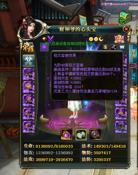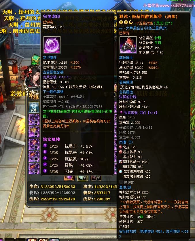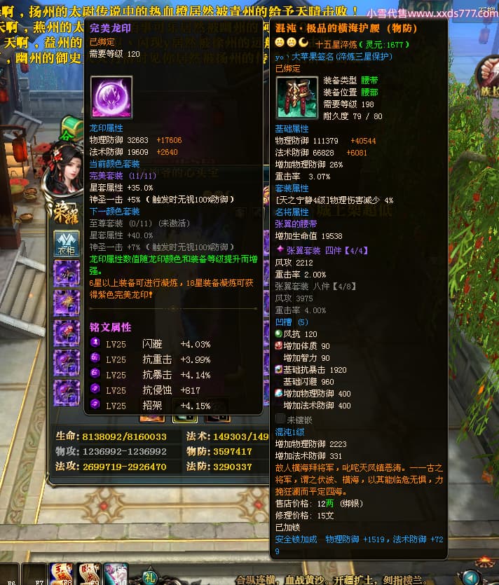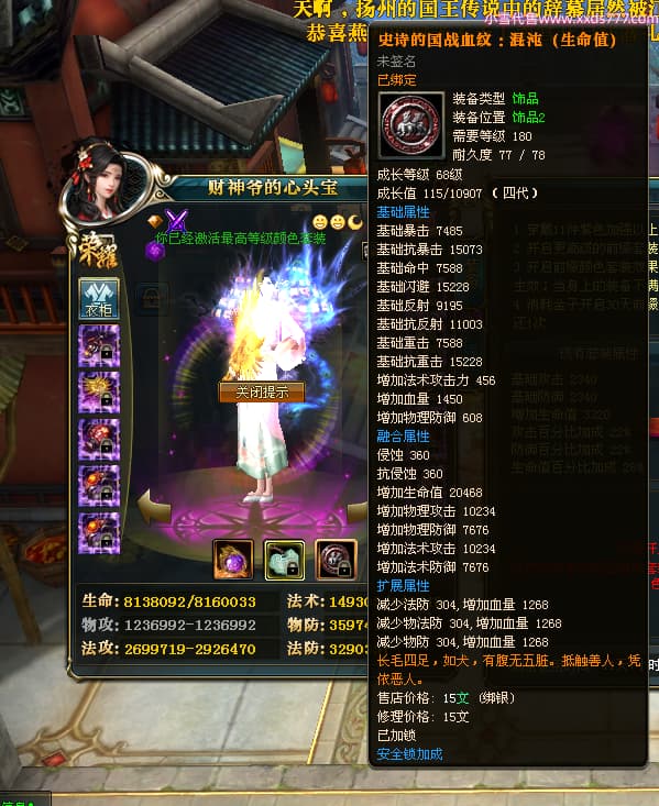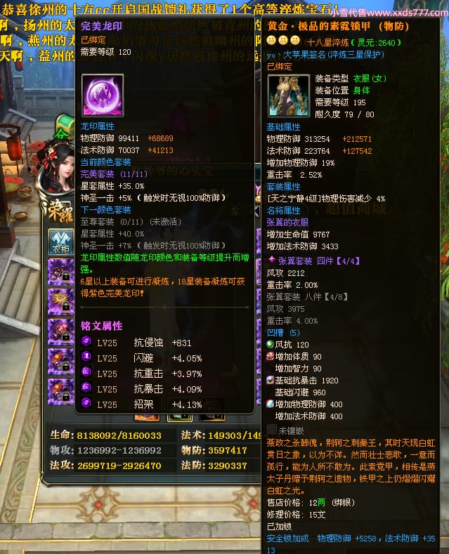 编号L23812 财神爷的心头宝 龙战王者 幽州 世界排名32名 7285W战力 人物黄金极品橙15X(4件18X9件混沌) 马黄金极品橙12X 人物紫龙印 马绿龙印 六等单双属性石头 已开完永久15星套 有1个星特权 可以转移百分百安全