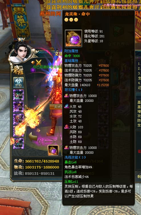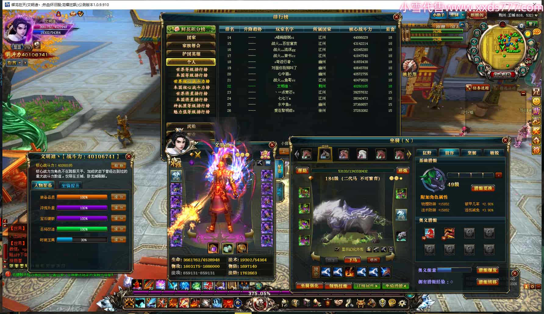 编号Y23813 文明迪丶 龙耀狂飙 荆州 世界排名22名 4021W战力 人物混沌极品橙18X 马黄金加强橙13X 人物紫龙印 马绿龙印 六等单双属性石头 已开6次永久18星套 可以转移百分百安全