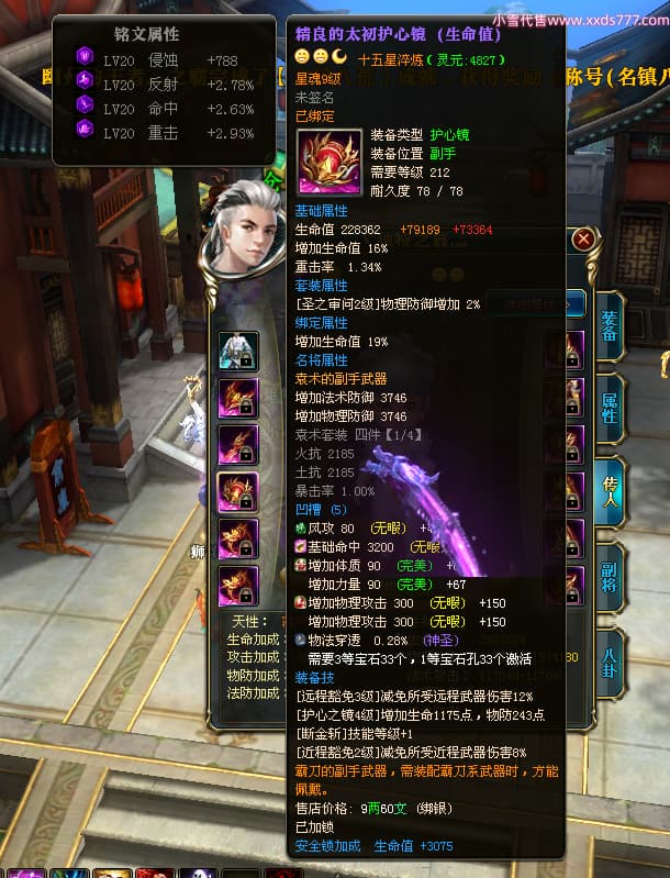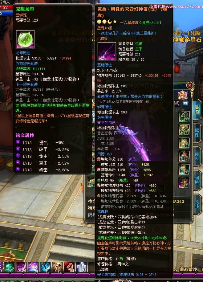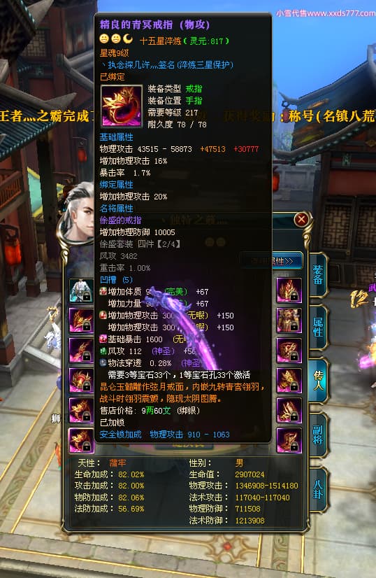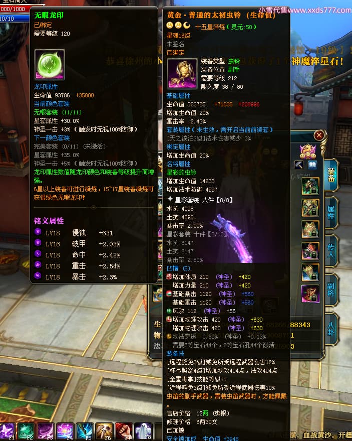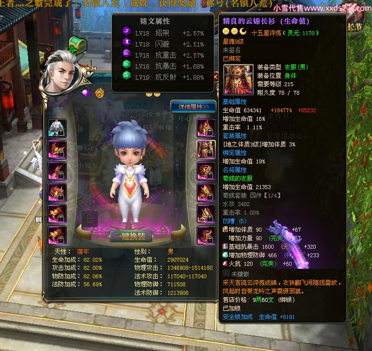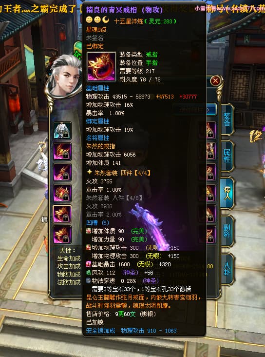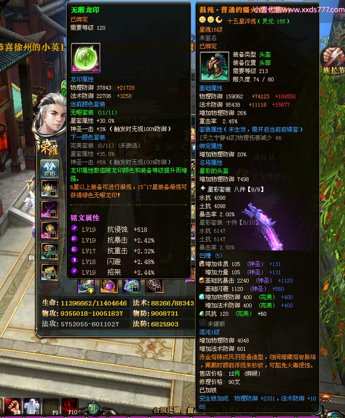 编号W23826 丶执念深几许灬 龙舞九州 幽州 本国排名57名 13366W战力 人物黄金普通橙12X(10件15X3件混沌) 传人精良紫12X 副将精良紫12X 马史诗紫12X 精良紫14披风 人物星魂16级 传人星魂7级 副将星魂6级 马星魂12级 人物铭刻15级 点亮5件16星其余14星 马铭刻12级 点亮12星 人物绿龙印 马黄龙印 五六等单双属性神圣完美无瑕石头 蓝黄孔 已开完永久15星套
