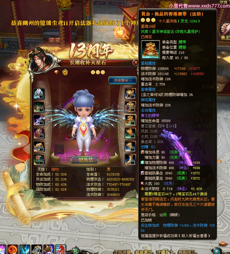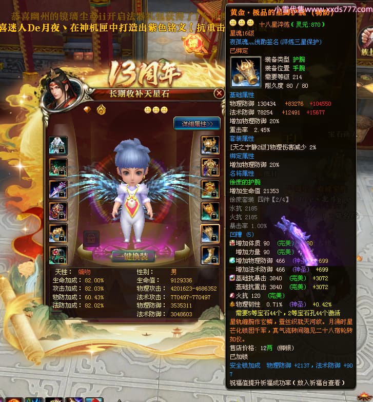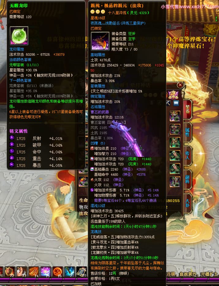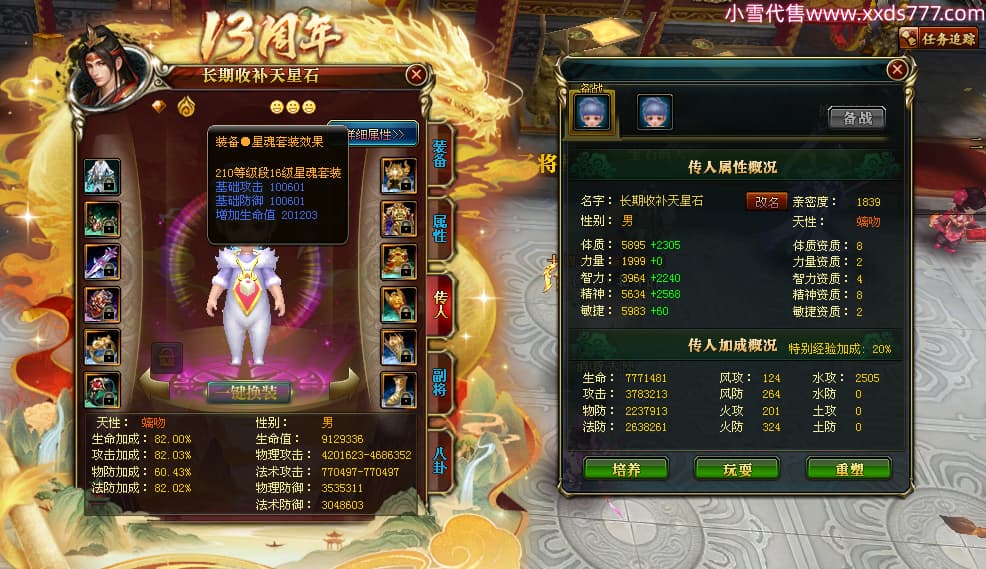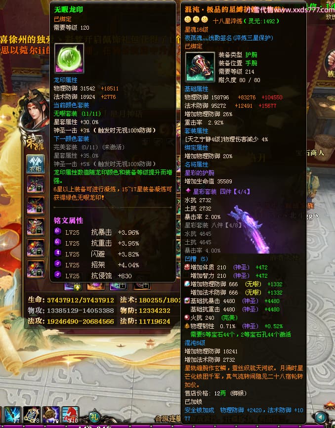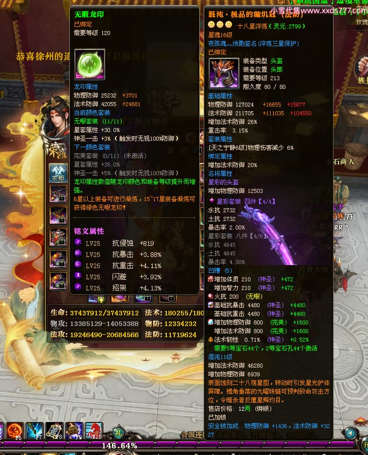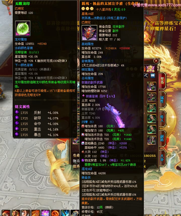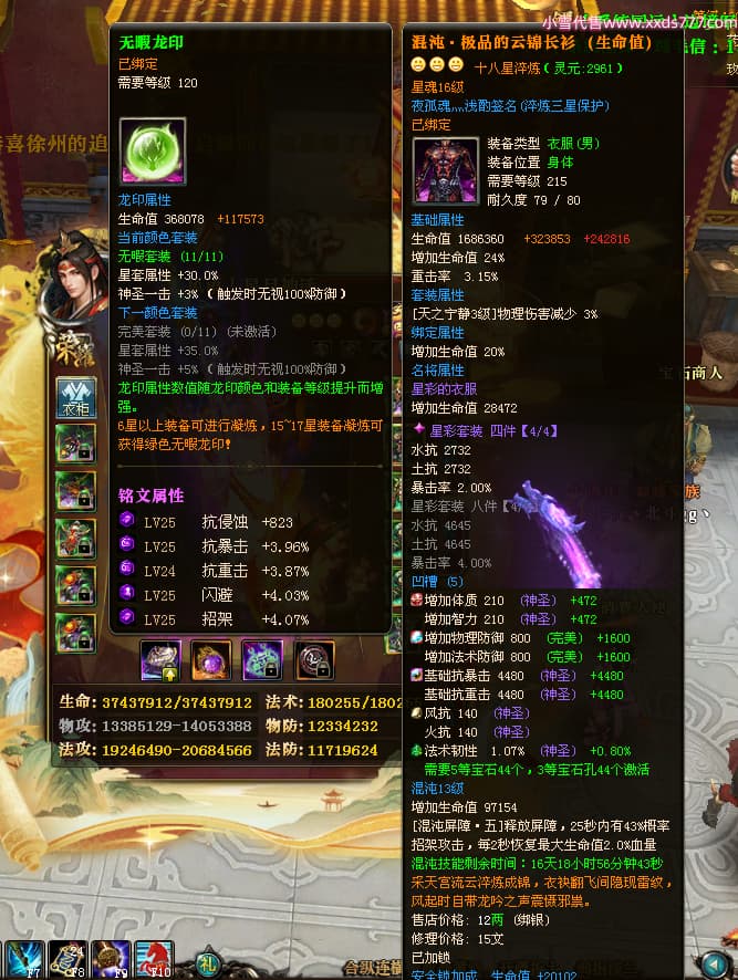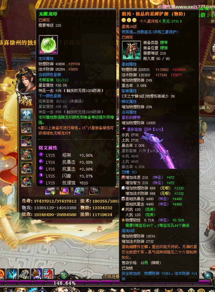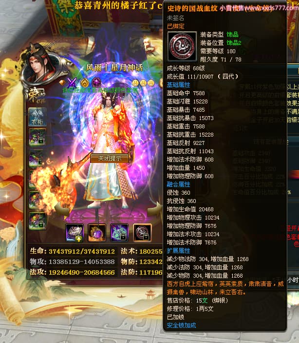 编号T23832 风雨丨星月神话 龙腾问鼎 荆州 世界排名33名 35992W战力 人物混沌极品橙18X 传人黄金极品橙18X(3件混沌) 马黄金极品橙13X(双潜能50级47级) 极品紫16披风 人物星魂16X 传人星魂16级 副将星魂7级 马星魂16级 人物铭刻18级 点亮5件18星其余16星 马铭刻15级 点亮14星 人物绿龙印 马绿龙印 六等单双属性神圣石头 绿紫孔 可以转移百分百安全