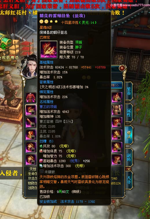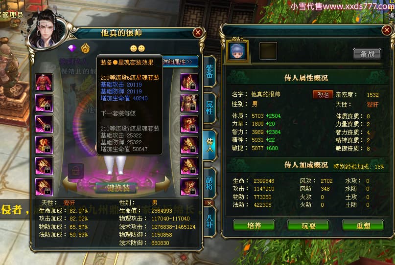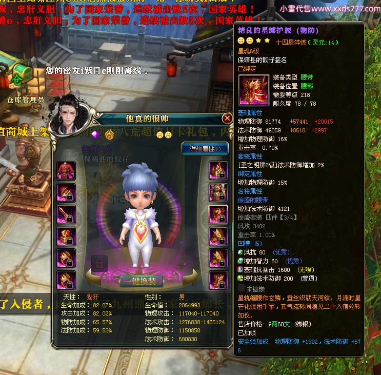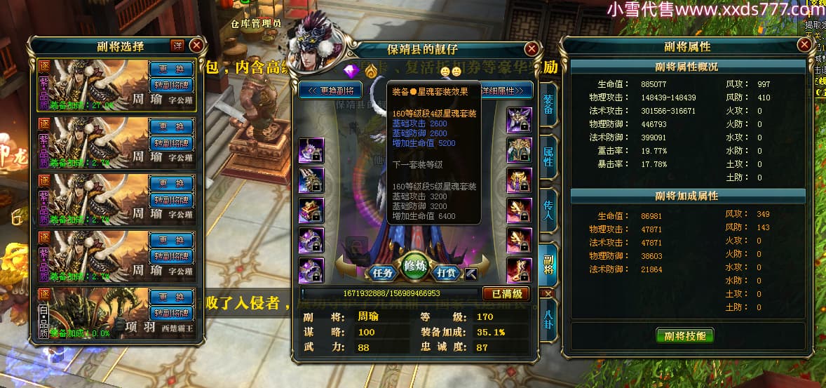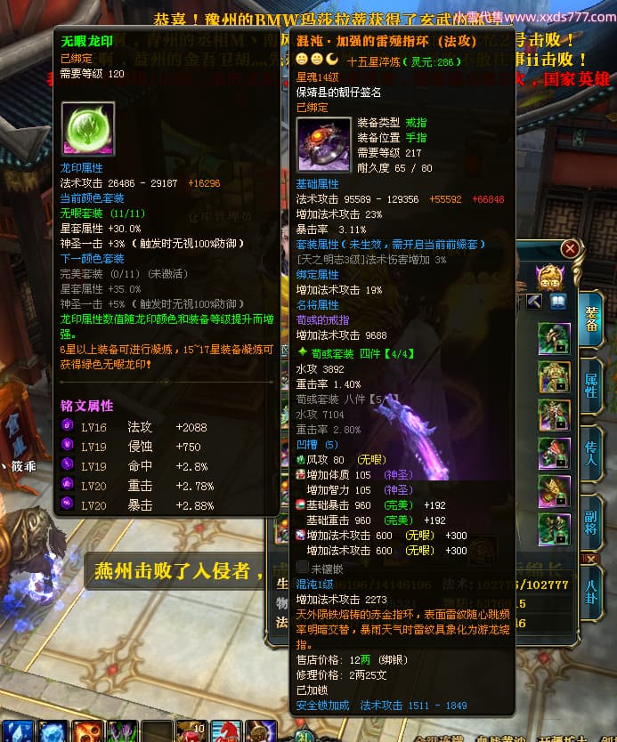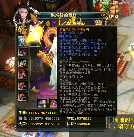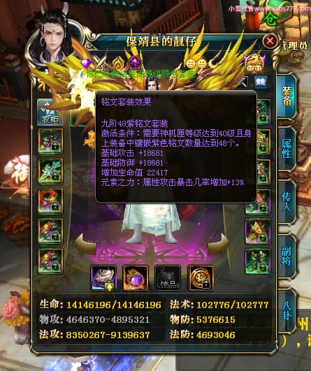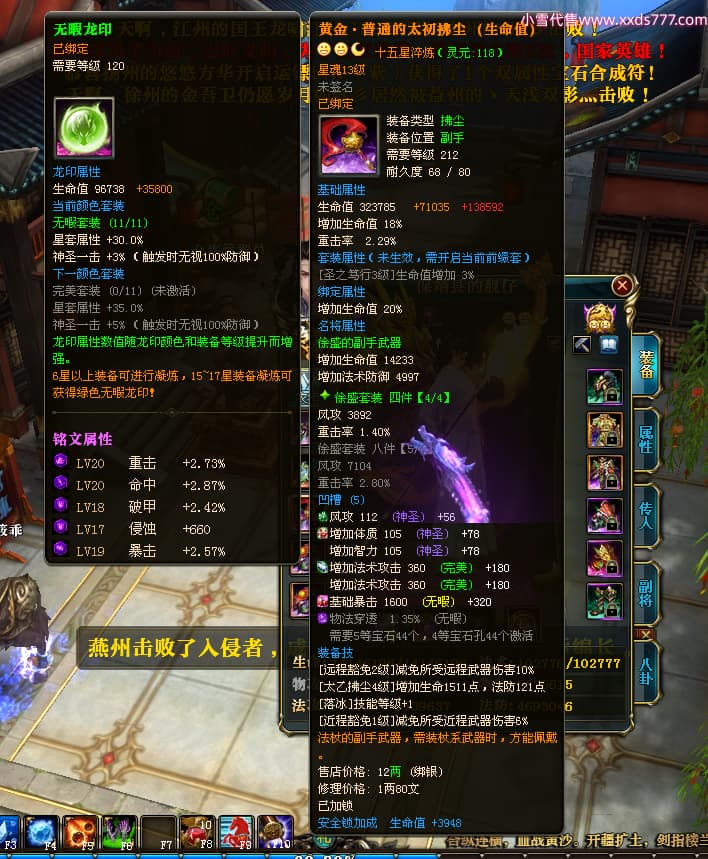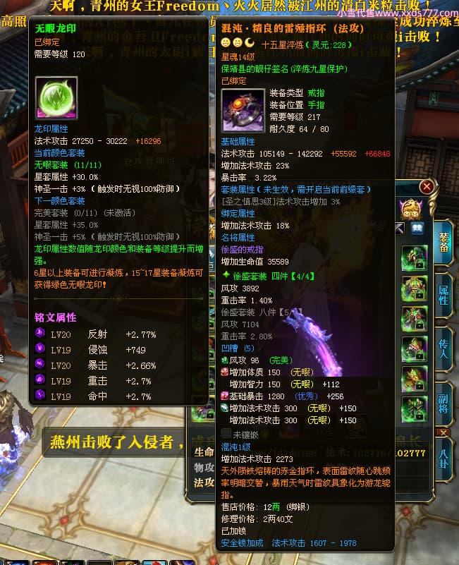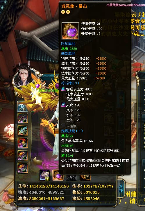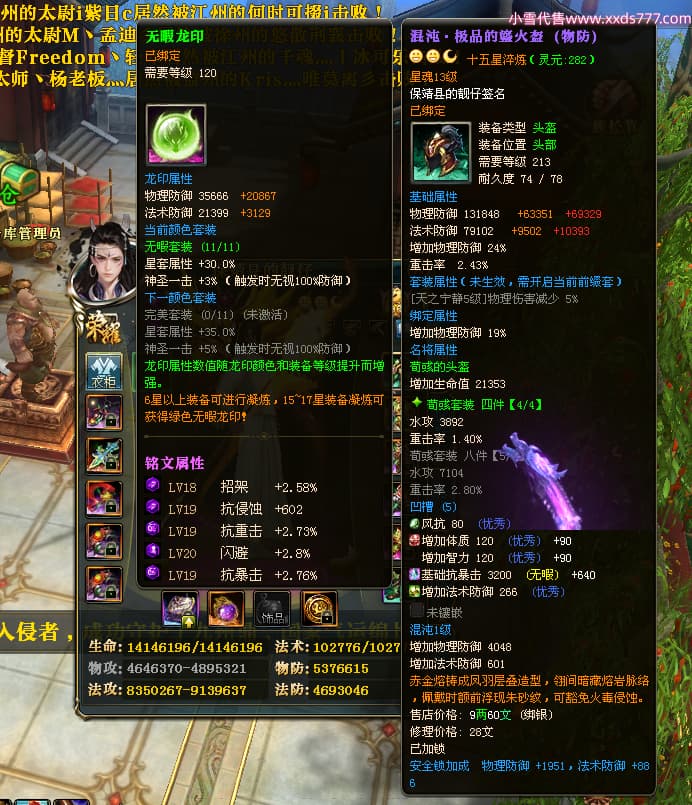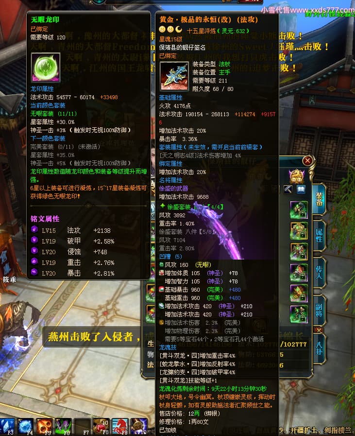 编号X23846 保靖县的靓仔 龙啸风云 荆州 本国排名88名 11440W战力 人物黄金极品紫15X(7件混沌) 传人精良紫12X(2件15X) 副将加强紫12X 马极品紫9X 精良紫13披风 人物星魂13级 传人星魂6级 副将星魂4级 马星魂6级 人物铭刻7件15级其余14级 人物点亮3件16星其余14星 马铭刻12级 点亮10星 人物绿龙印 马蓝龙印(1件黄龙印) 五六等单双属性神圣完美优秀石头 蓝白孔