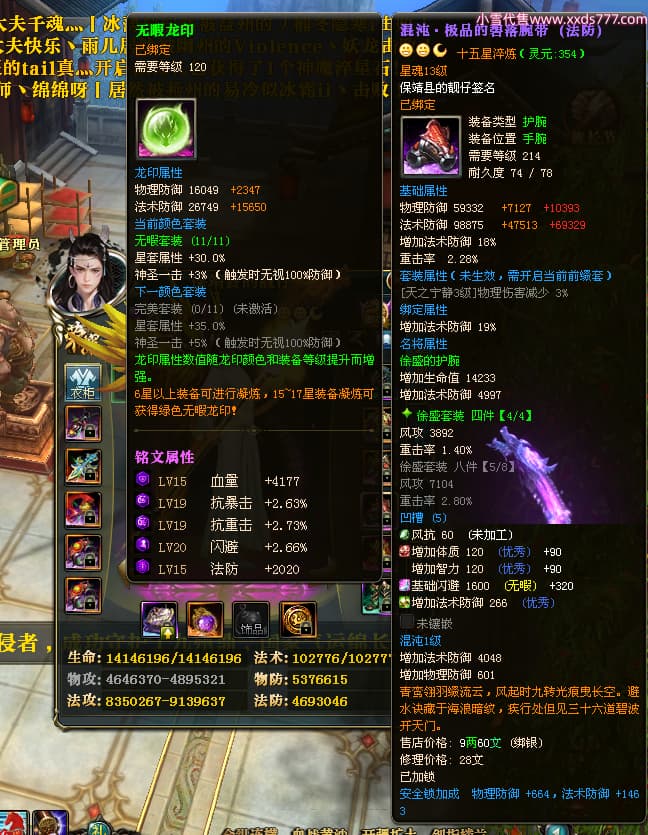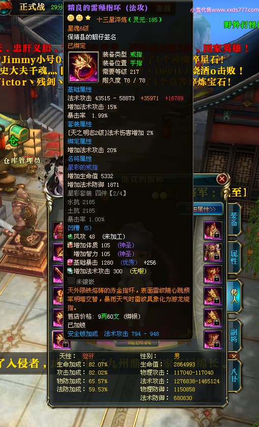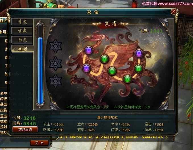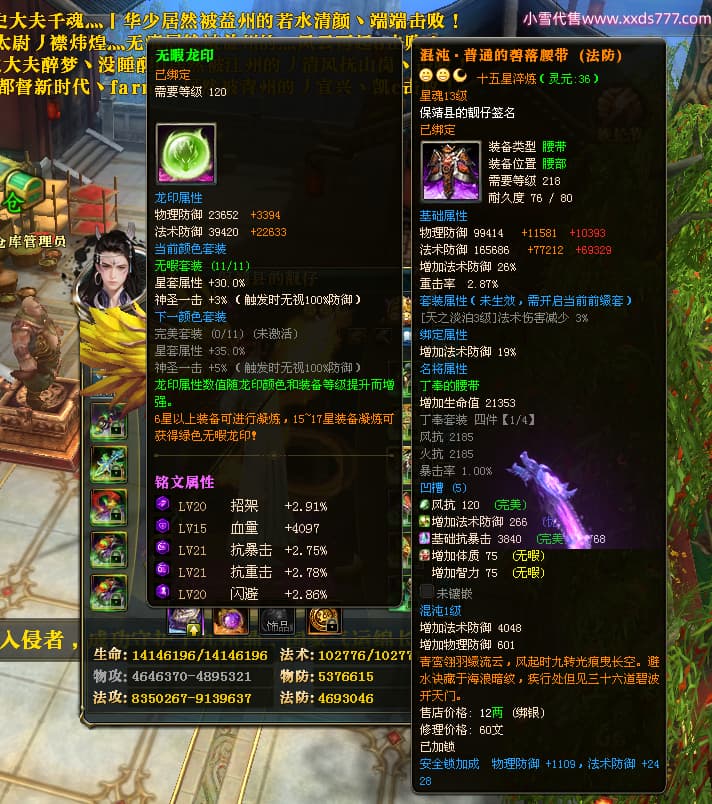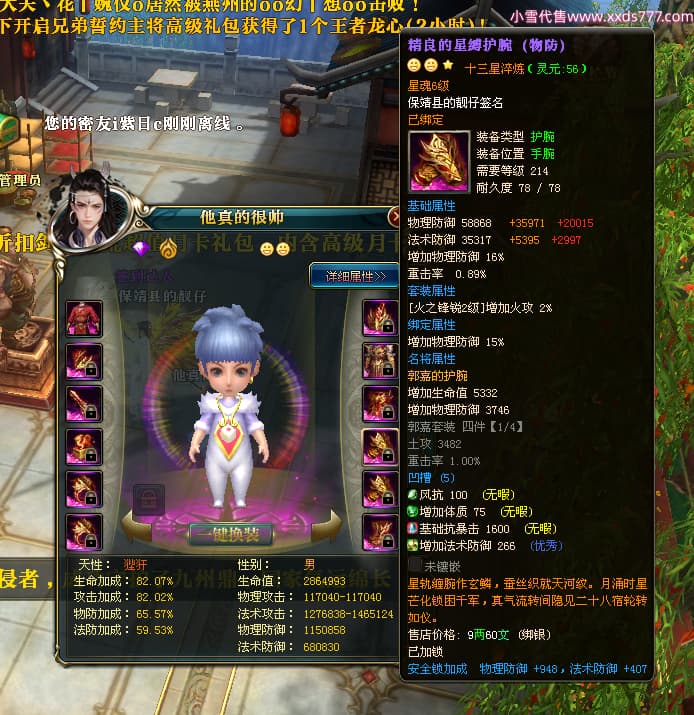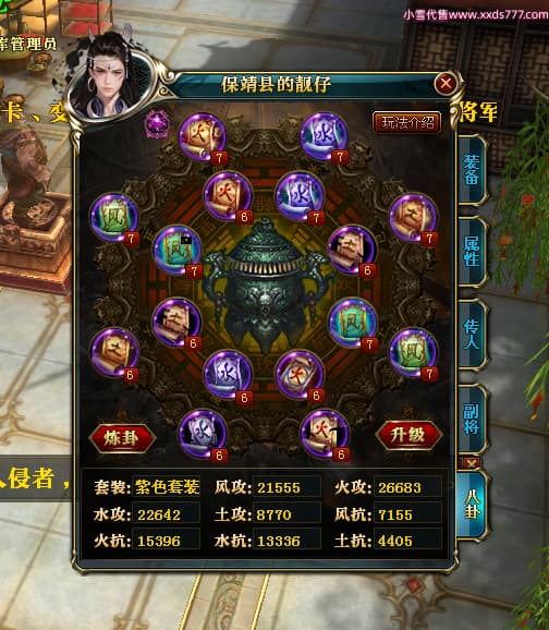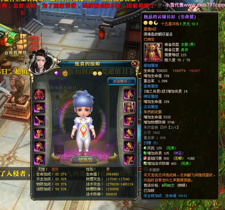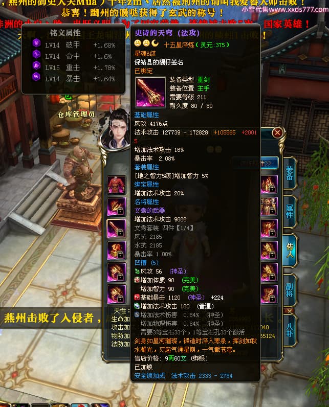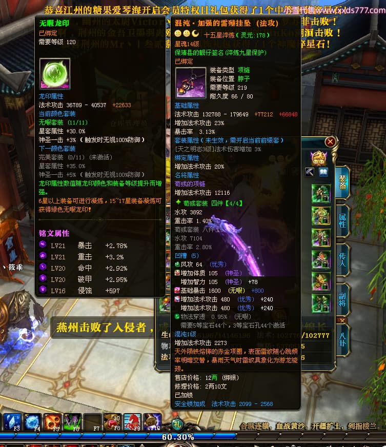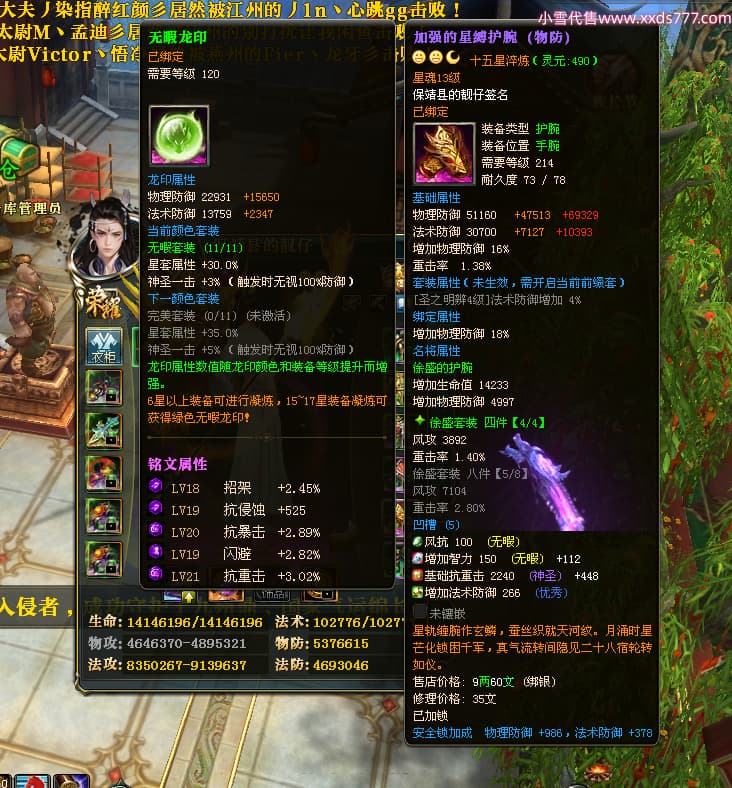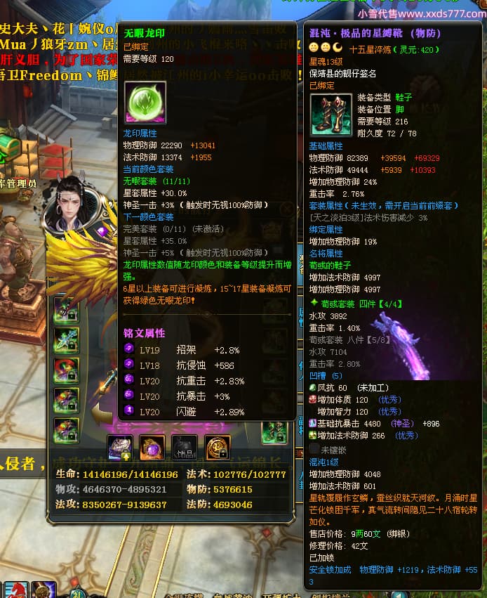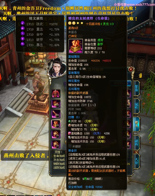 编号X23846 保靖县的靓仔 龙啸风云 荆州 本国排名88名 11440W战力 人物黄金极品紫15X(7件混沌) 传人精良紫12X(2件15X) 副将加强紫12X 马极品紫9X 精良紫13披风 人物星魂13级 传人星魂6级 副将星魂4级 马星魂6级 人物铭刻7件15级其余14级 人物点亮3件16星其余14星 马铭刻12级 点亮10星 人物绿龙印 马蓝龙印(1件黄龙印) 五六等单双属性神圣完美优秀石头 蓝白孔