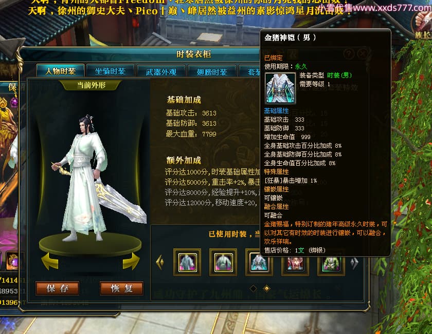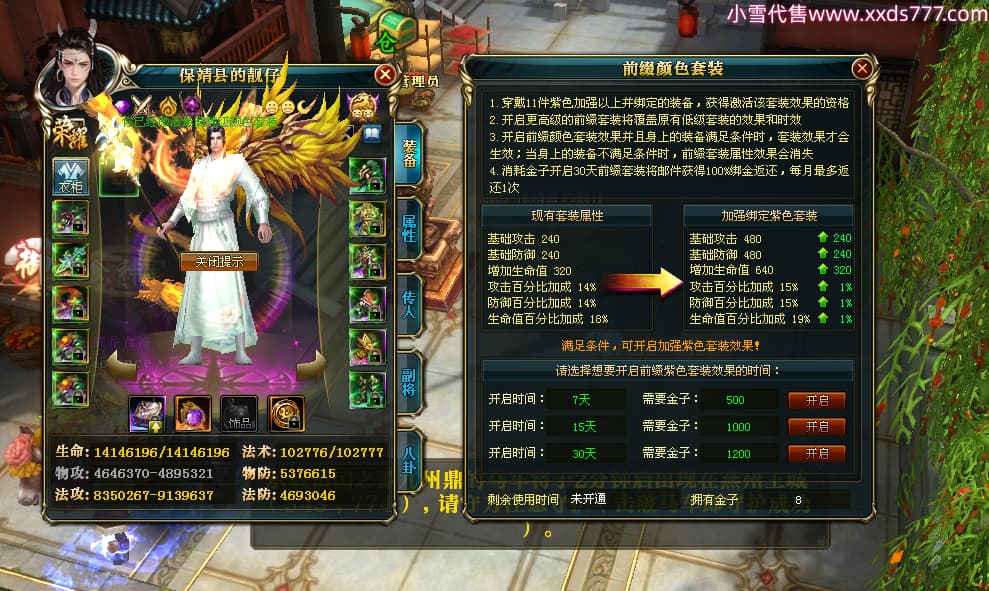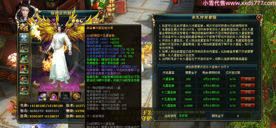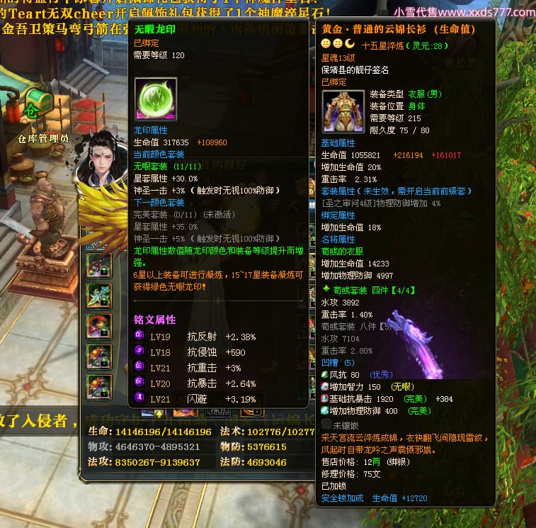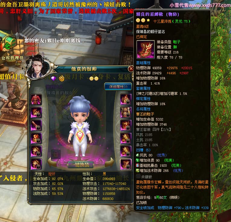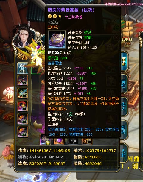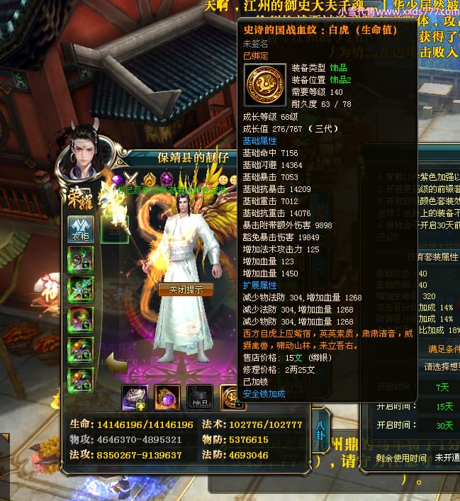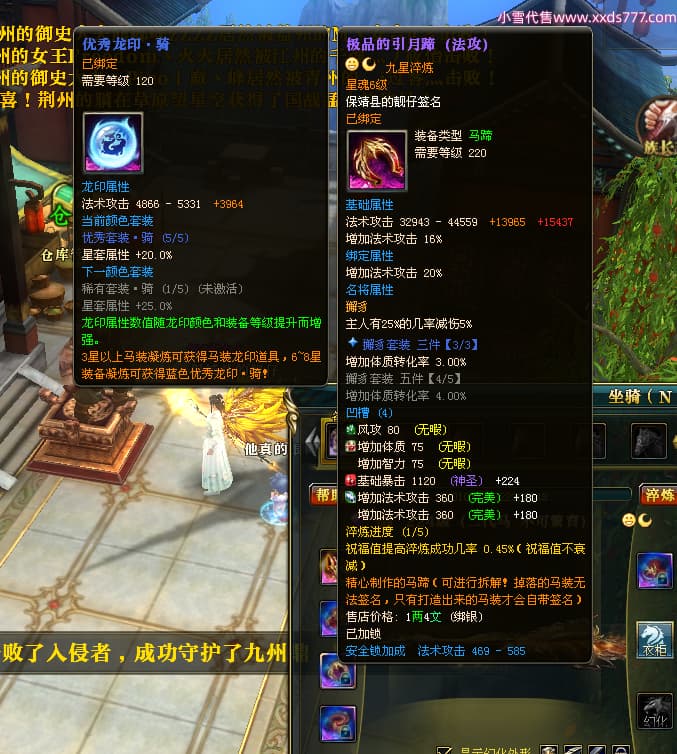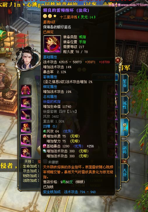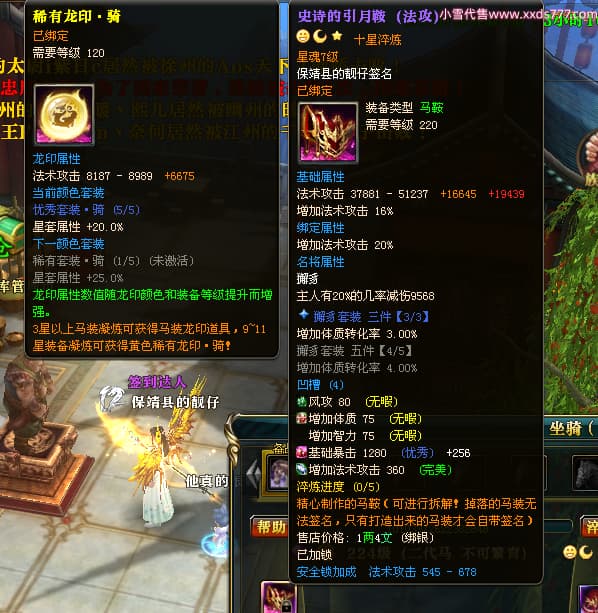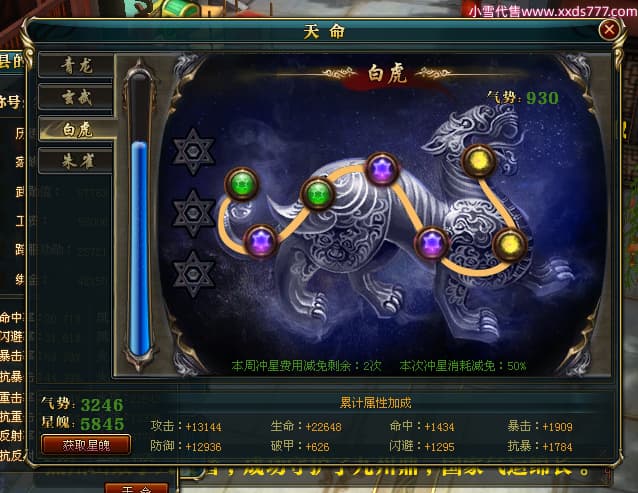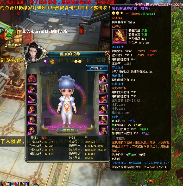 编号X23846 保靖县的靓仔 龙啸风云 荆州 本国排名88名 11440W战力 人物黄金极品紫15X(7件混沌) 传人精良紫12X(2件15X) 副将加强紫12X 马极品紫9X 精良紫13披风 人物星魂13级 传人星魂6级 副将星魂4级 马星魂6级 人物铭刻7件15级其余14级 人物点亮3件16星其余14星 马铭刻12级 点亮10星 人物绿龙印 马蓝龙印(1件黄龙印) 五六等单双属性神圣完美优秀石头 蓝白孔