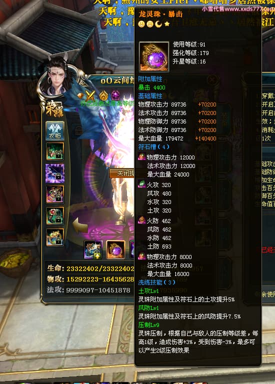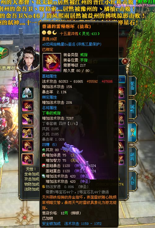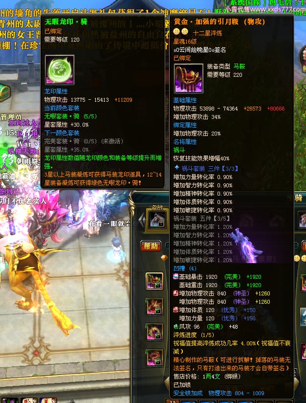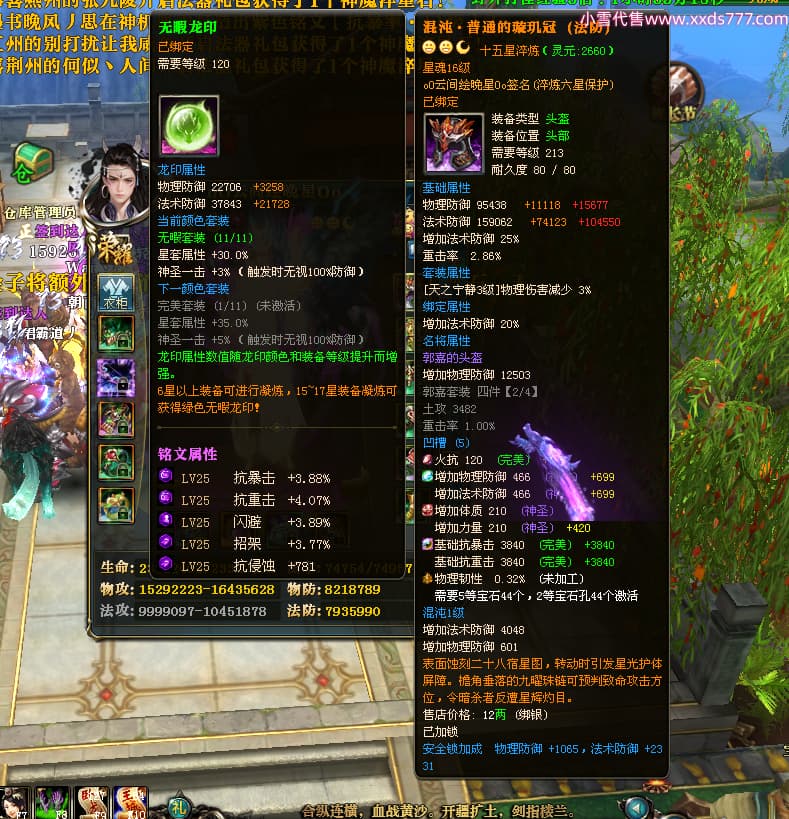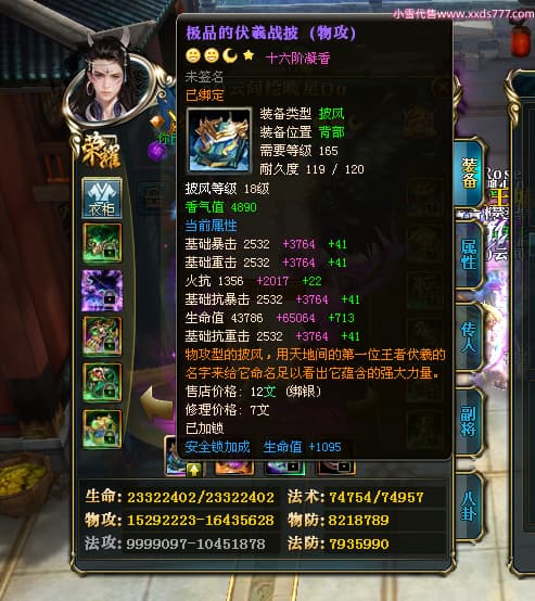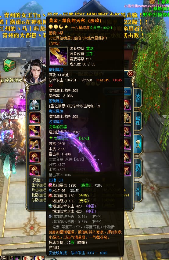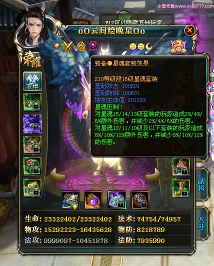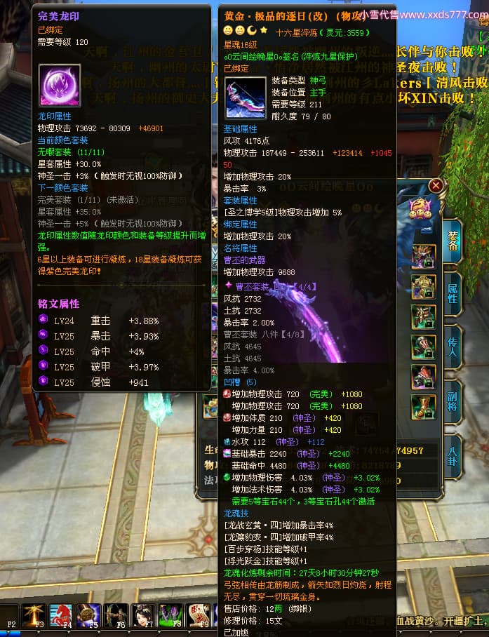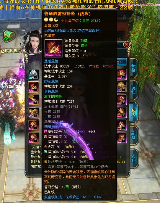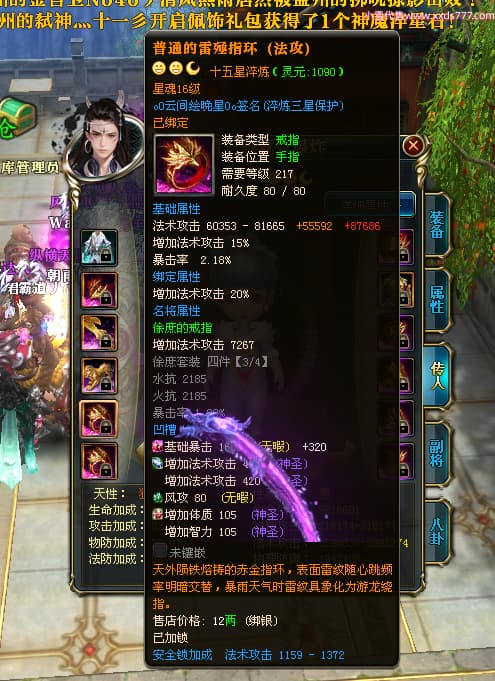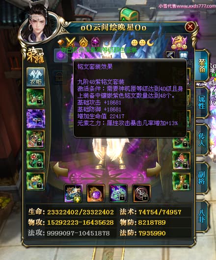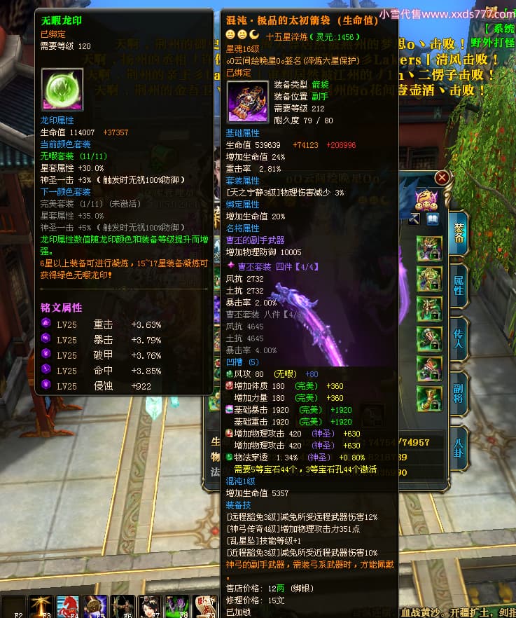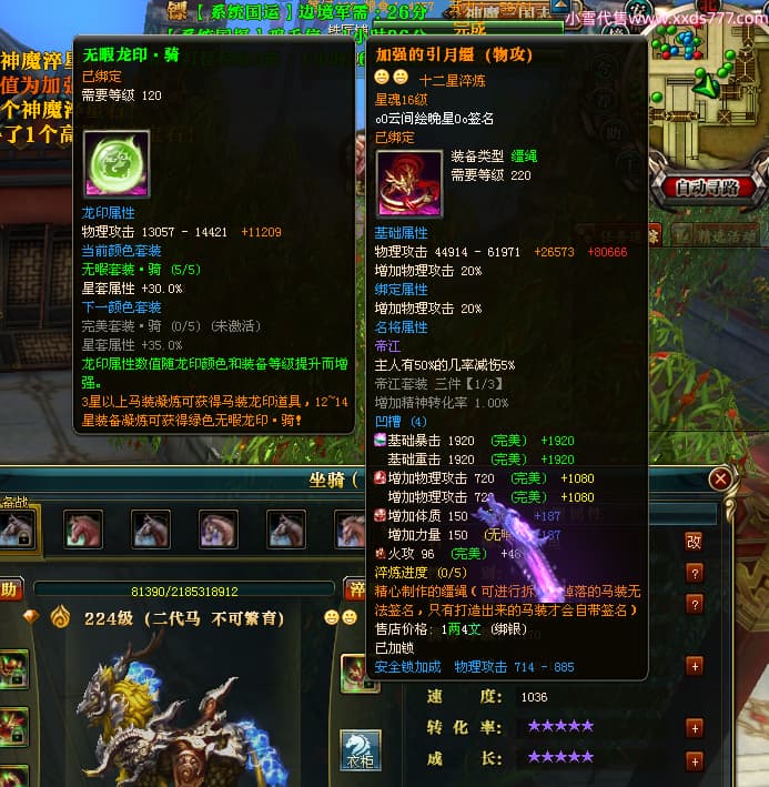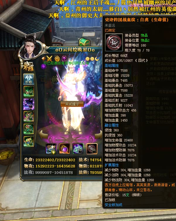 编号X23848 oO云间绘晚星Oo 龙啸风云 扬州 本国排名84名 23354W战力 人物黄金普通橙15X(7件混沌) 传人史诗紫15X 副将极品紫15X 马普通橙12X 极品紫16披风 人物星魂16级 传人星魂16级 副将星魂9级 马星魂16级 人物铭刻3件16级其余15级 点亮16星 马铭刻15级 点亮12星 人物绿龙印(1件紫龙印) 马绿龙印 六等单双属性神圣完美无暇石头 黄绿孔 已开2次永久15星套