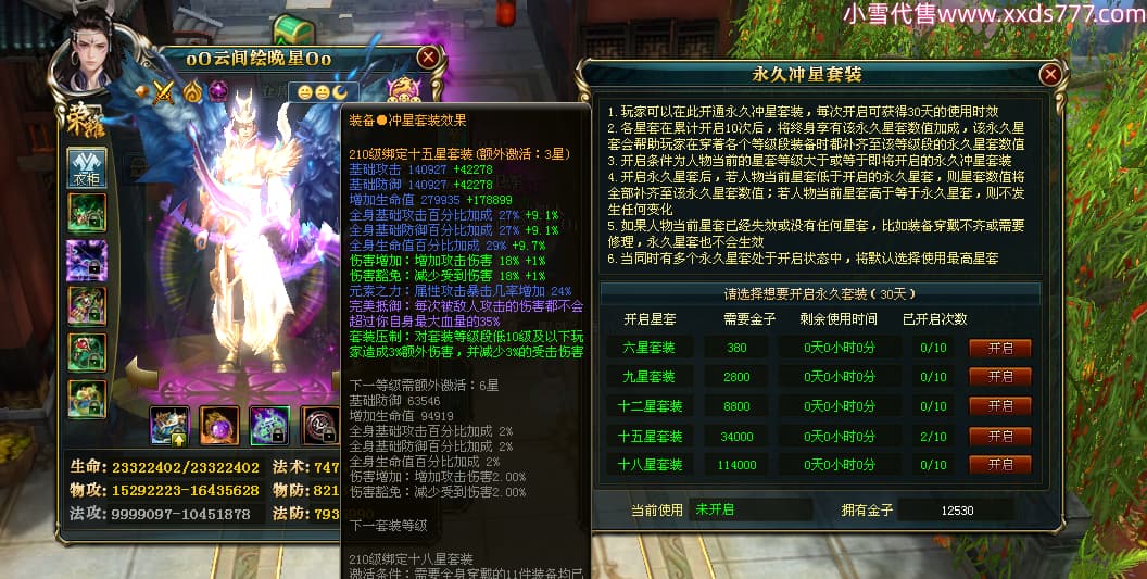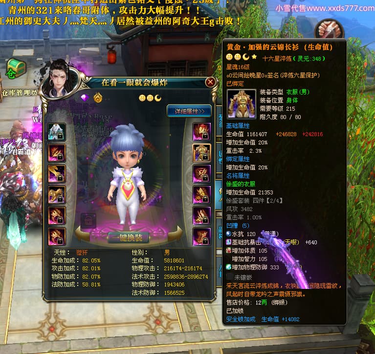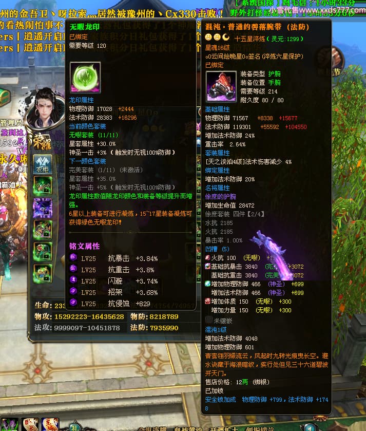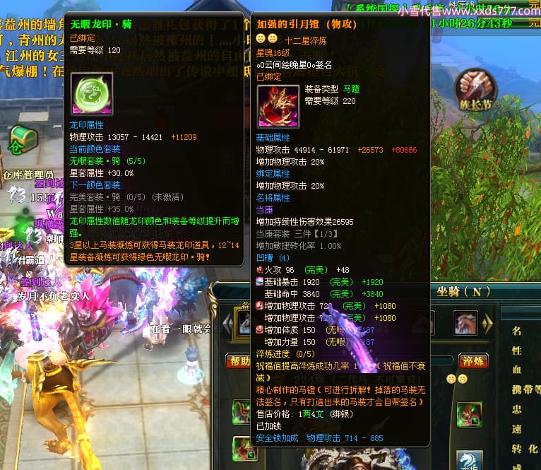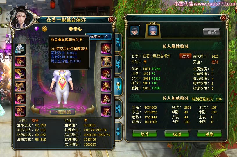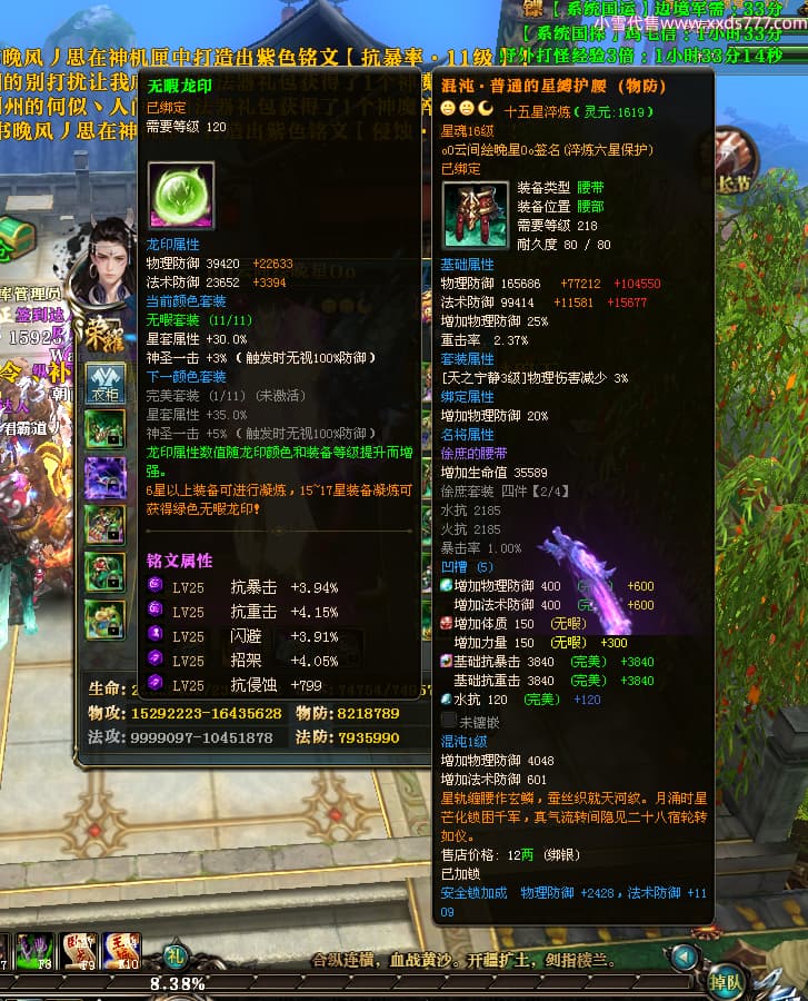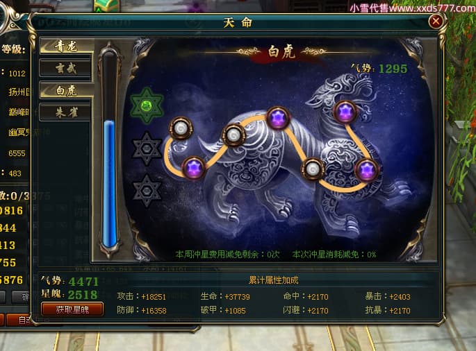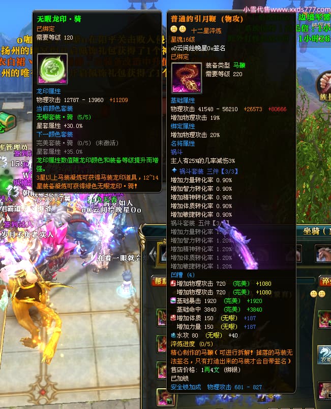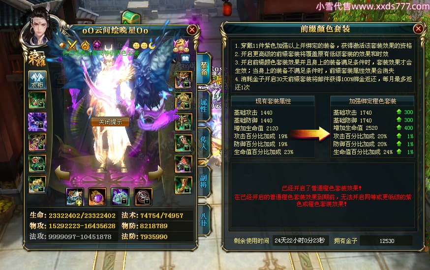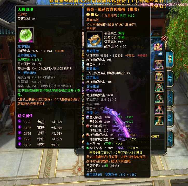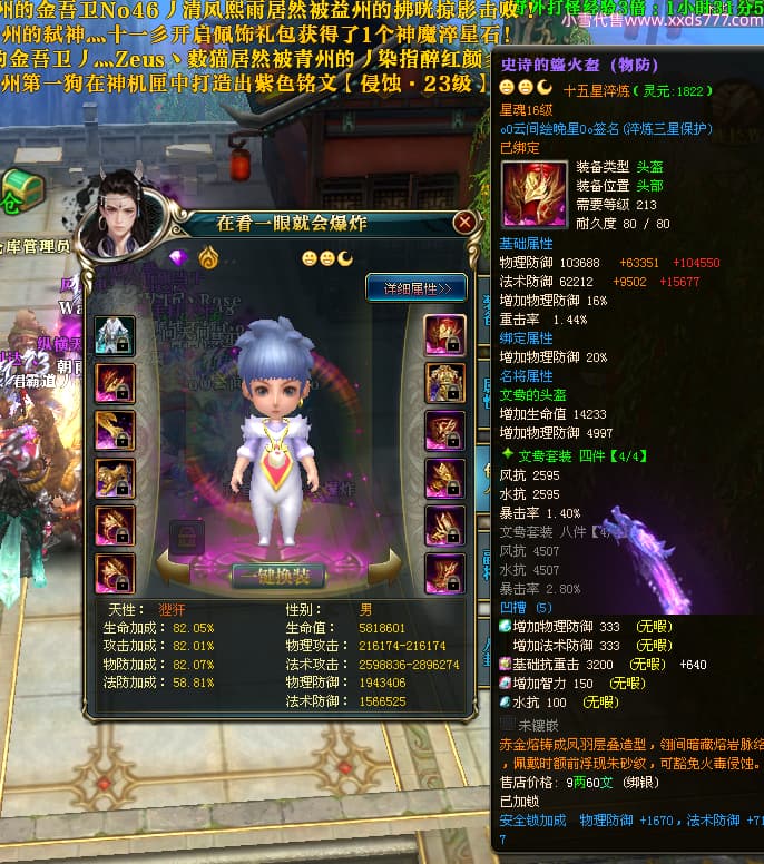 编号X23848 oO云间绘晚星Oo 龙啸风云 扬州 本国排名84名 23354W战力 人物黄金普通橙15X(7件混沌) 传人史诗紫15X 副将极品紫15X 马普通橙12X 极品紫16披风 人物星魂16级 传人星魂16级 副将星魂9级 马星魂16级 人物铭刻3件16级其余15级 点亮16星 马铭刻15级 点亮12星 人物绿龙印(1件紫龙印) 马绿龙印 六等单双属性神圣完美无暇石头 黄绿孔 已开2次永久15星套