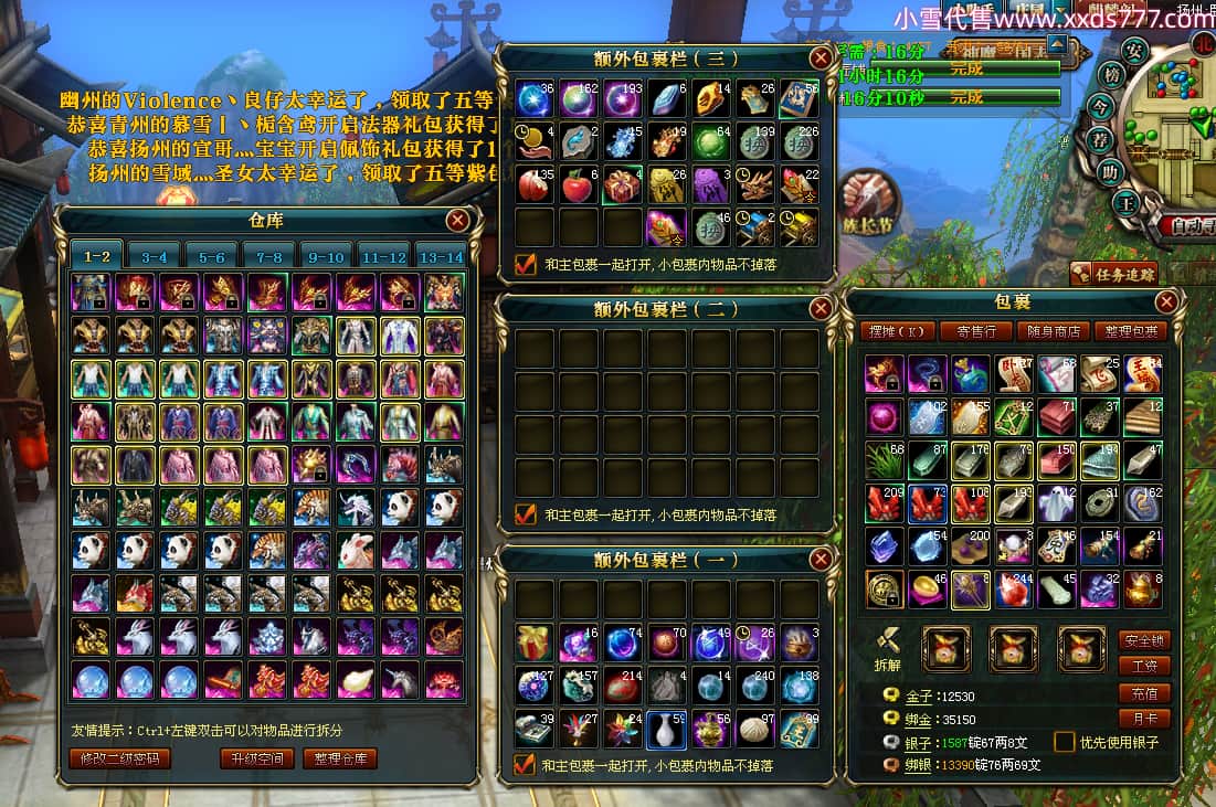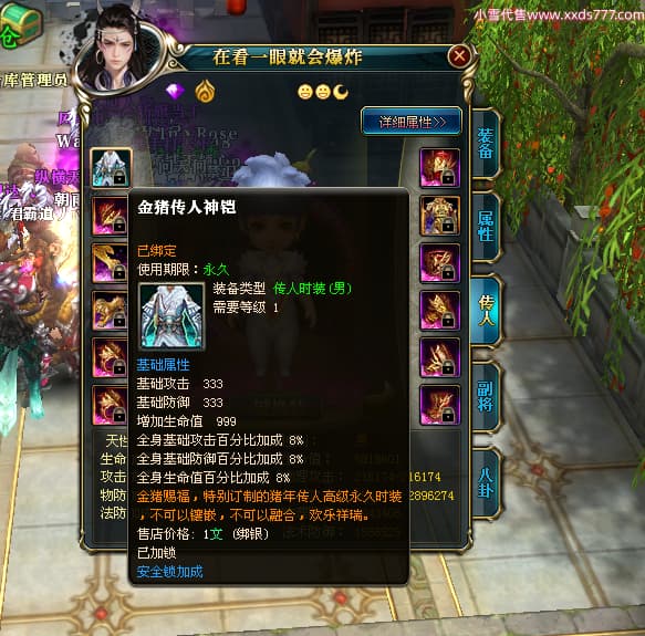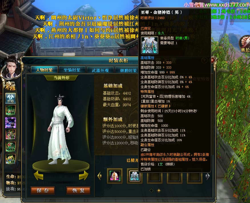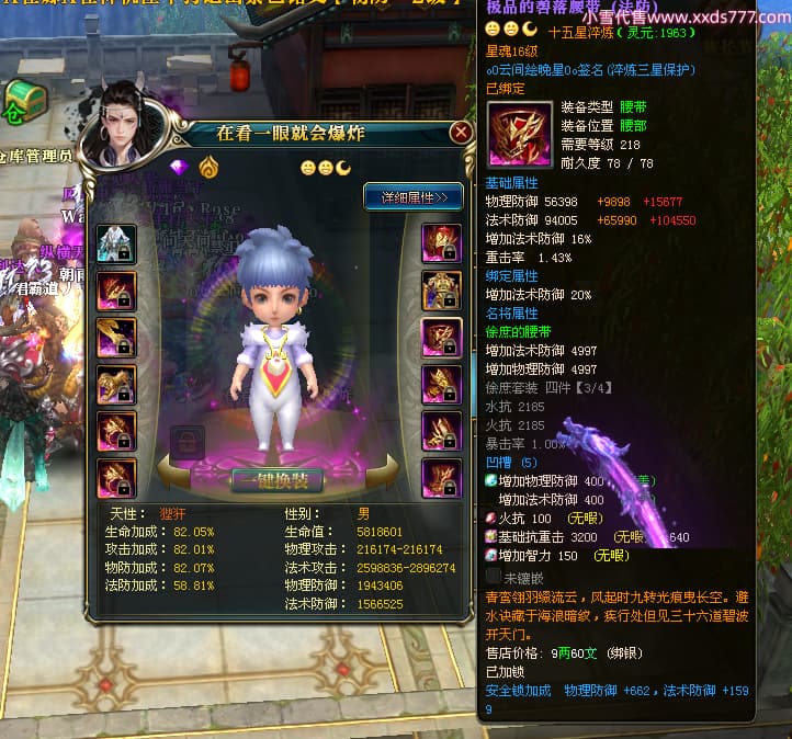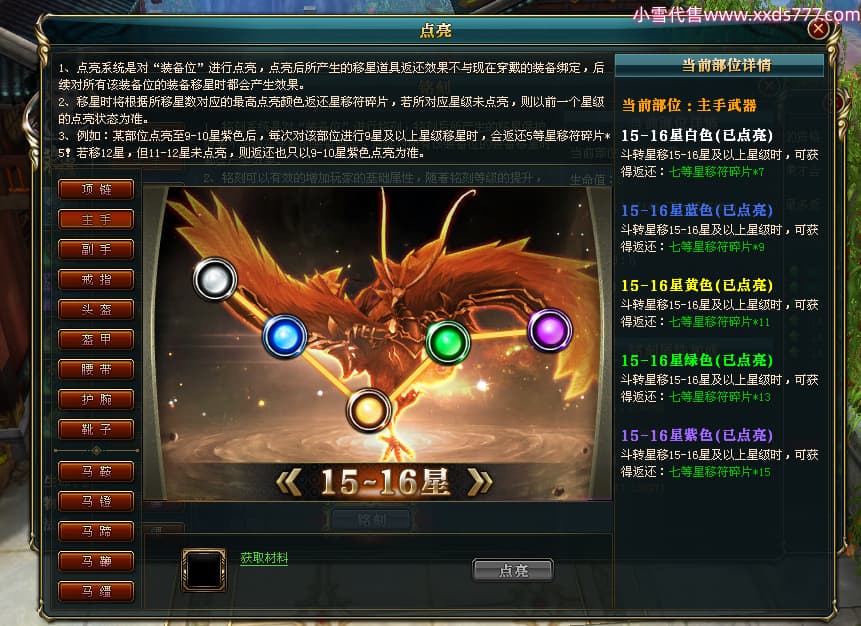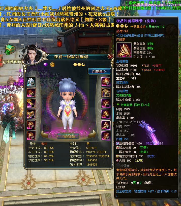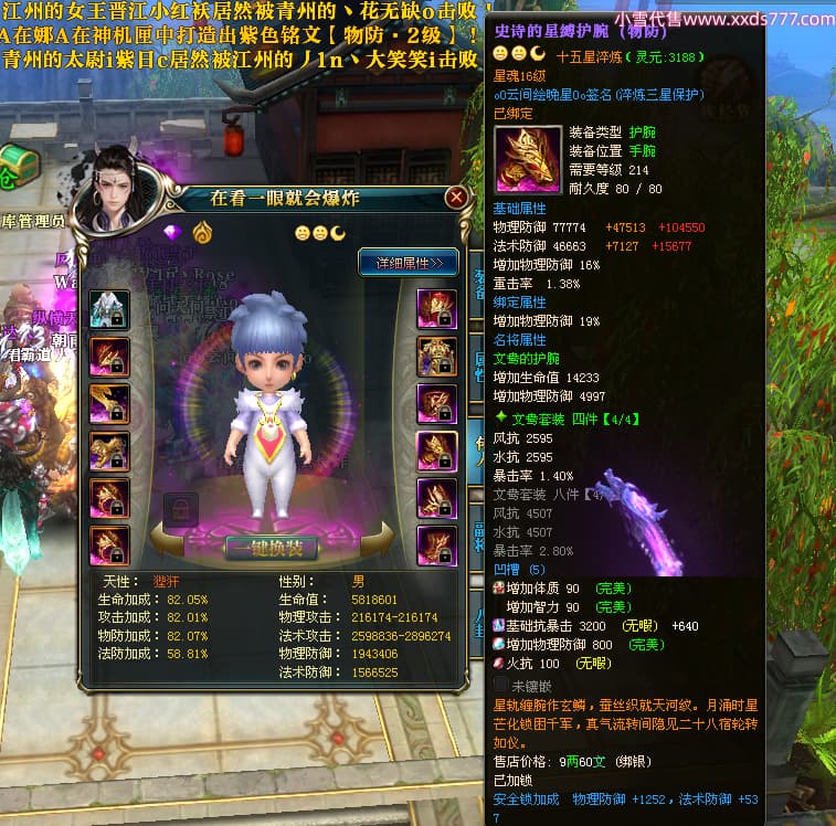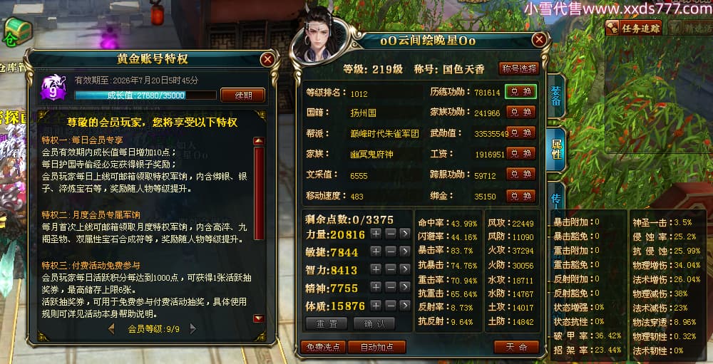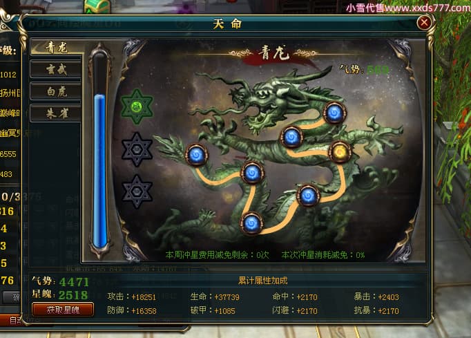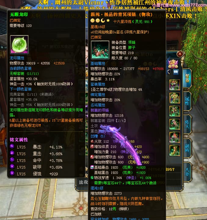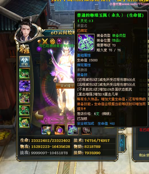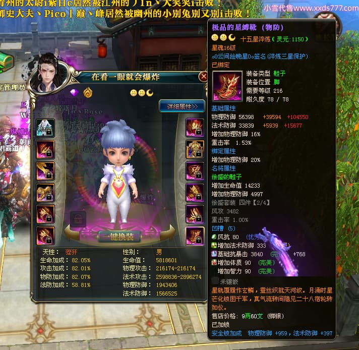 编号X23848 oO云间绘晚星Oo 龙啸风云 扬州 本国排名84名 23354W战力 人物黄金普通橙15X(7件混沌) 传人史诗紫15X 副将极品紫15X 马普通橙12X 极品紫16披风 人物星魂16级 传人星魂16级 副将星魂9级 马星魂16级 人物铭刻3件16级其余15级 点亮16星 马铭刻15级 点亮12星 人物绿龙印(1件紫龙印) 马绿龙印 六等单双属性神圣完美无暇石头 黄绿孔 已开2次永久15星套
