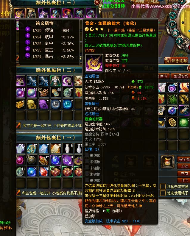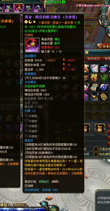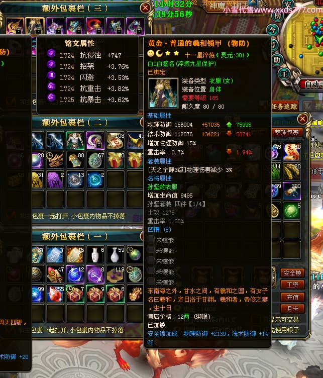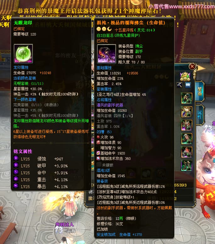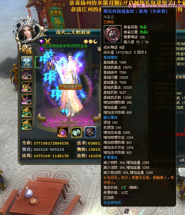 编号Y23858 战火灬大蛇屙尿 龙耀狂飙 江州 本国排名54名 2635W战力 人物黄金普通橙15X(7件混沌) 马黄金加强橙10X 人物绿龙印 马黄龙印 六等单双属性石头