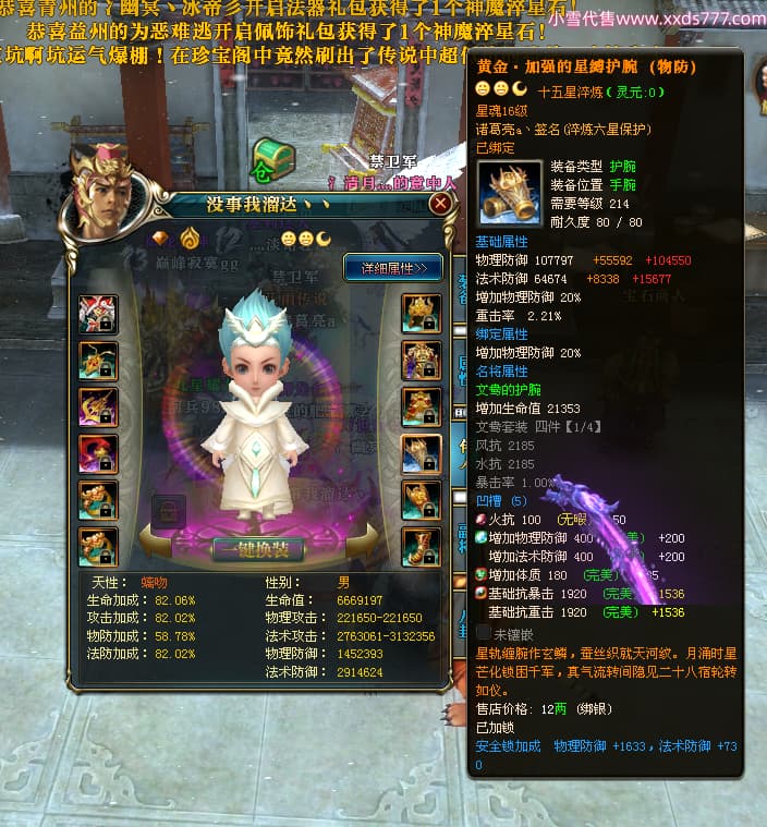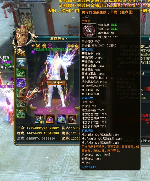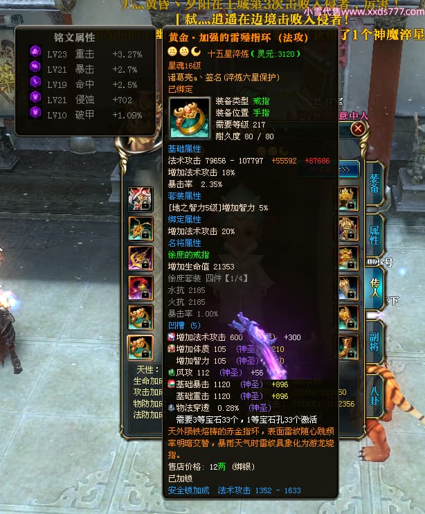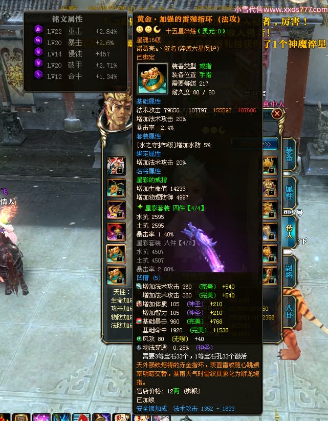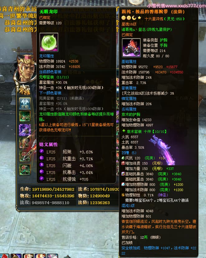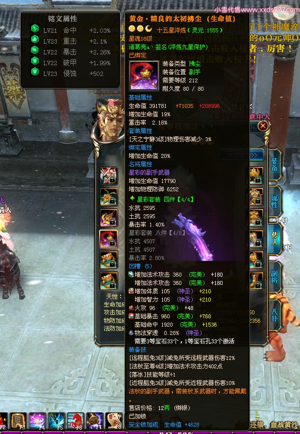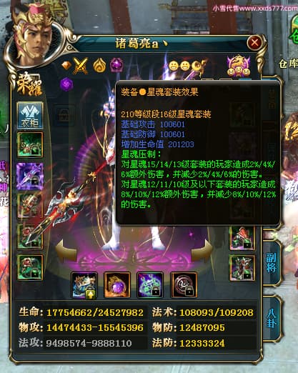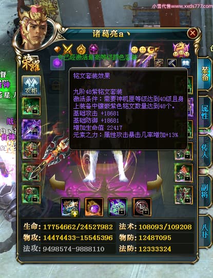 编号W23907 诸葛亮a丶 龙舞九州 青州 世界排名65名 26085W战力 人物黄金极品橙15X(9件混沌) 传人黄金加强橙15X 副将普通橙15X 马黄金加强橙13X 极品紫16披风 人物星魂16级 传人星魂16级 副将星魂16级 马星魂16级 人物铭刻15级 点亮16星 马铭刻4件14级1件13级 点亮14星 人物绿龙印(2件紫龙印) 马黄龙印(2件绿龙印) 六等单双属性神圣完美无暇石头 黄绿孔