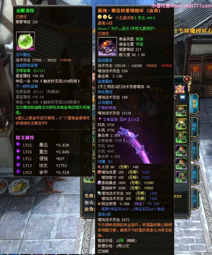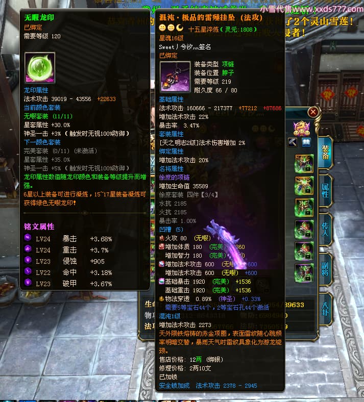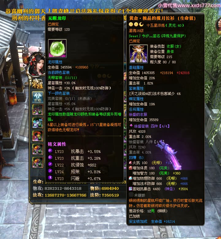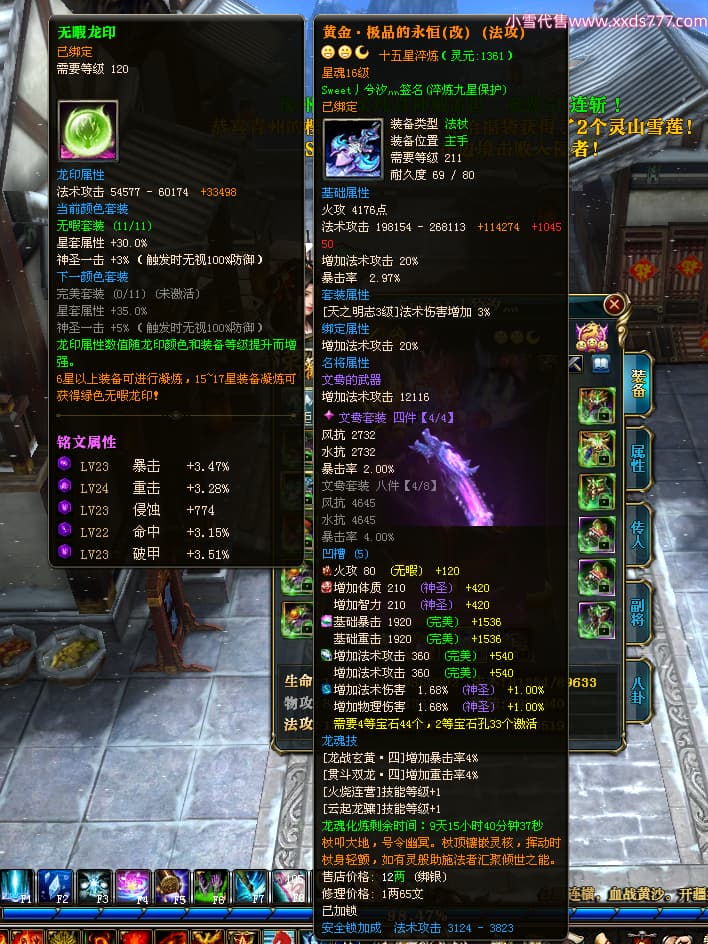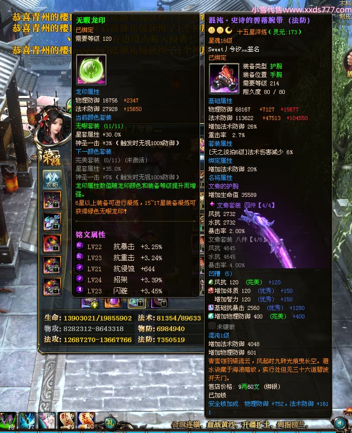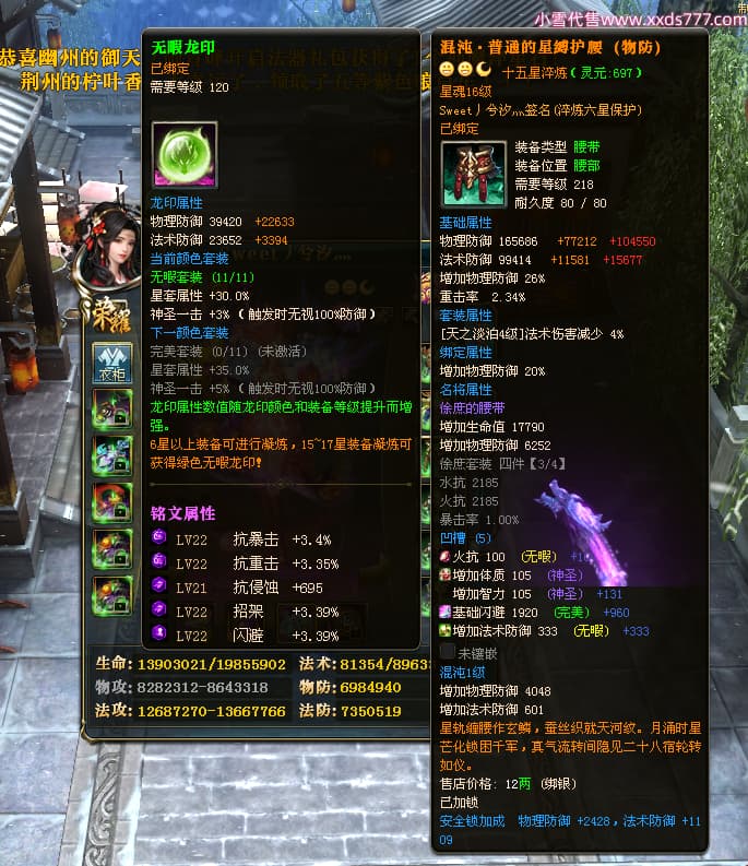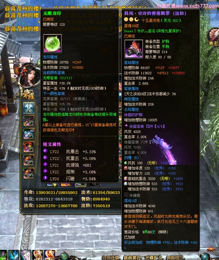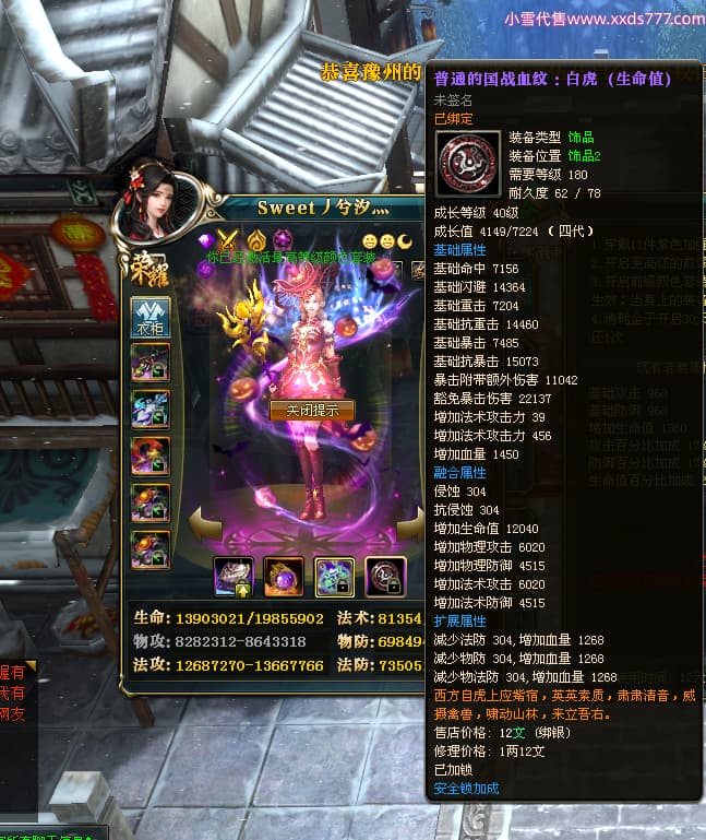 编号X23912 Sweet丿兮汐灬 龙啸风云 徐州 本国排名21名 18141W战力 人物黄金史诗紫15X(8件混沌) 传人精良紫12X 副将史诗紫12X 马普通橙12X 精良紫15披风 人物星魂16级 传人星魂16级 副将星魂6级 马星魂15级 人物铭刻15级 人物点亮1件14星其余12星 马铭刻12级 点亮12星 人物绿龙印 马黄龙印 五六等单双属性神圣完美优秀石头 黄蓝孔