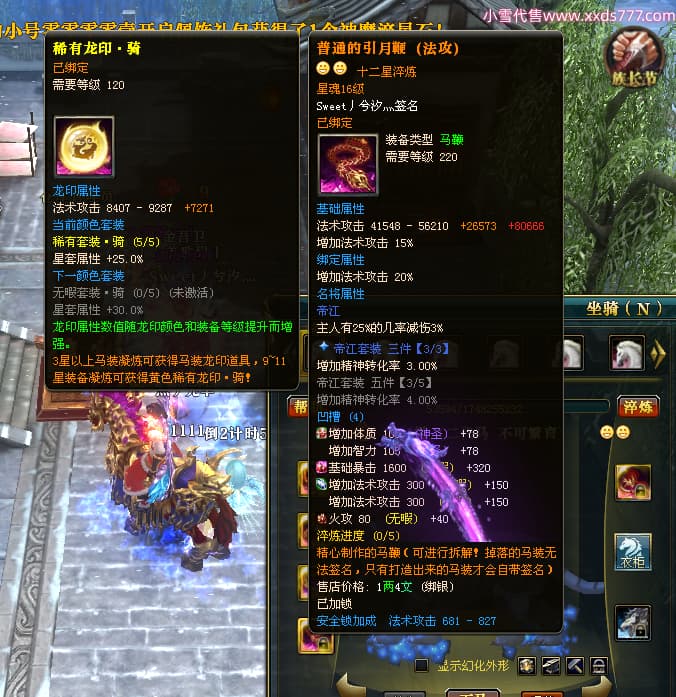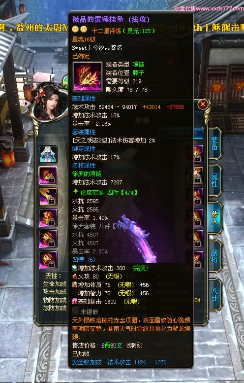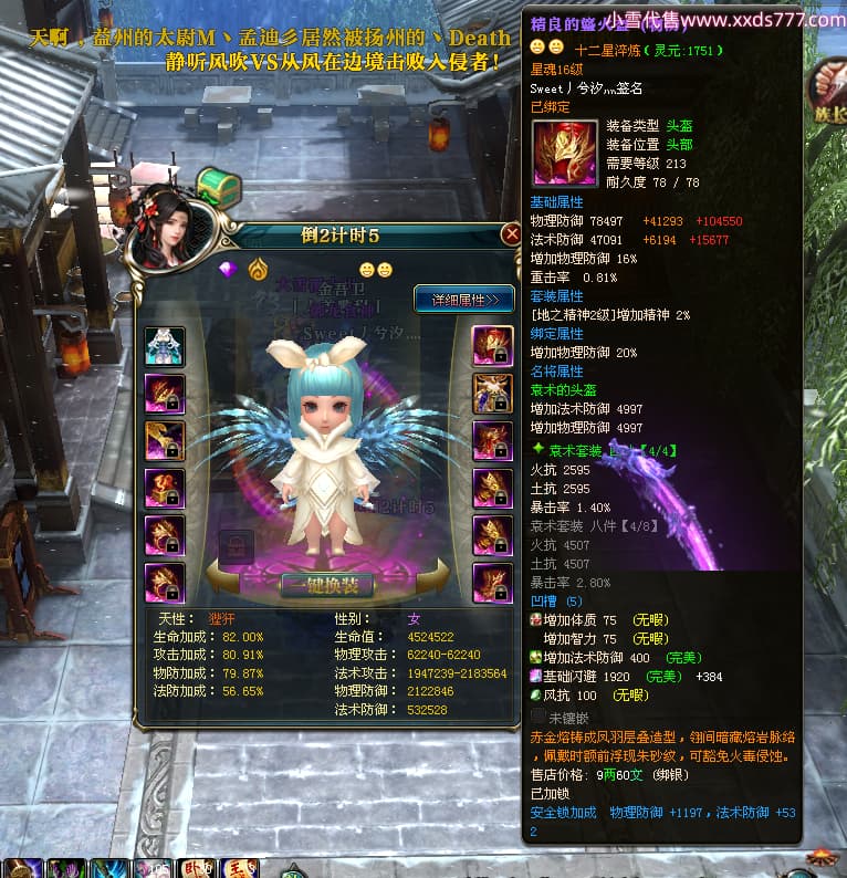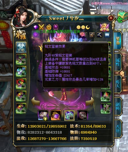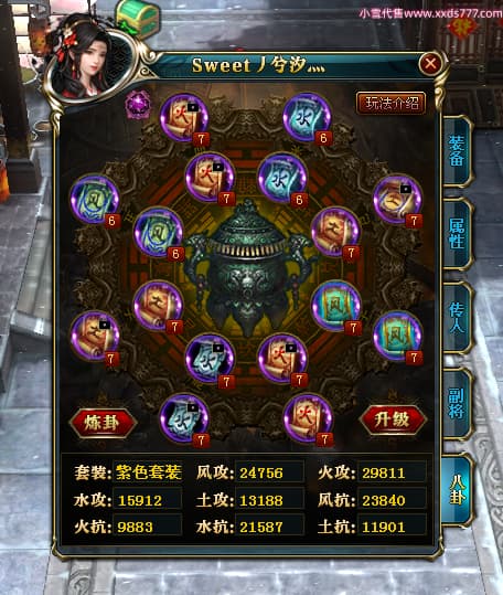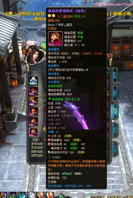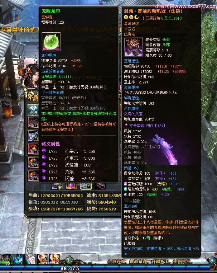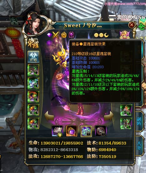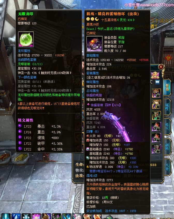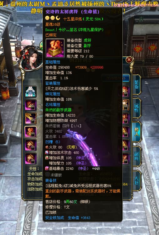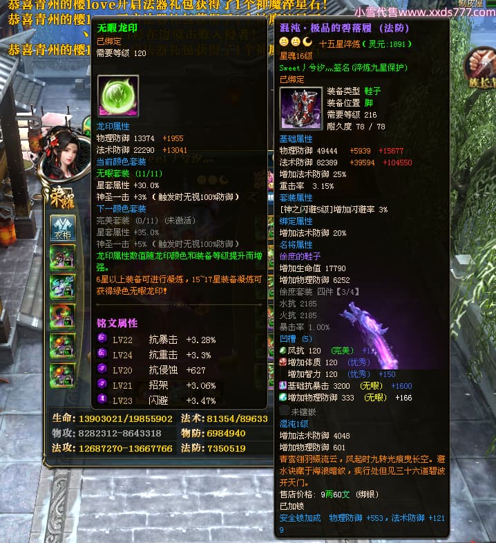 编号X23912 Sweet丿兮汐灬 龙啸风云 徐州 本国排名21名 18141W战力 人物黄金史诗紫15X(8件混沌) 传人精良紫12X 副将史诗紫12X 马普通橙12X 精良紫15披风 人物星魂16级 传人星魂16级 副将星魂6级 马星魂15级 人物铭刻15级 人物点亮1件14星其余12星 马铭刻12级 点亮12星 人物绿龙印 马黄龙印 五六等单双属性神圣完美优秀石头 黄蓝孔