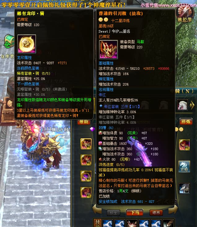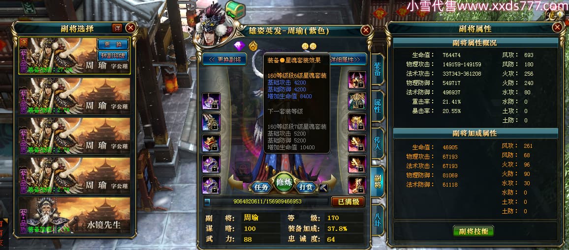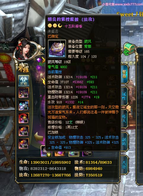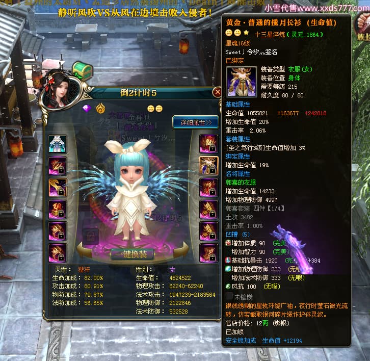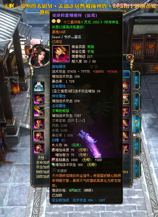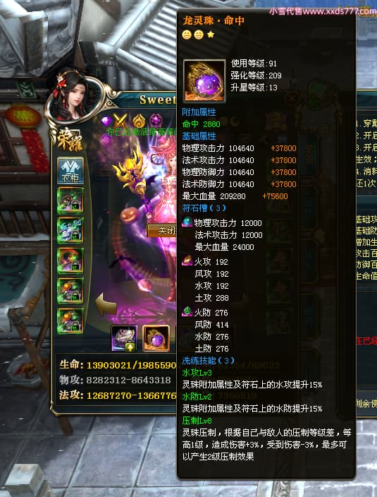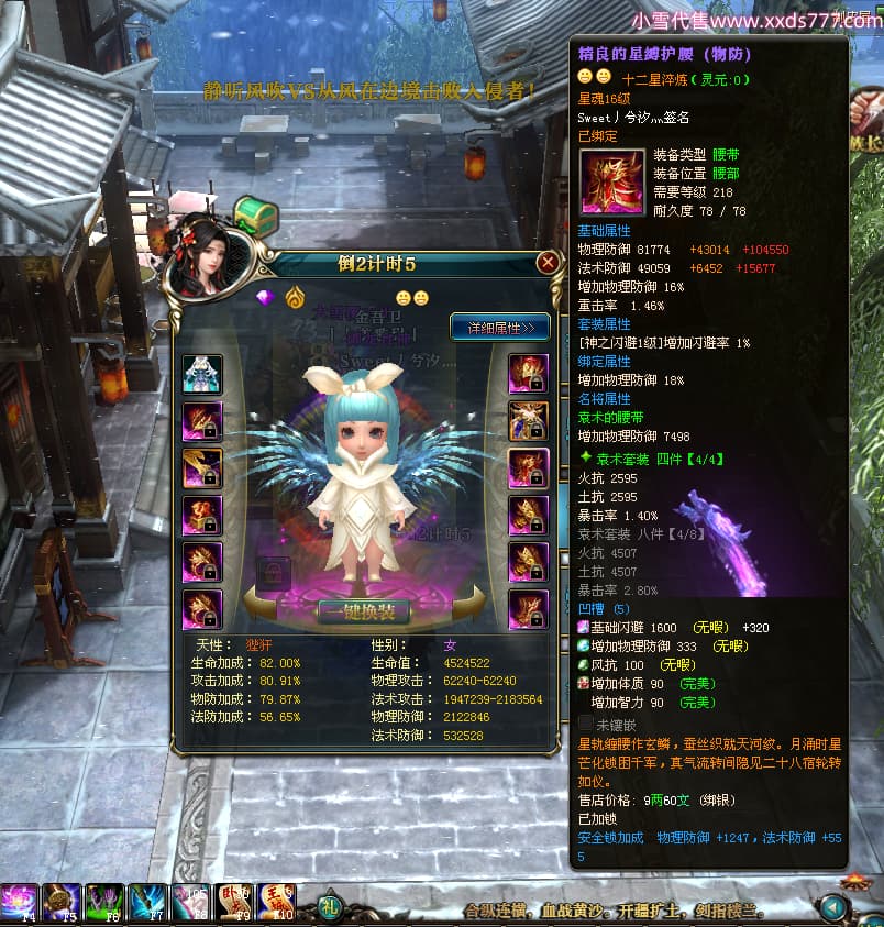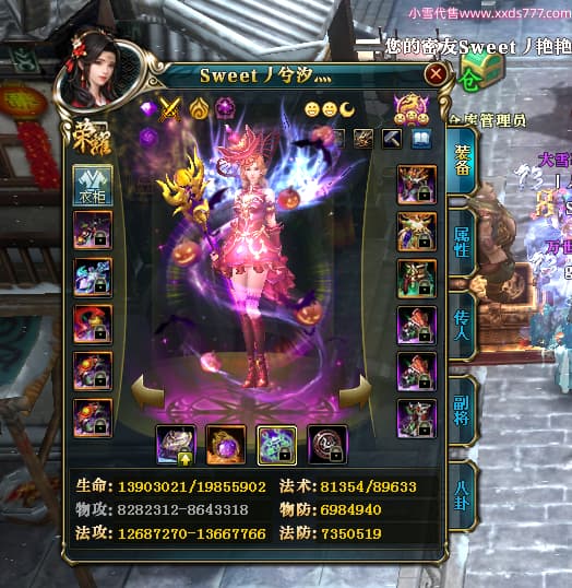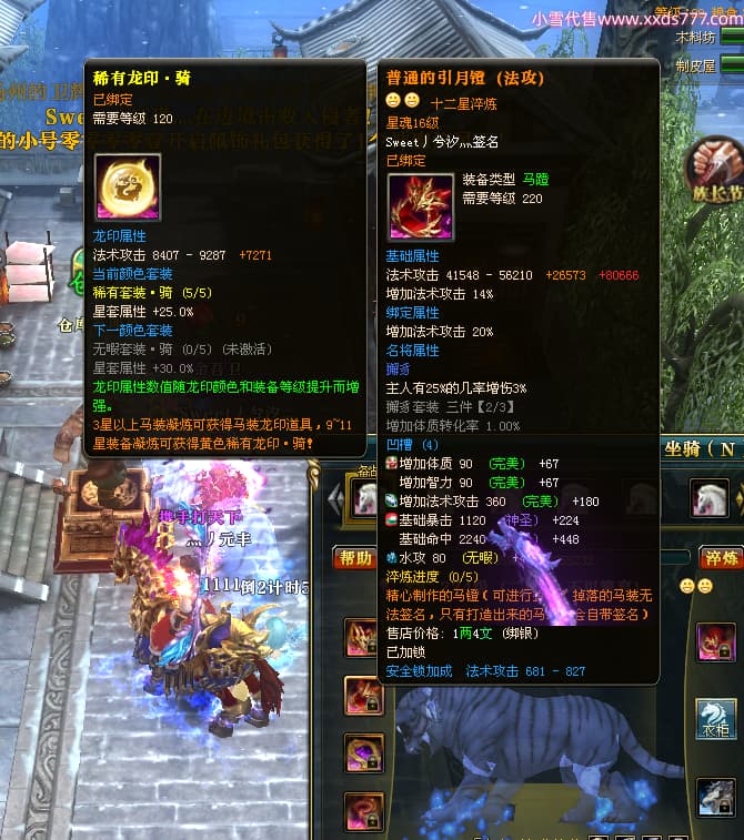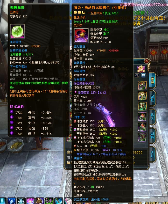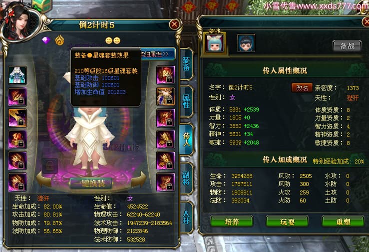 编号X23912 Sweet丿兮汐灬 龙啸风云 徐州 本国排名21名 18141W战力 人物黄金史诗紫15X(8件混沌) 传人精良紫12X 副将史诗紫12X 马普通橙12X 精良紫15披风 人物星魂16级 传人星魂16级 副将星魂6级 马星魂15级 人物铭刻15级 人物点亮1件14星其余12星 马铭刻12级 点亮12星 人物绿龙印 马黄龙印 五六等单双属性神圣完美优秀石头 黄蓝孔