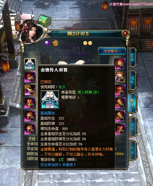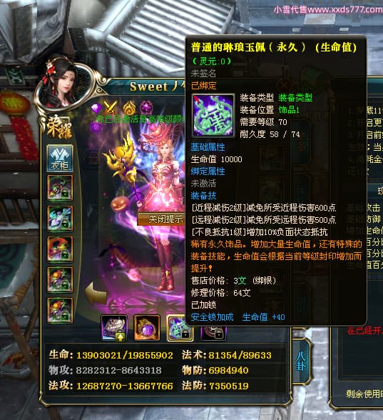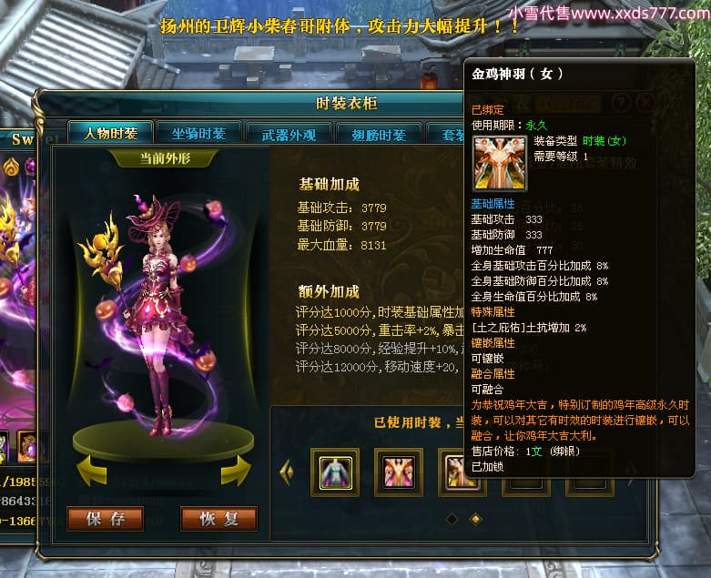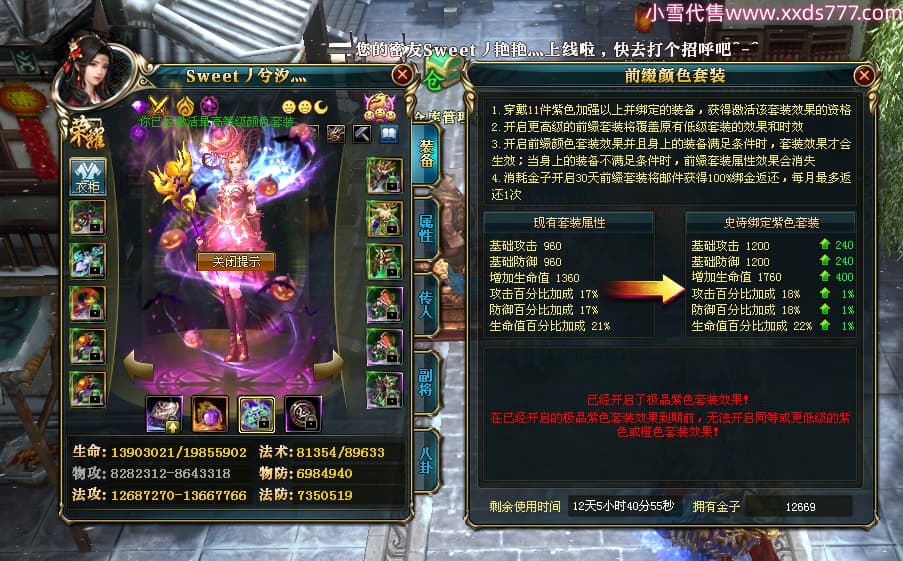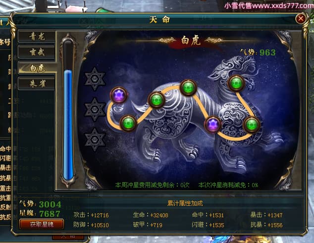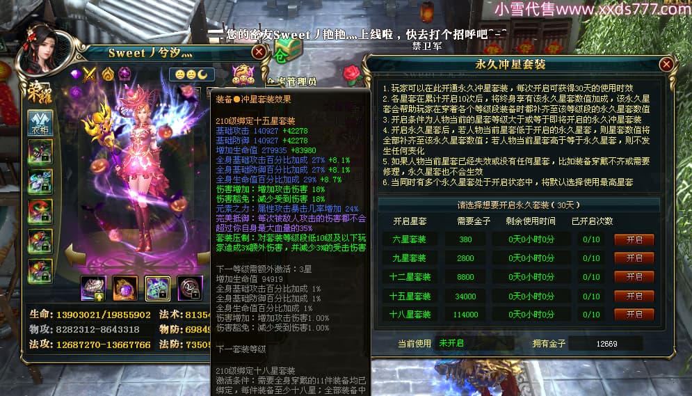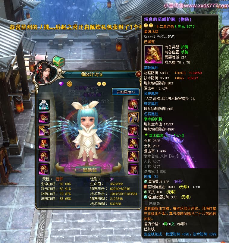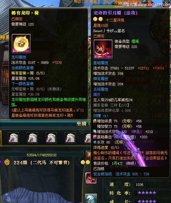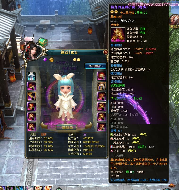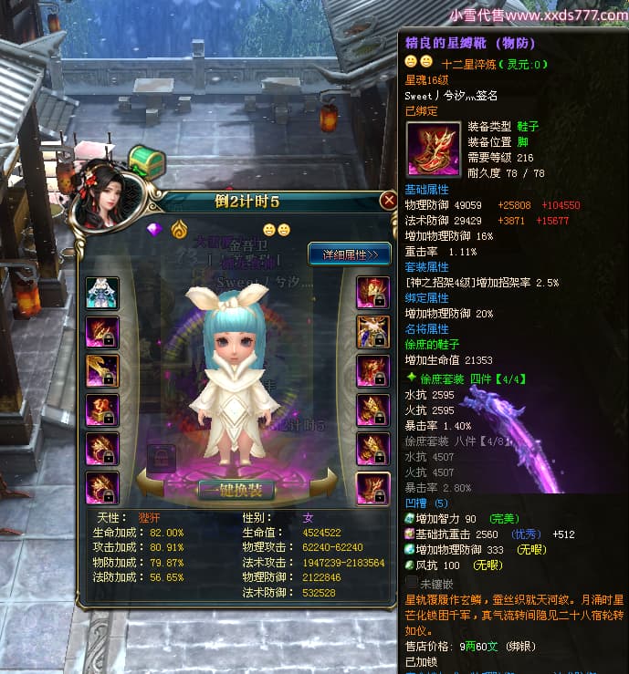 编号X23912 Sweet丿兮汐灬 龙啸风云 徐州 本国排名21名 18141W战力 人物黄金史诗紫15X(8件混沌) 传人精良紫12X 副将史诗紫12X 马普通橙12X 精良紫15披风 人物星魂16级 传人星魂16级 副将星魂6级 马星魂15级 人物铭刻15级 人物点亮1件14星其余12星 马铭刻12级 点亮12星 人物绿龙印 马黄龙印 五六等单双属性神圣完美优秀石头 黄蓝孔