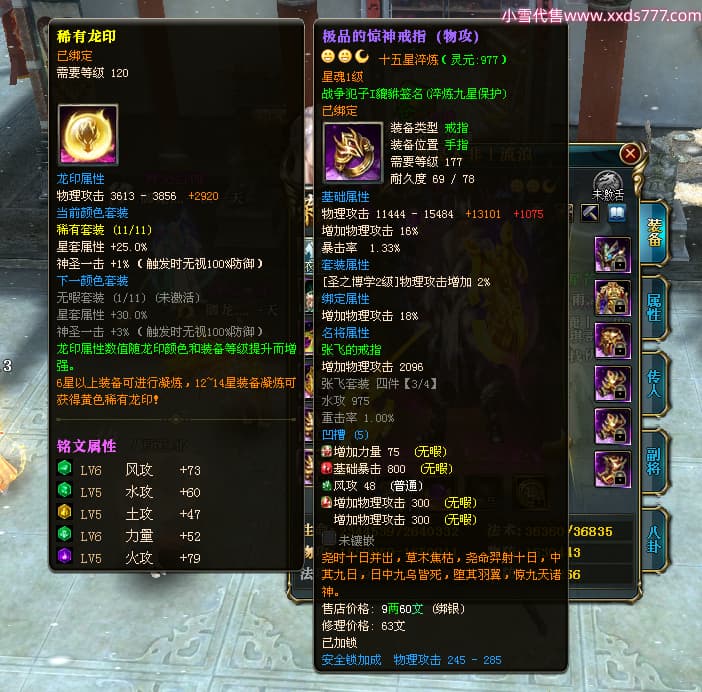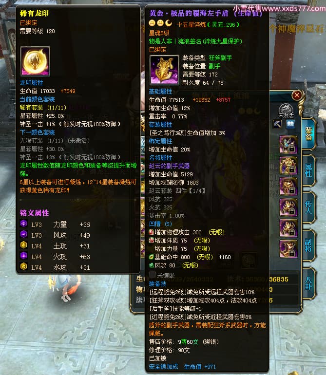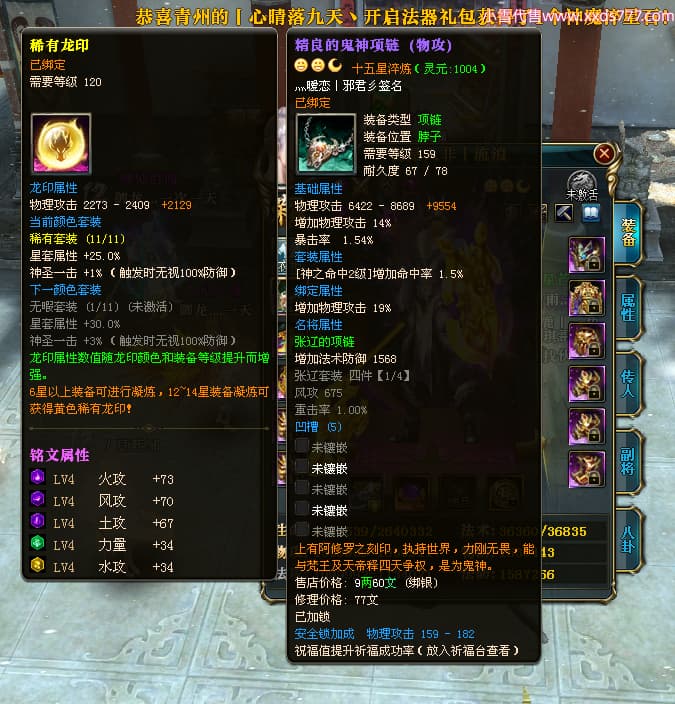 编号Z23918 物是人非丨流浪 逐鹿天下 幽州 人物精良紫15X 马精良紫9X 普通紫11披风 人物铭刻12级 点亮4件12星其余10星 马铭刻12级 点亮10星 人物黄龙印(1件绿龙印) 马白龙印 五等单双属性神圣完美无瑕石头