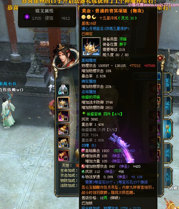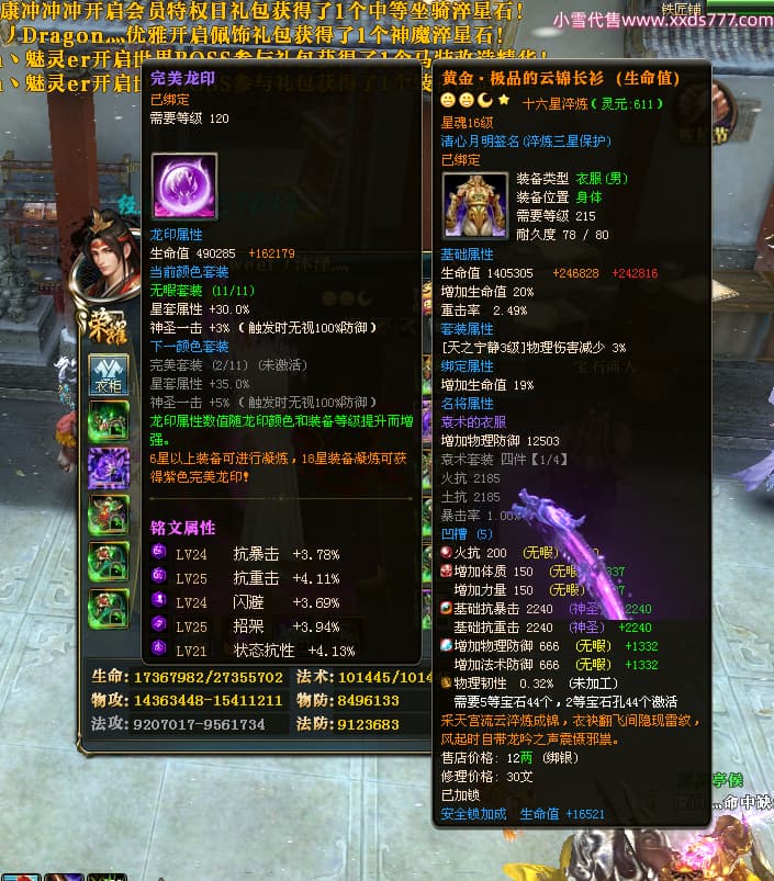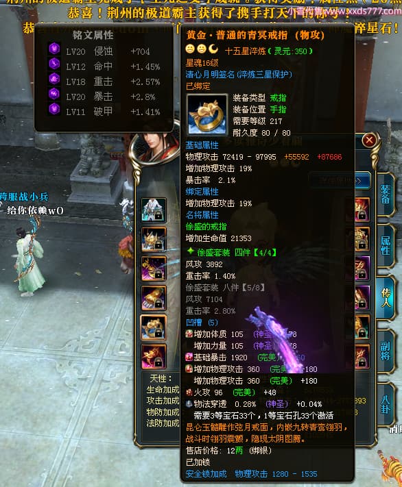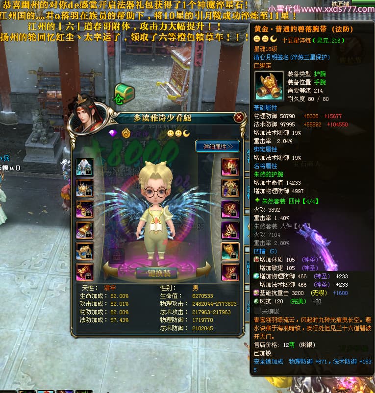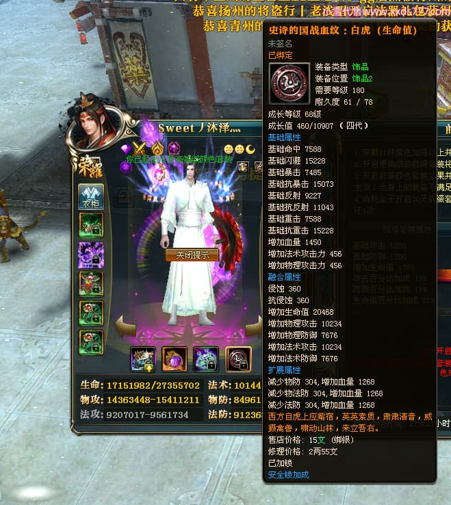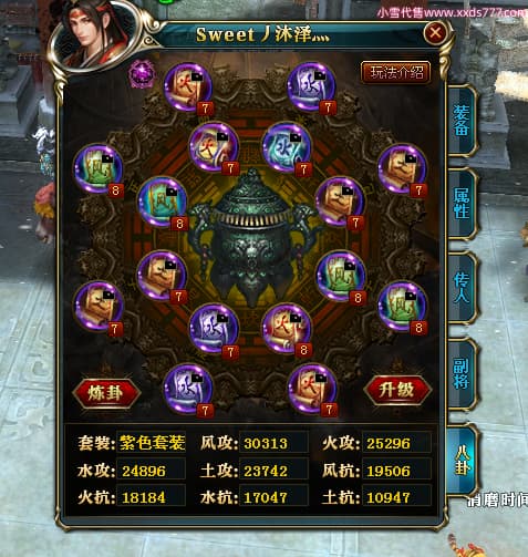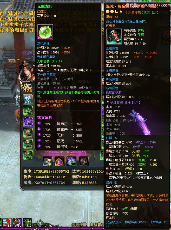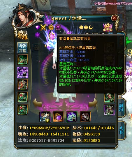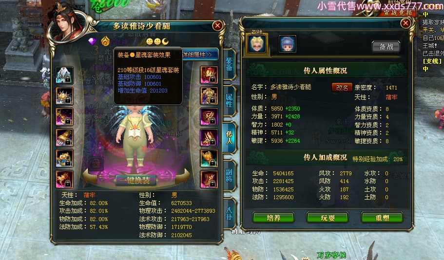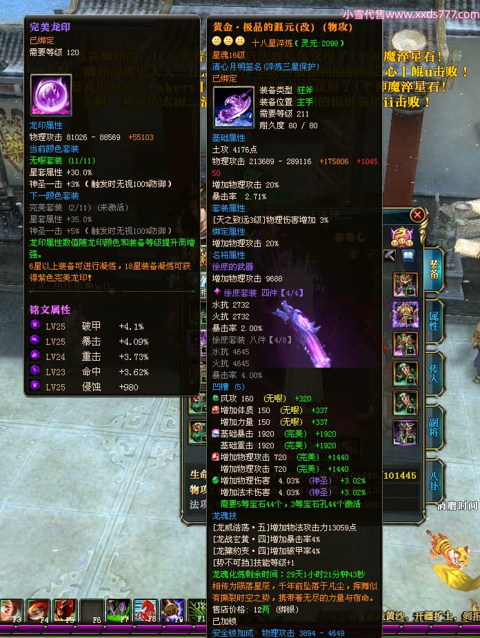编号X23922 Sweet丿沐泽灬 龙啸风云 徐州 世界排名84名 23222W战力 人物黄金极品橙16X(1件18X9件混沌) 传人普通橙15X 副将普通橙15X 马普通橙13X 极品紫17披风 人物星魂16级 传人星魂16级 副将星魂10级 马星魂16级 人物铭刻16级 点亮16星 马铭刻13级 点亮14星 人物绿龙印(2件紫龙印) 马黄龙印(2件绿龙印) 六等单双属性神圣完美无暇石头 黄绿孔