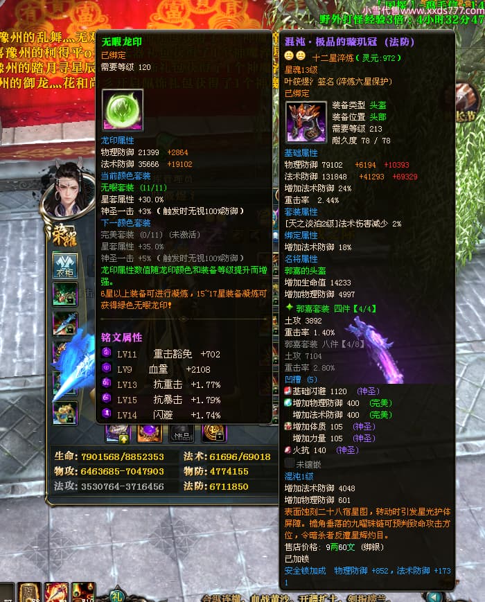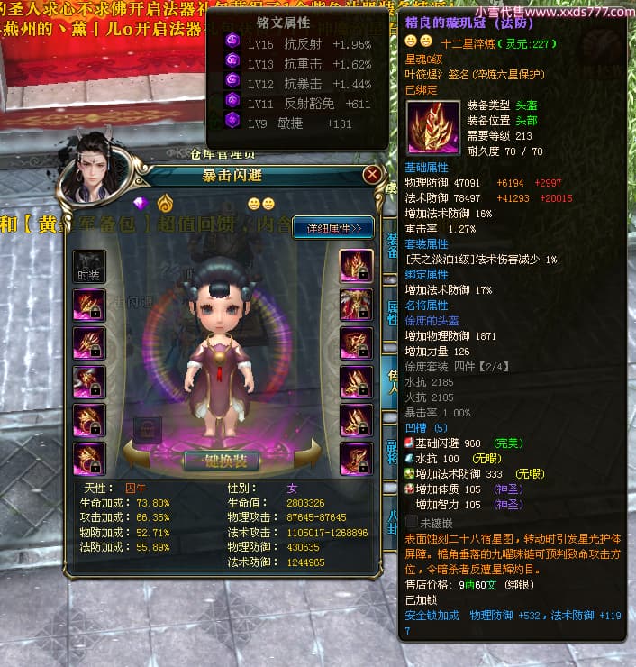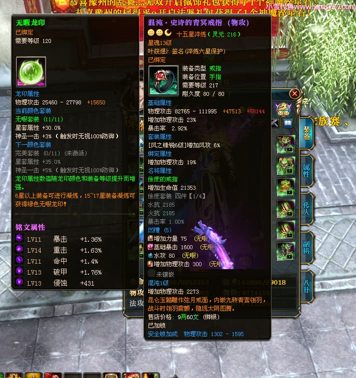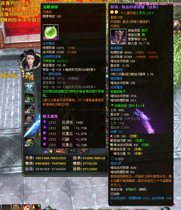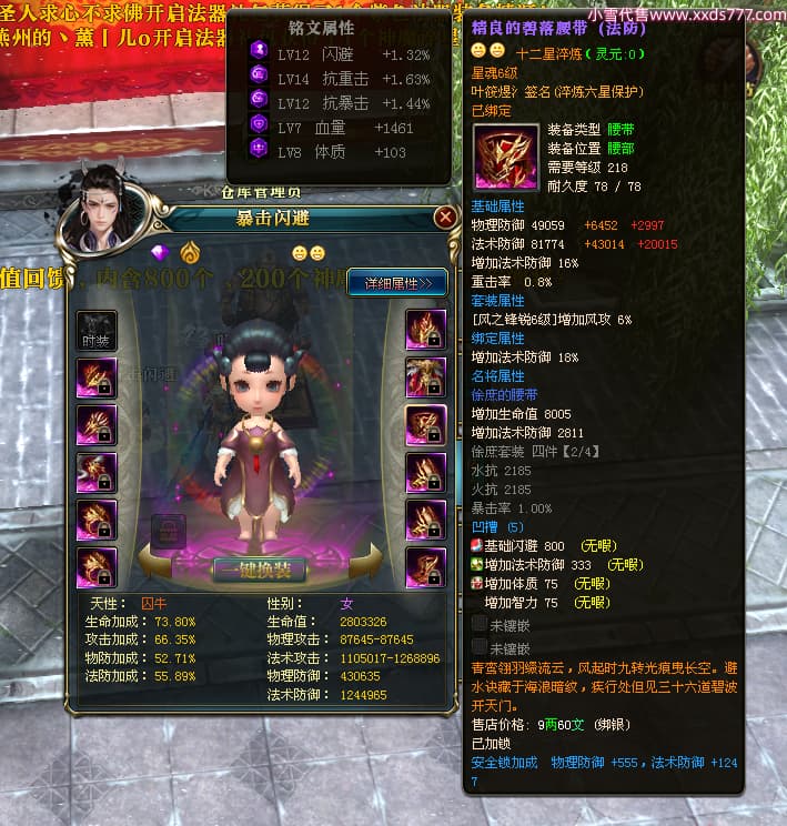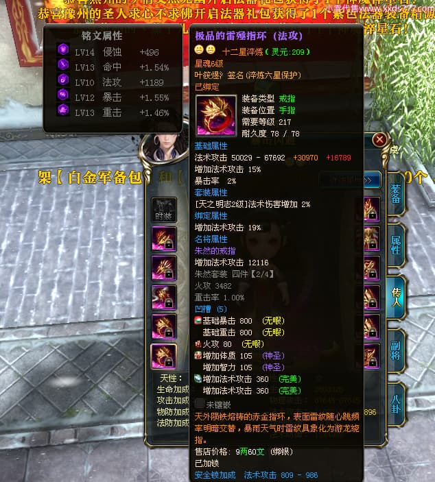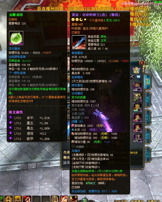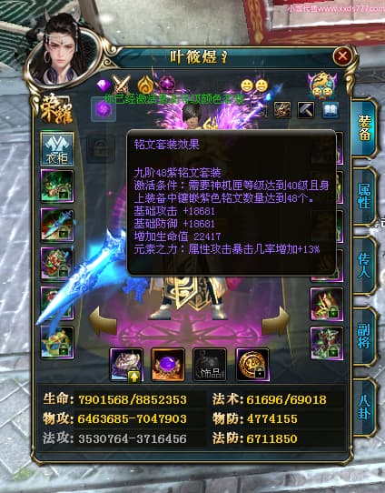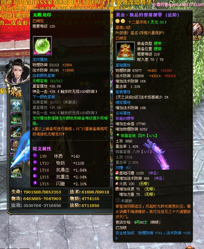 编号W23963 叶筱煜氵 龙舞九州 扬州 8874W战力 人物史诗紫12X(6件15X5件混沌) 传人精良紫12X 副将精良紫12X 马极品紫9X 加强紫13披风 人物星魂13级 传人6级 马星魂6级 人物铭刻3件15级其余12级 点亮1件16星2件14星其余12星 马铭刻9级 点亮10星 人物绿龙印 马蓝龙印 五等单双属性神圣完美无瑕石头