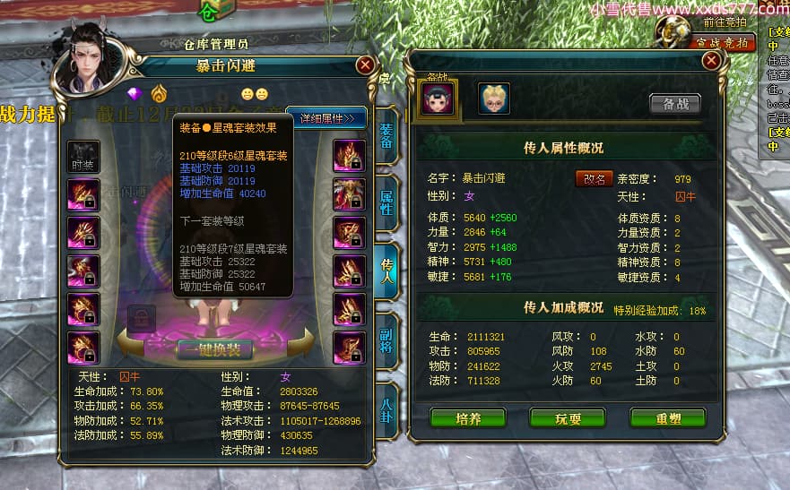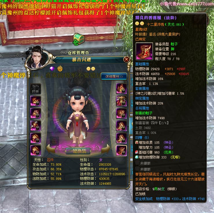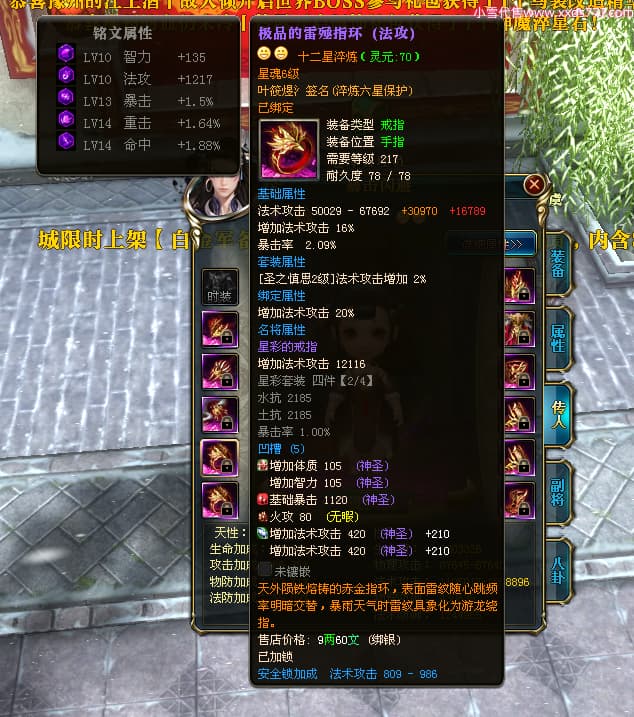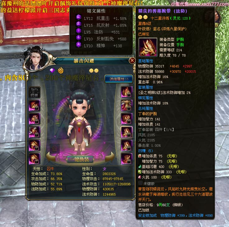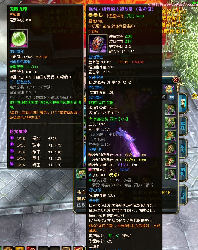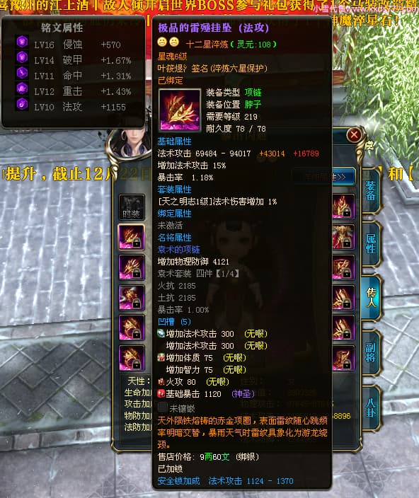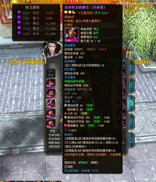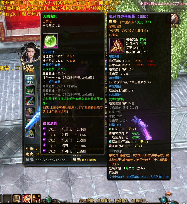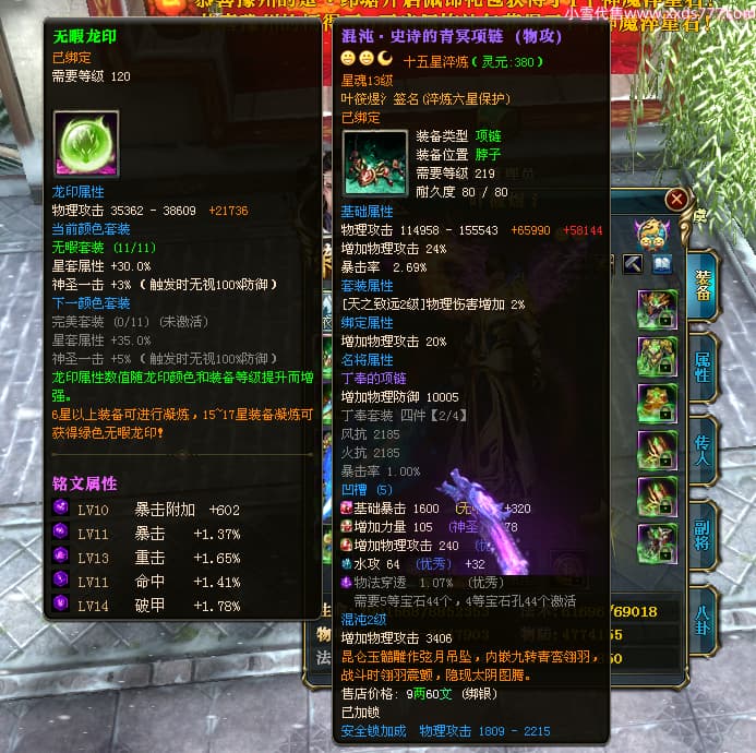 编号W23963 叶筱煜氵 龙舞九州 扬州 8874W战力 人物史诗紫12X(6件15X5件混沌) 传人精良紫12X 副将精良紫12X 马极品紫9X 加强紫13披风 人物星魂13级 传人6级 马星魂6级 人物铭刻3件15级其余12级 点亮1件16星2件14星其余12星 马铭刻9级 点亮10星 人物绿龙印 马蓝龙印 五等单双属性神圣完美无瑕石头
