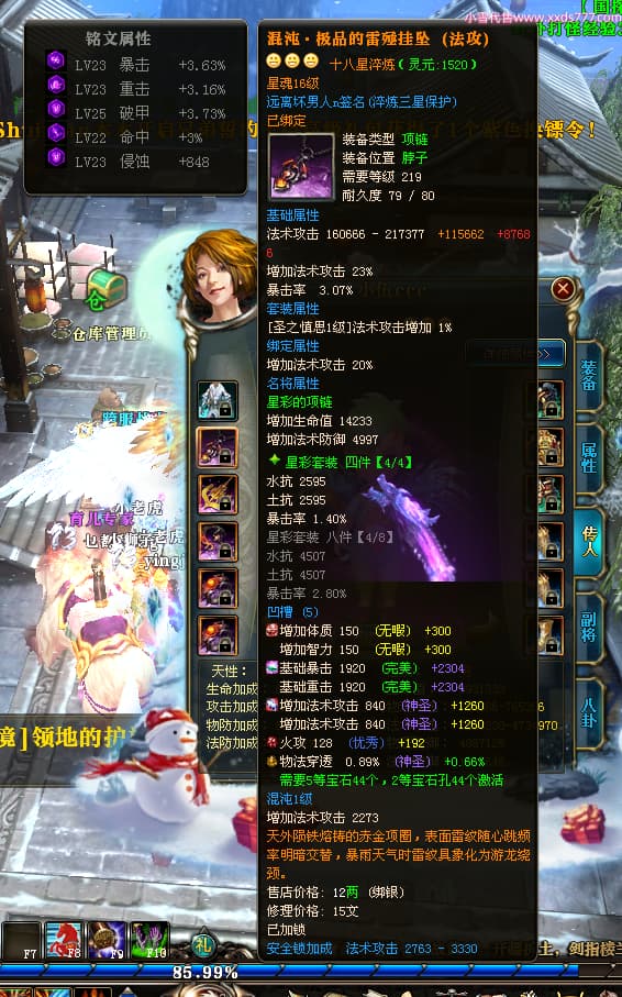 编号T23965 远离坏男人n 龙腾问鼎 江州 世界排名34名 35869W战力 人物混沌极品橙18X 传人黄金精良橙18X 副将精良紫15X 马黄金精良橙14X(双潜能55级55级) 史诗紫17披风 人物星魂16级 传人星魂16级 副将星魂8级 马星魂16级 人物铭刻18级 人物点亮18星 马铭刻15级 点亮14星 人绿龙印(8件紫龙印) 马黄龙印(3件绿龙印) 六等单双属性神圣完美无瑕石头 绿紫孔 已开4次永久18星套