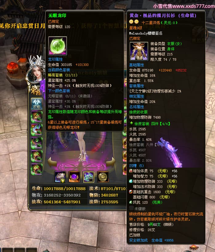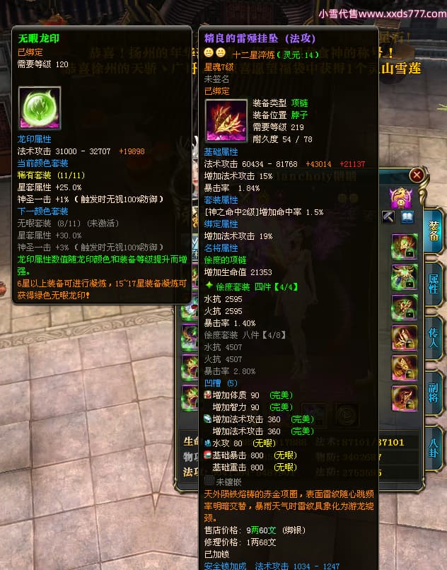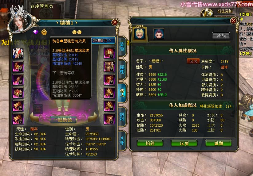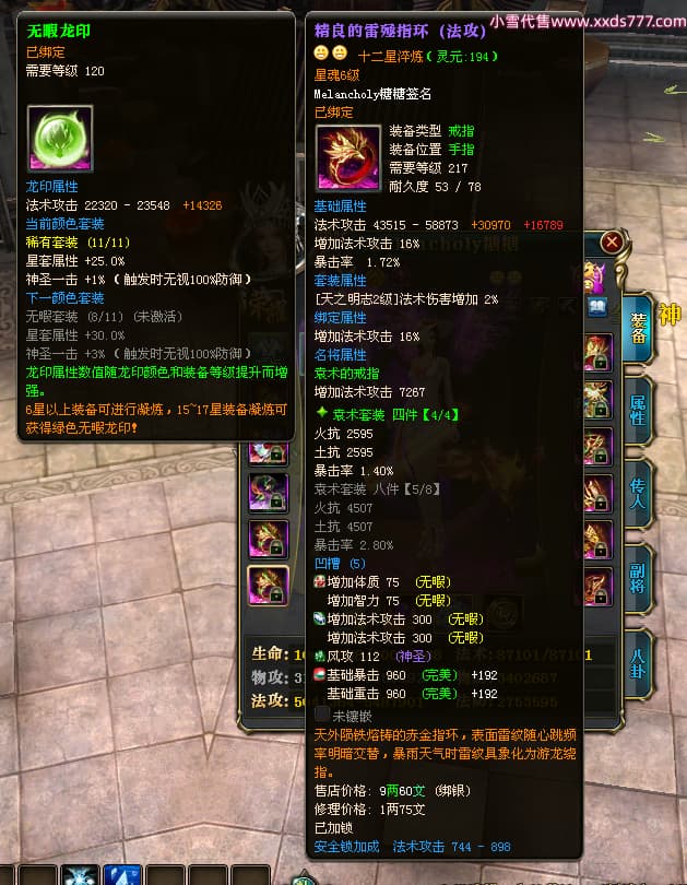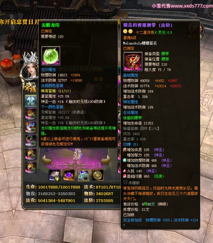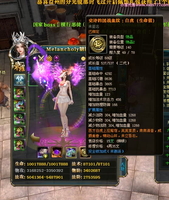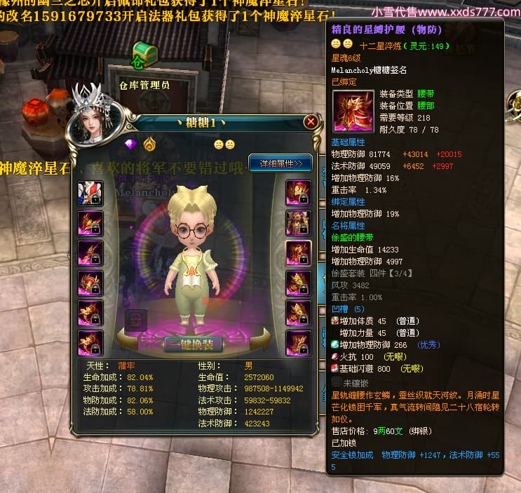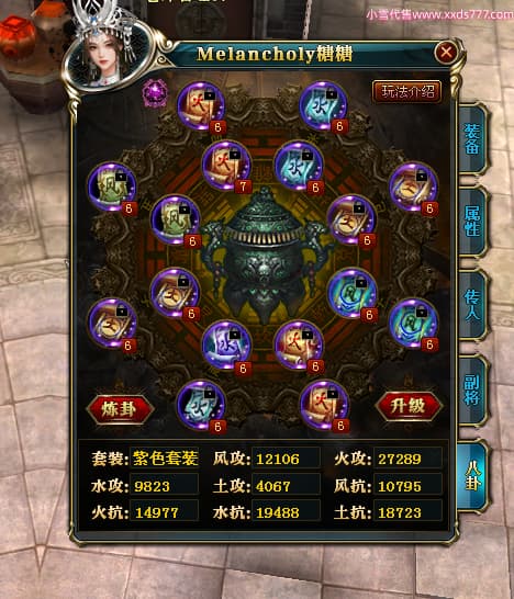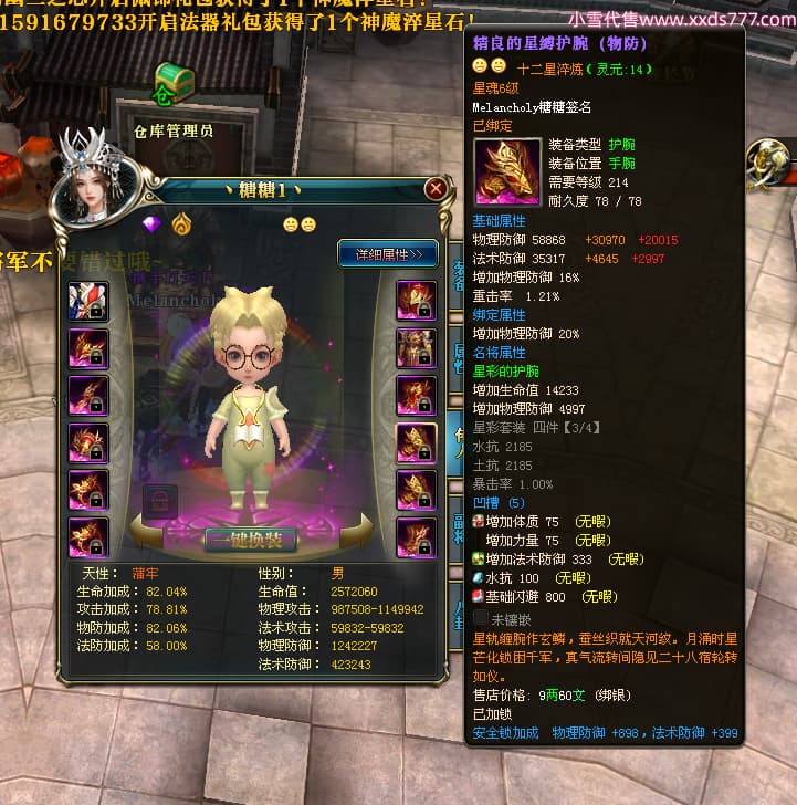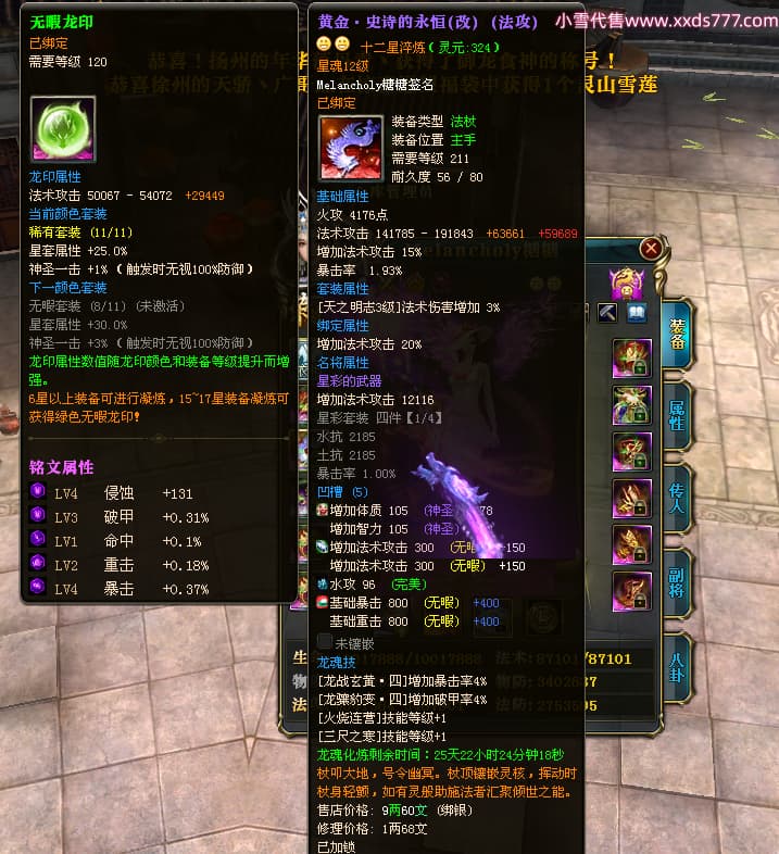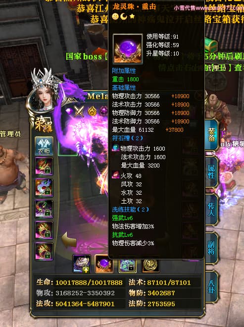 编号W23979 Melancholy糖糖 龙舞九州 幽州 5999W战力 人物精良紫12X 传人精良紫12X 副将精良紫12X 马精良紫9X 加强紫13披风 人物星魂6级 传人6级 马星魂5级 人物铭刻1件14级其余12级 点亮12星 马铭刻10级 点亮10星 人物黄龙印(8件绿龙印) 马蓝龙印 五等单双属性神圣完美无瑕石头