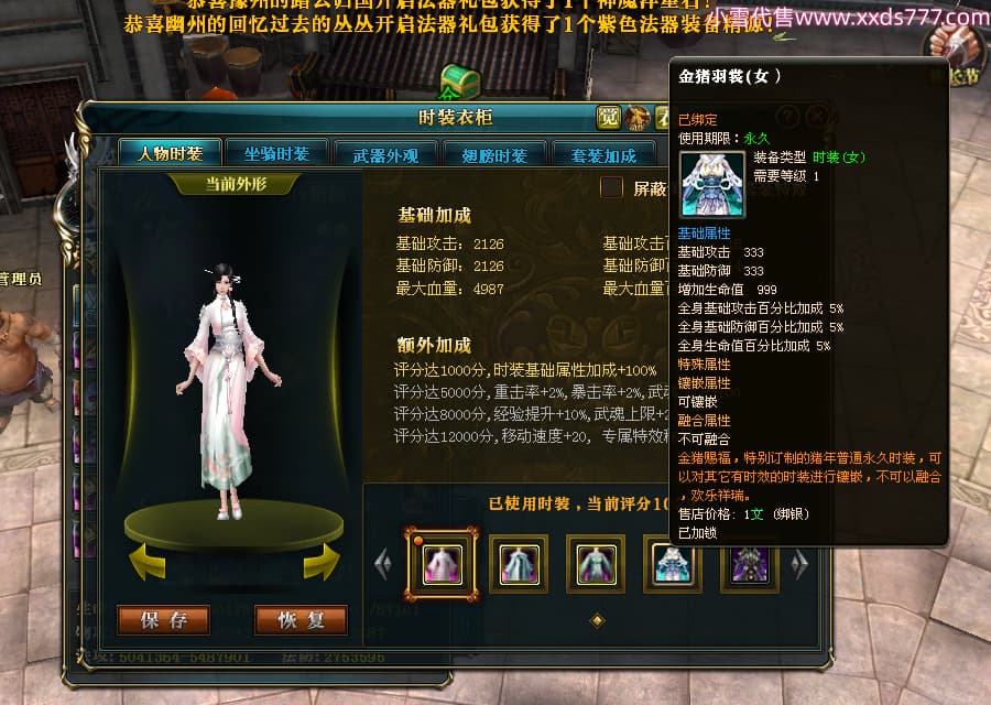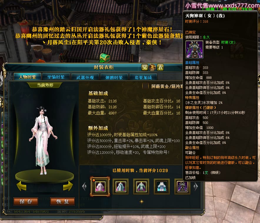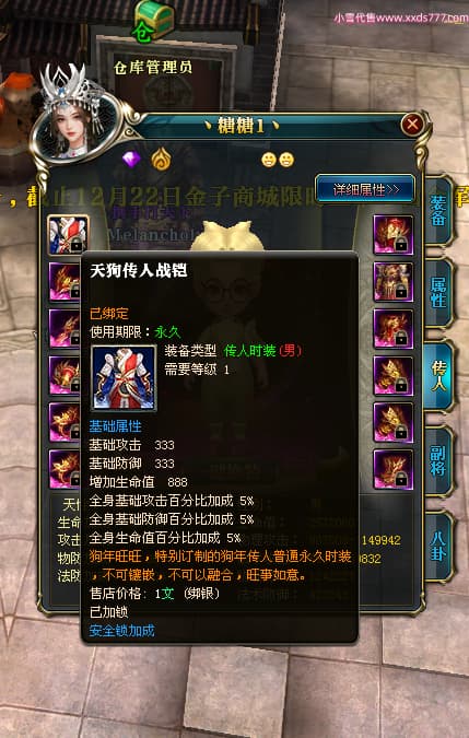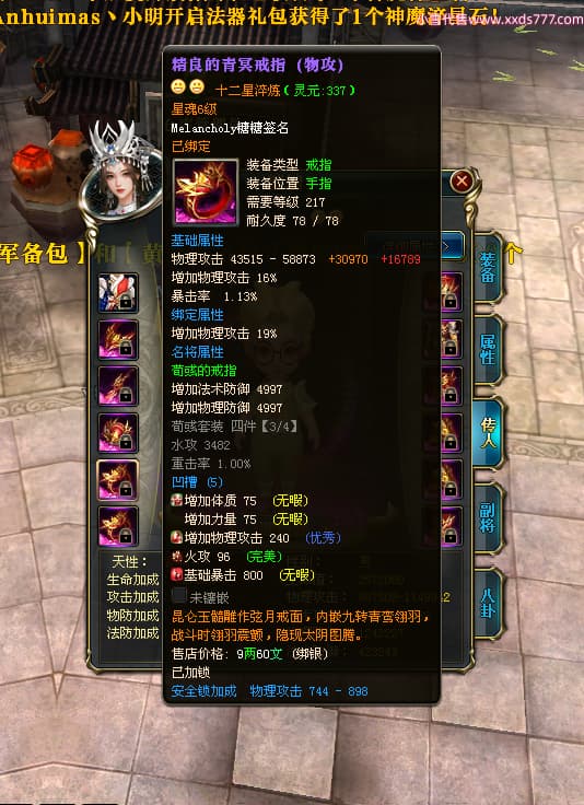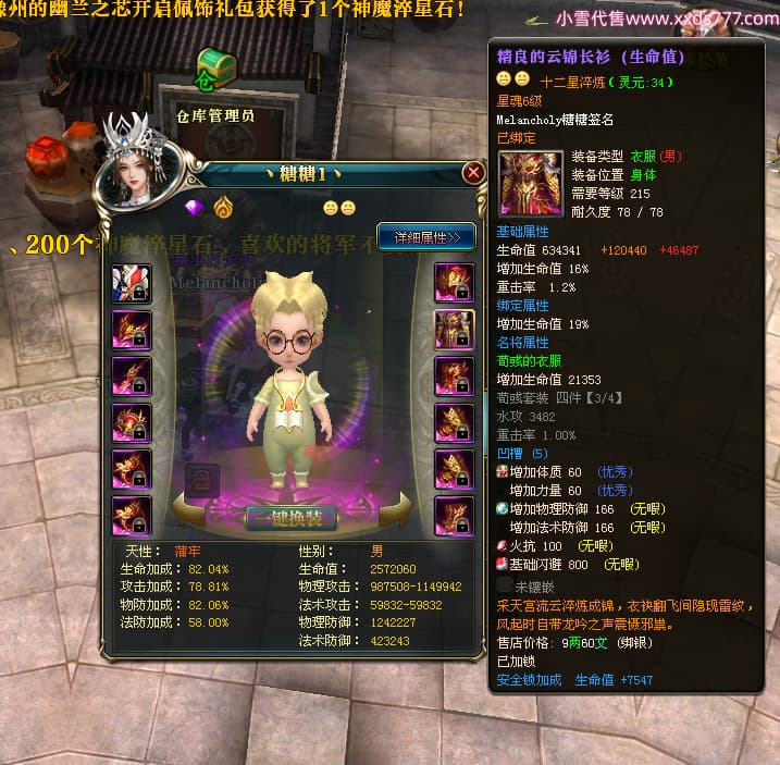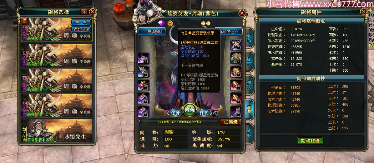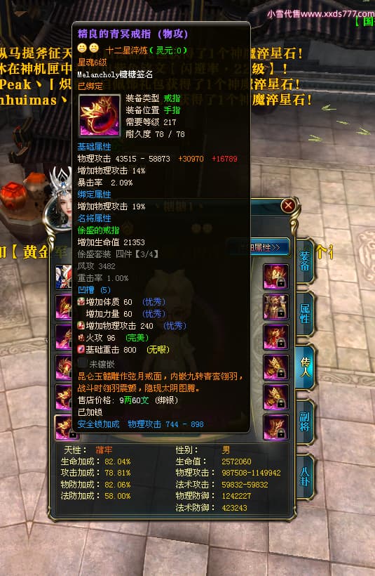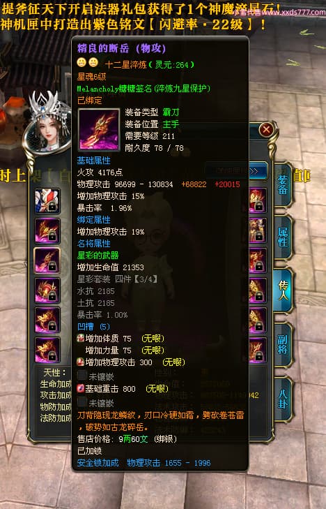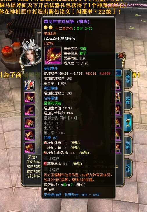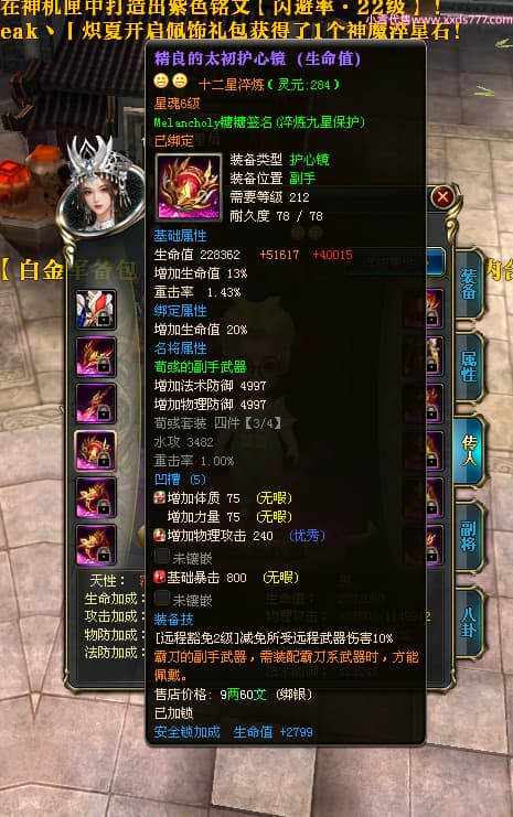 编号W23979 Melancholy糖糖 龙舞九州 幽州 5999W战力 人物精良紫12X 传人精良紫12X 副将精良紫12X 马精良紫9X 加强紫13披风 人物星魂6级 传人6级 马星魂5级 人物铭刻1件14级其余12级 点亮12星 马铭刻10级 点亮10星 人物黄龙印(8件绿龙印) 马蓝龙印 五等单双属性神圣完美无瑕石头