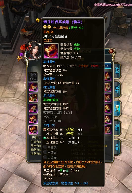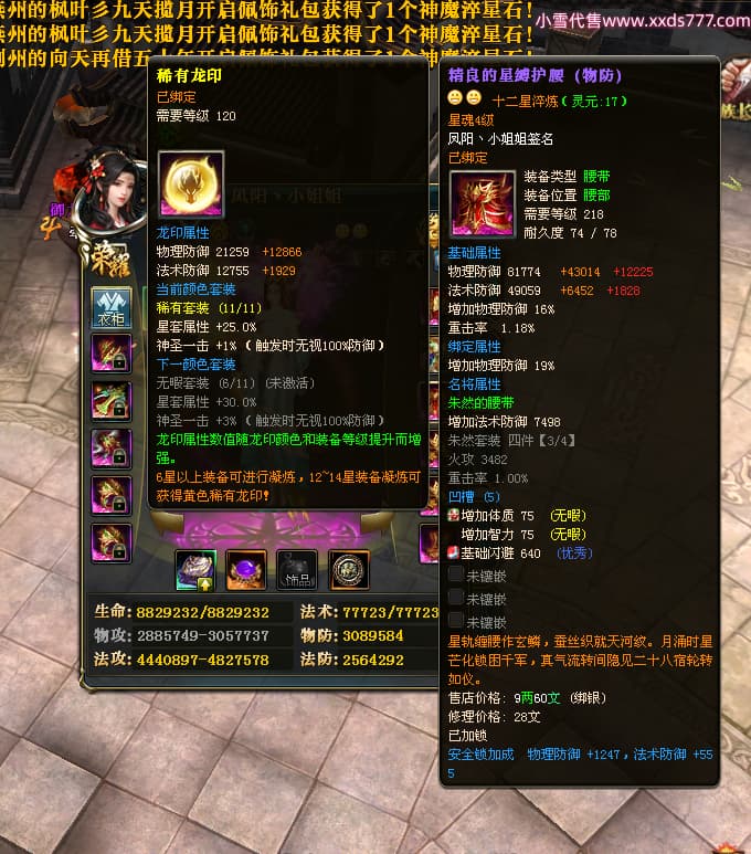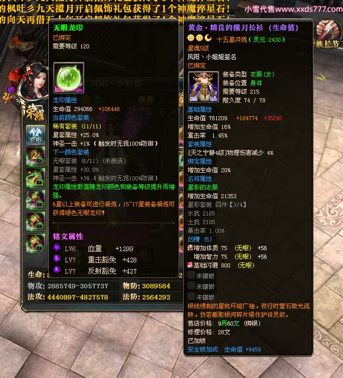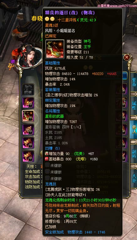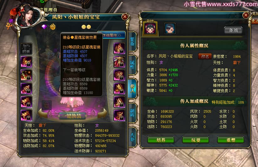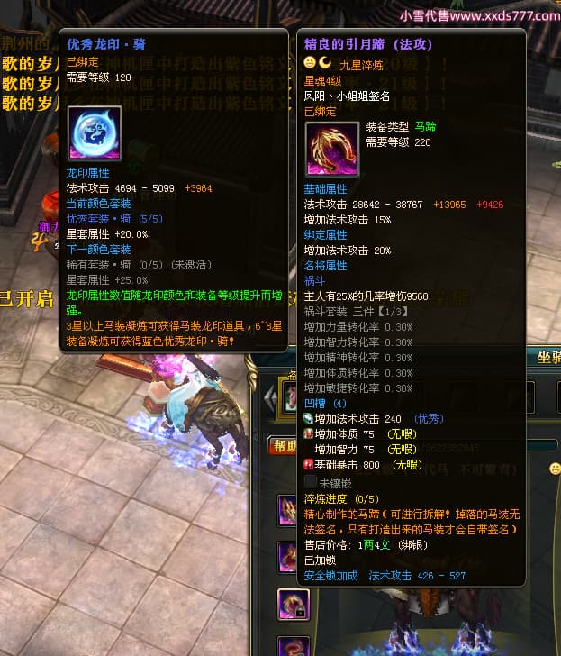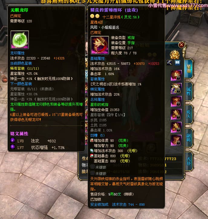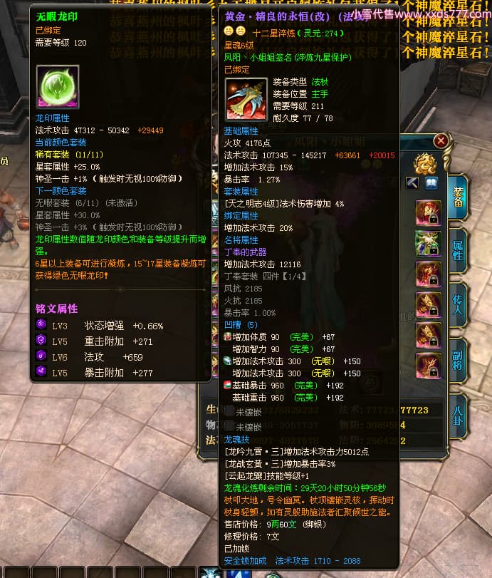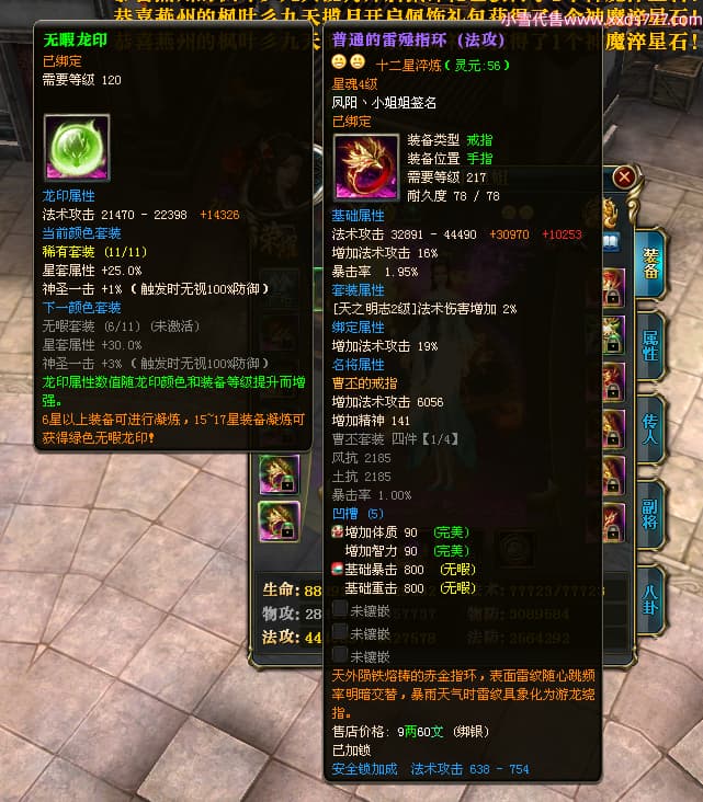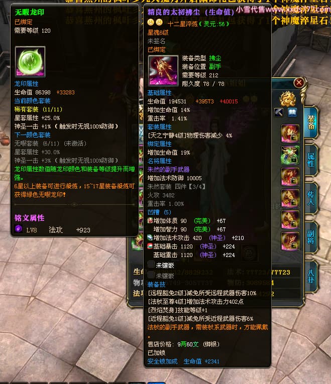编号W23982 凤阳丶小姐姐 龙舞九州 幽州 5016W战力 人物精良紫12X(1件15X) 传人精良紫12X 副将加强紫12X 马加强紫9X 人物星魂4级 马星魂4级 人物铭刻12级 点亮12星 马铭刻9级 点亮10星 人物黄龙印(6件绿龙印) 马蓝龙印 五等单双属性神圣完美无瑕石头
