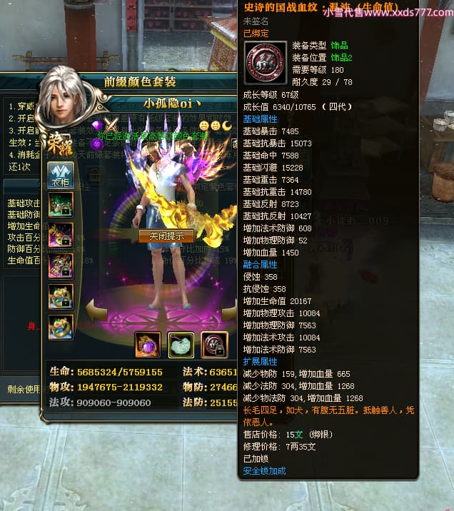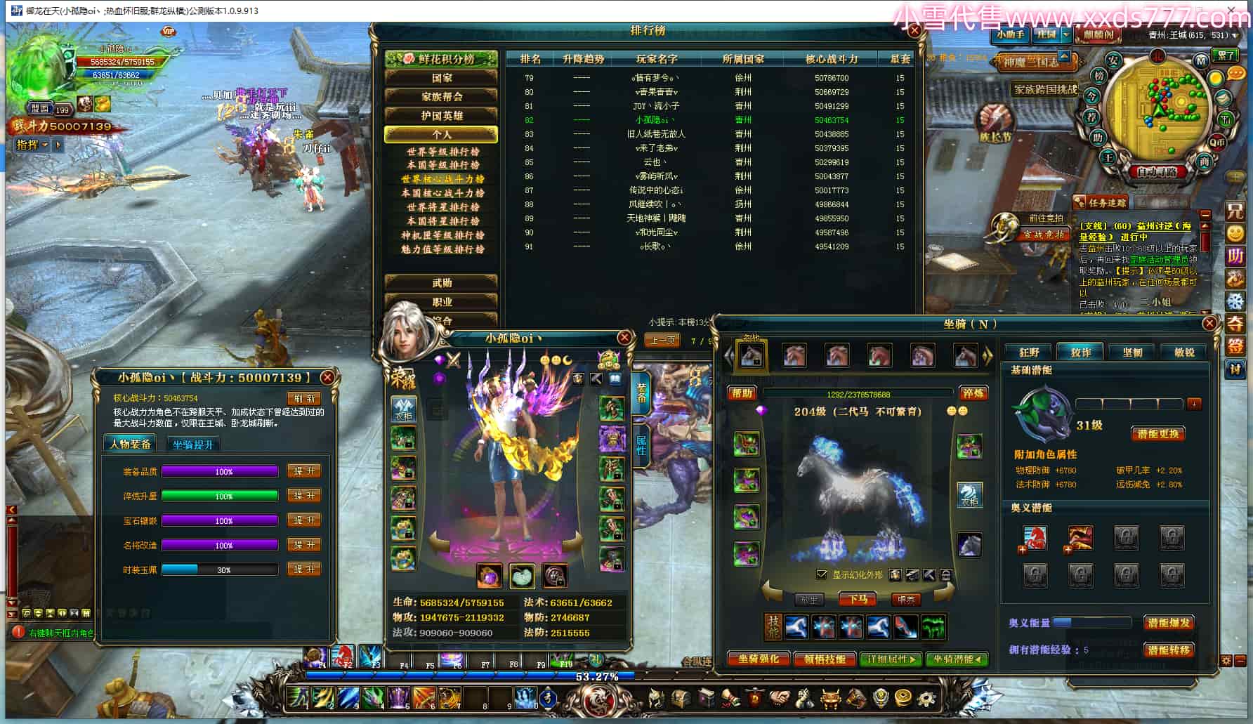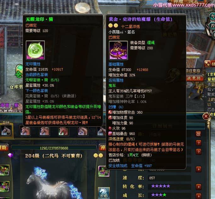 编号Q24004 小孤隐oi丶 群龙纵横 青州 世界排名82名 5000W战力 人物黄金加强橙15X(6件混沌) 马黄金史诗紫12X 人物绿龙印(1件紫龙印) 马绿龙印 六等单双属性石头 已开完永久15星套 可以转移百分百安全