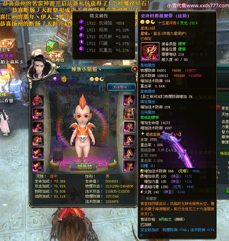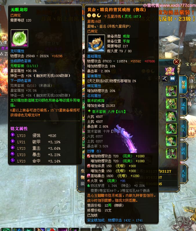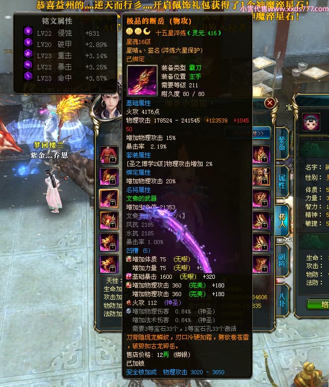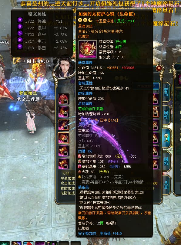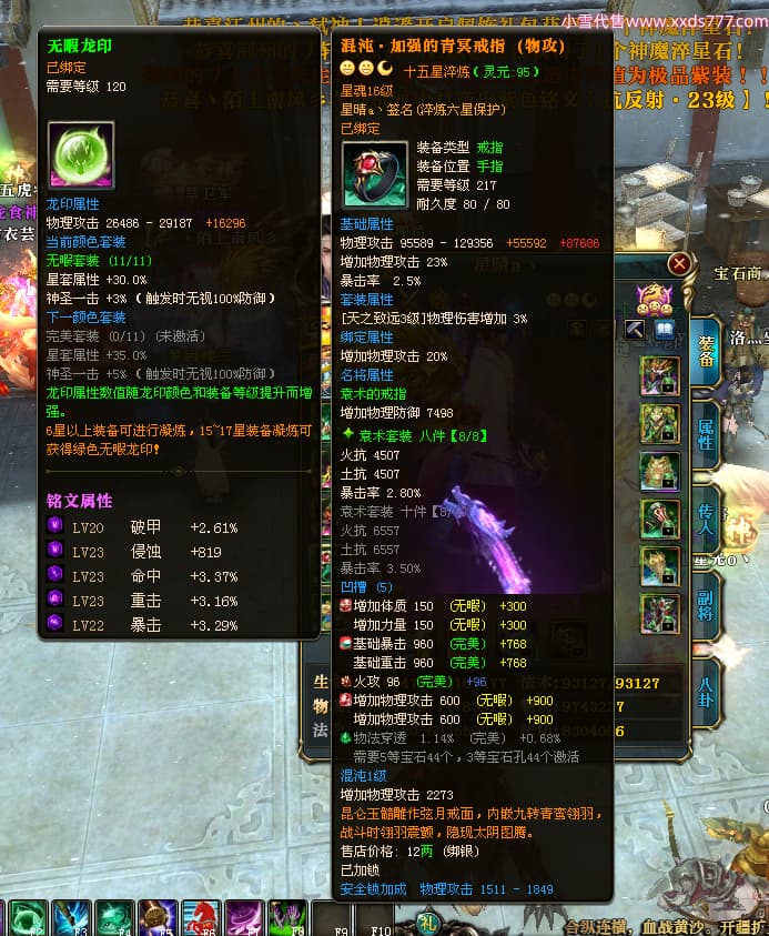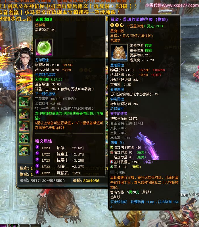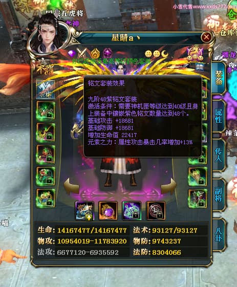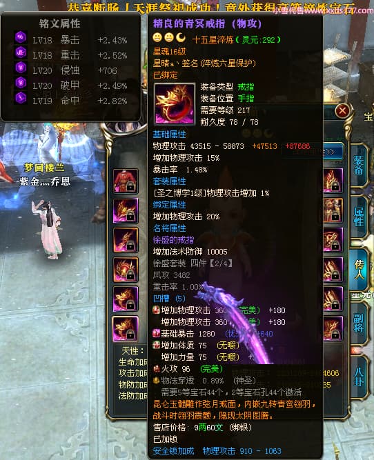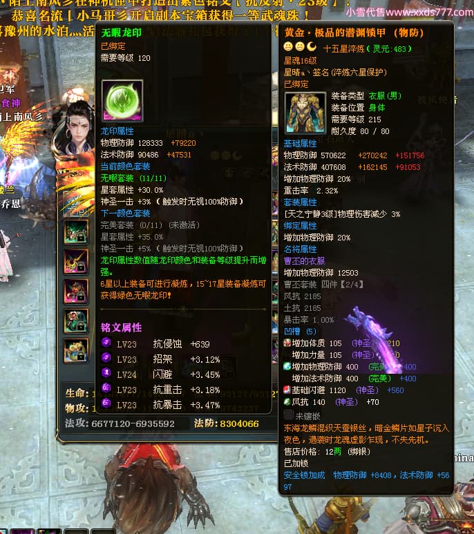 编号W24010 星晴a丶 龙舞九州 扬州 本国排名23名 16715W战力 人物黄金普通橙15X(6件混沌) 传人精良紫15X 副将极品紫12X 马史诗紫11X 精良紫14披风 人物星魂16级 传人星魂16级 副将星魂6级 马星魂12级 人物铭刻15级 点亮16星 马铭刻1件15级其余14级 点亮12星 人物绿龙印 马黄龙印 五六等单双属性神圣完美无暇石头 蓝黄孔