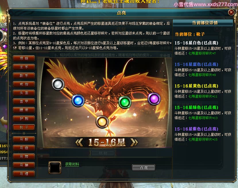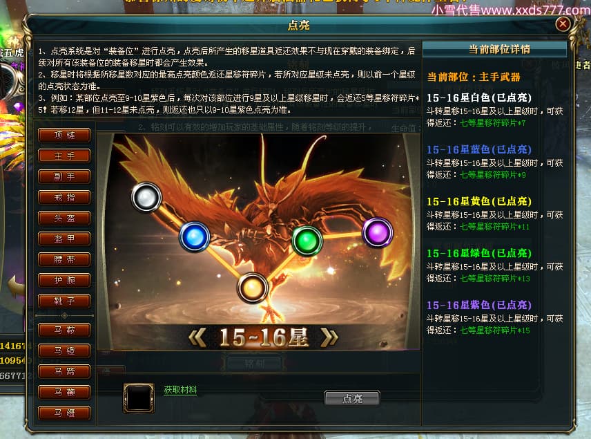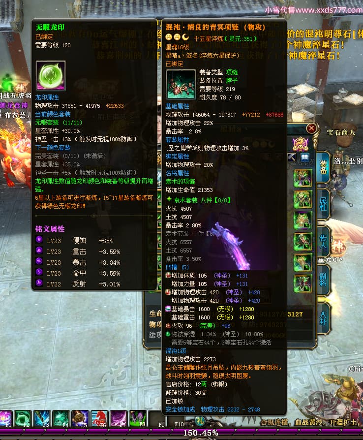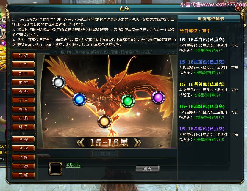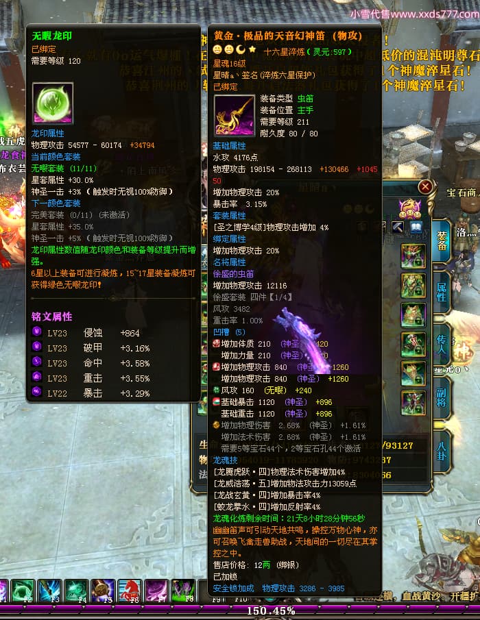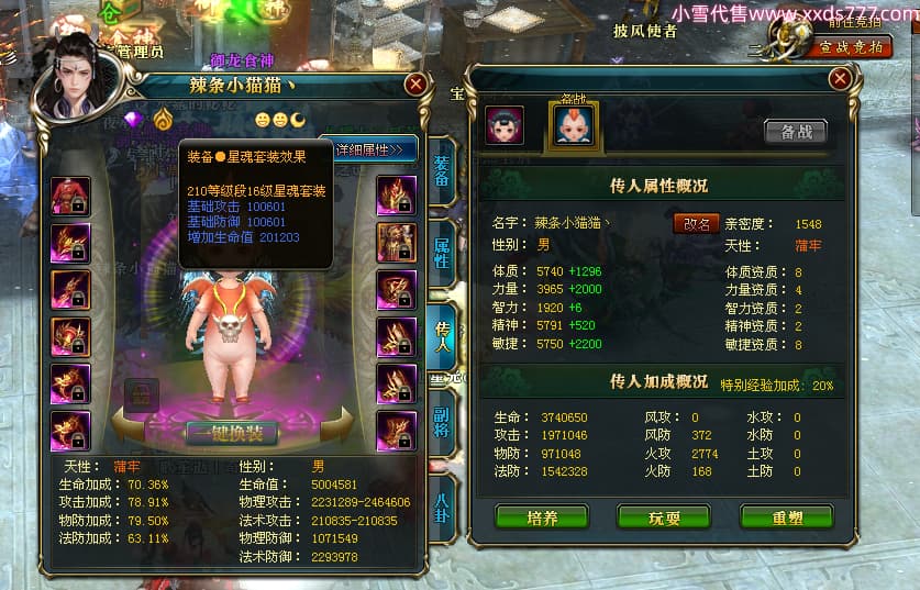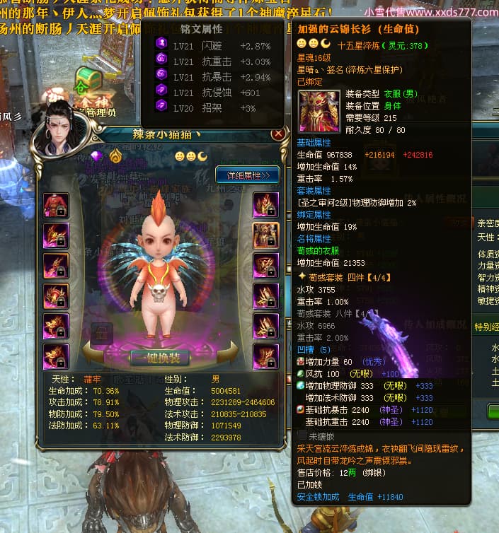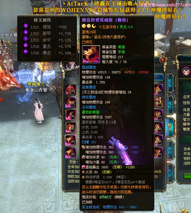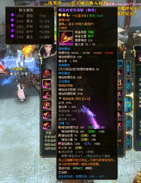 编号W24010 星晴a丶 龙舞九州 扬州 本国排名23名 16715W战力 人物黄金普通橙15X(6件混沌) 传人精良紫15X 副将极品紫12X 马史诗紫11X 精良紫14披风 人物星魂16级 传人星魂16级 副将星魂6级 马星魂12级 人物铭刻15级 点亮16星 马铭刻1件15级其余14级 点亮12星 人物绿龙印 马黄龙印 五六等单双属性神圣完美无暇石头 蓝黄孔