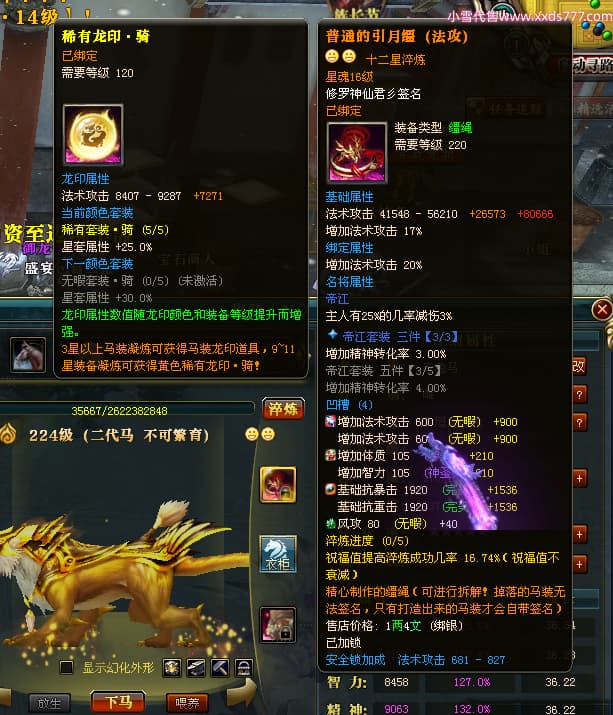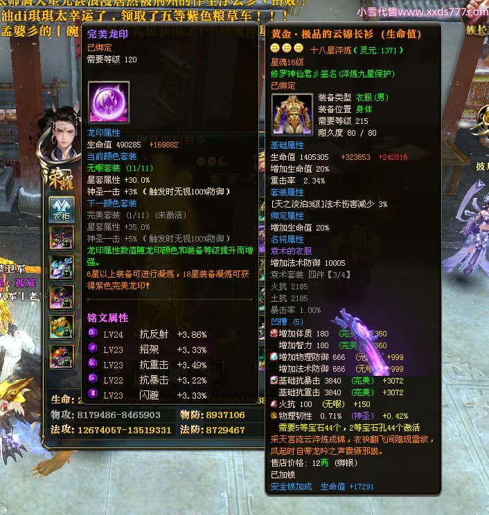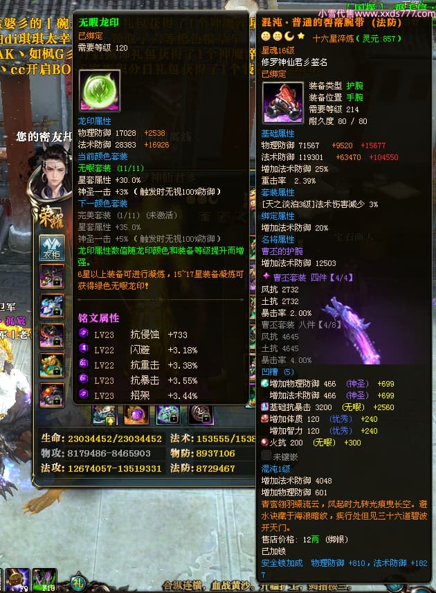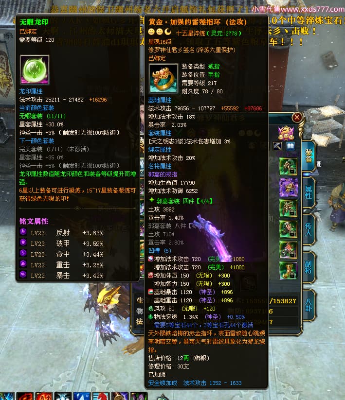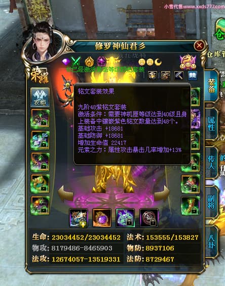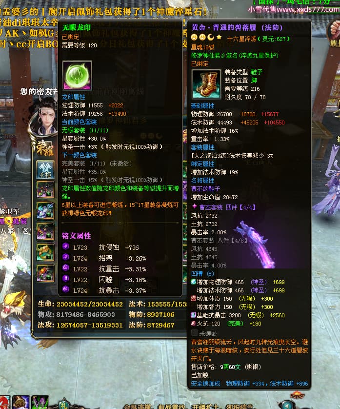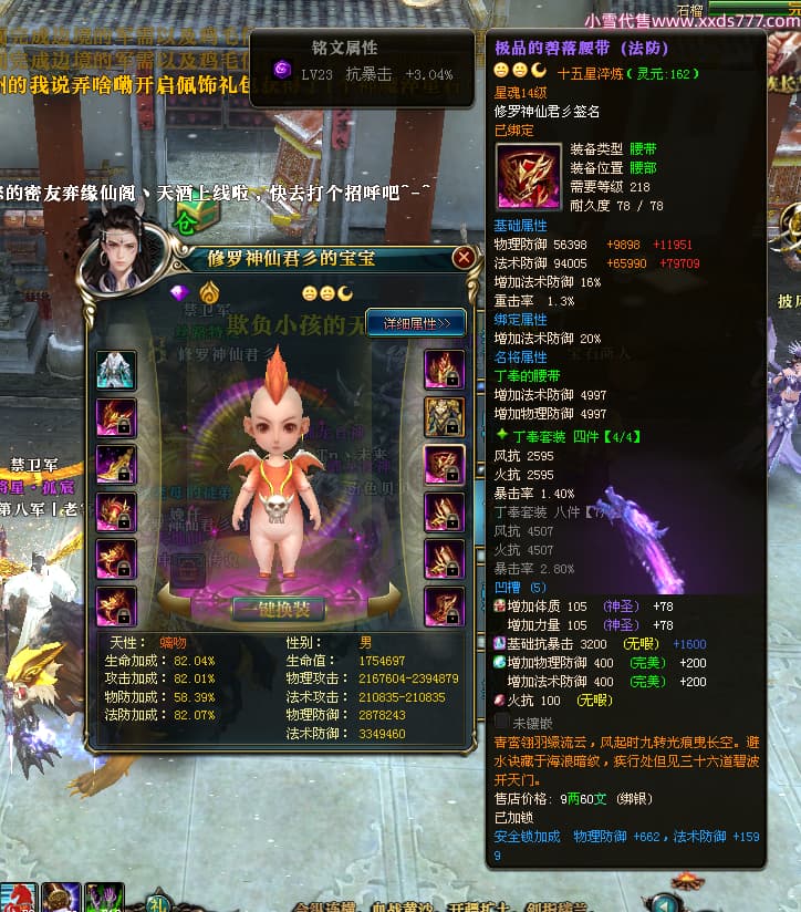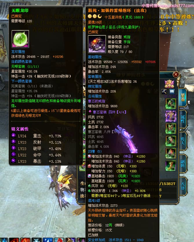 编号Z24021 修罗神仙君彡 逐鹿天下 益州 本国排名第12名 20247W战力 人物黄金普通橙15X(2件18X7件混沌) 传人极品紫15X 副将极品紫15X 马普通橙12X 极品紫15披风 人物星魂16级 传人10级 副将6级 马星魂16级 人物铭刻3件16级其余15级 点亮6件16星其余14星 马铭刻1件14级1件13级3件12级 点亮1件14星其余12星 人物绿龙印(1件紫龙印) 马黄龙印 六等单双属性神圣完美无暇石头 黄孔