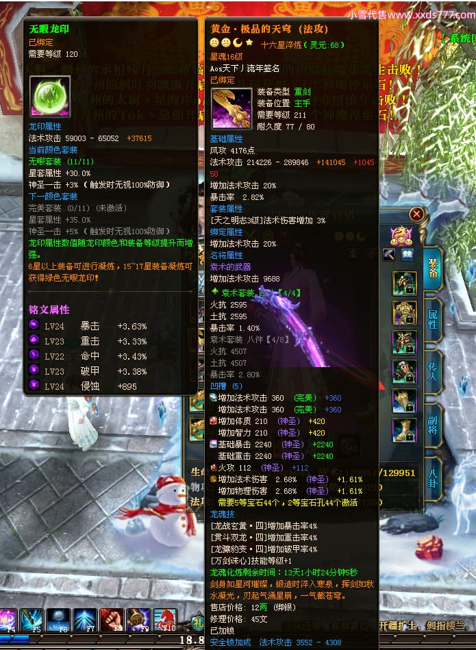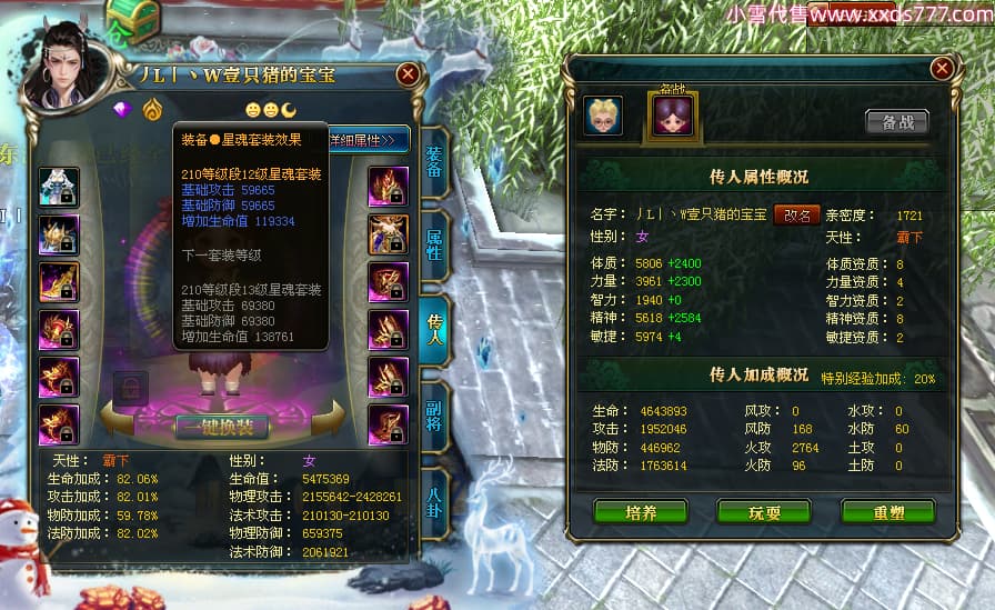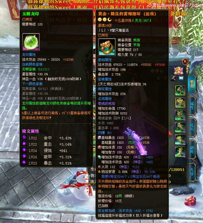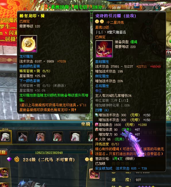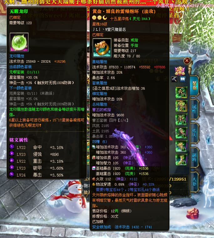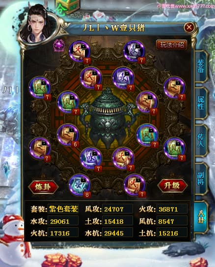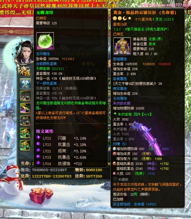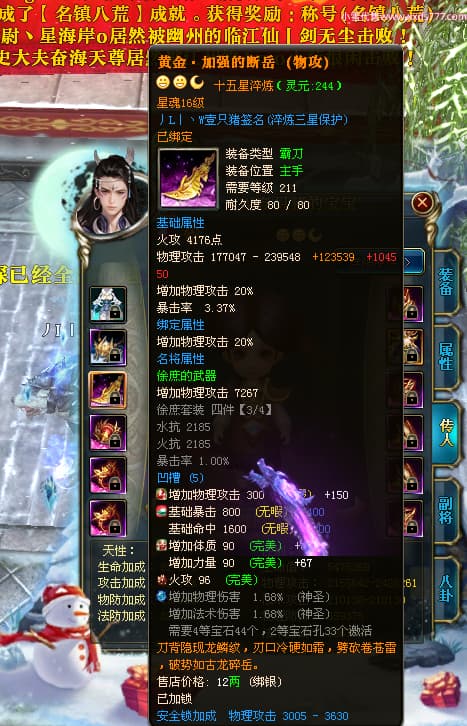 编号X24024 丿L丨丶W壹只猪 龙啸风云 益州 本国排名37名 19141W战力 人物黄金史诗紫15X(5件混沌) 传人精良紫15X 副将精良紫12X 马史诗紫12X 精良紫15披风 人物星魂16级 传人星魂12级 副将星魂6级 马星魂12级 人物铭刻1件16级其余15级 人物点亮7件16星其余14星 马铭刻13级 点亮12星 人物绿龙印 马黄龙印 五六等单双属性神圣完美优秀石头 黄蓝孔