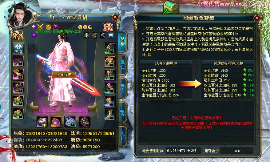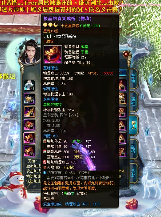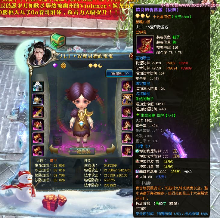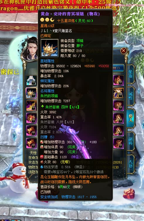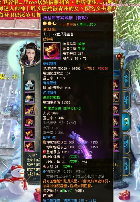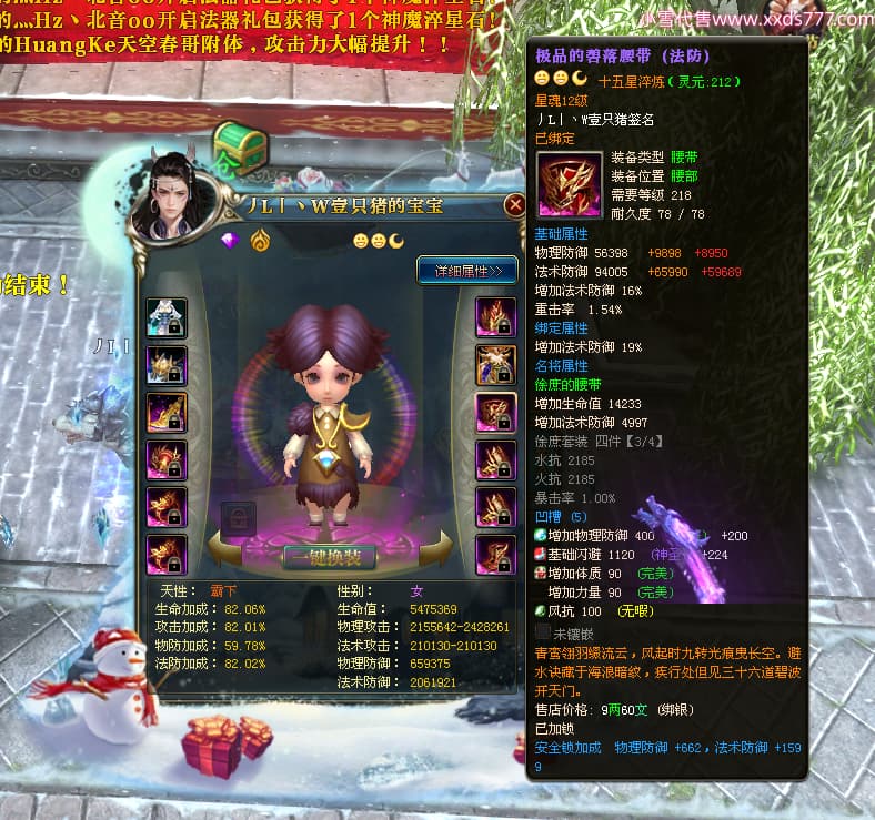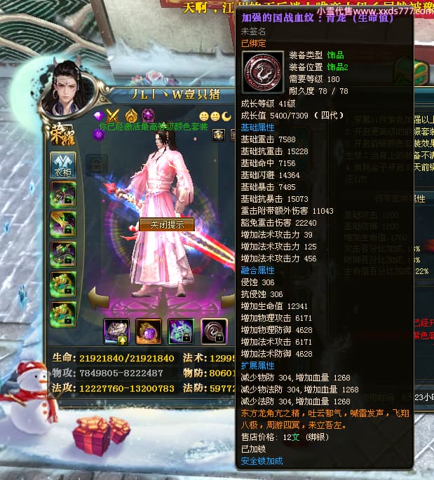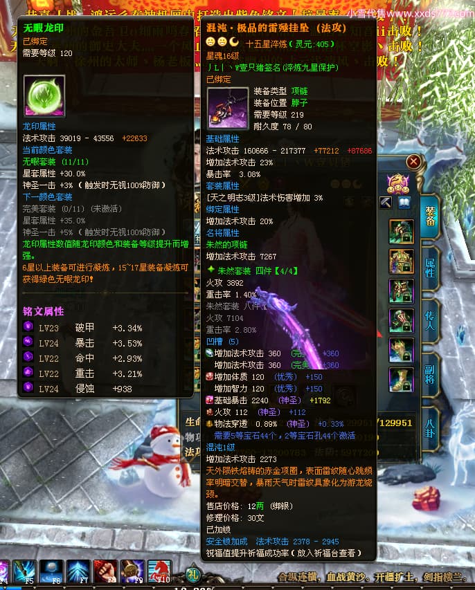 编号X24024 丿L丨丶W壹只猪 龙啸风云 益州 本国排名37名 19141W战力 人物黄金史诗紫15X(5件混沌) 传人精良紫15X 副将精良紫12X 马史诗紫12X 精良紫15披风 人物星魂16级 传人星魂12级 副将星魂6级 马星魂12级 人物铭刻1件16级其余15级 人物点亮7件16星其余14星 马铭刻13级 点亮12星 人物绿龙印 马黄龙印 五六等单双属性神圣完美优秀石头 黄蓝孔