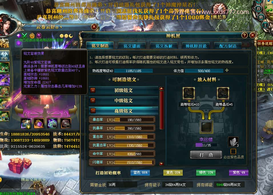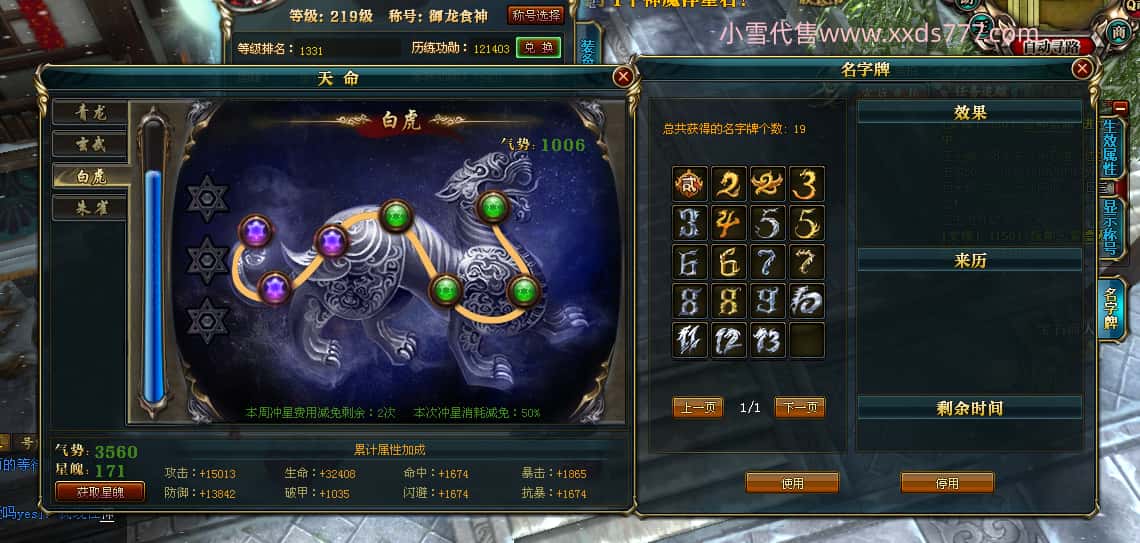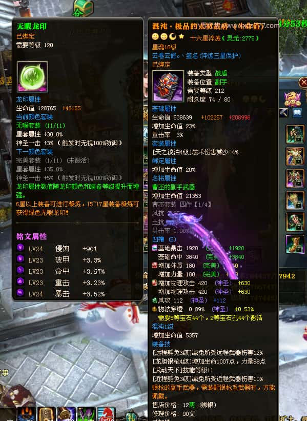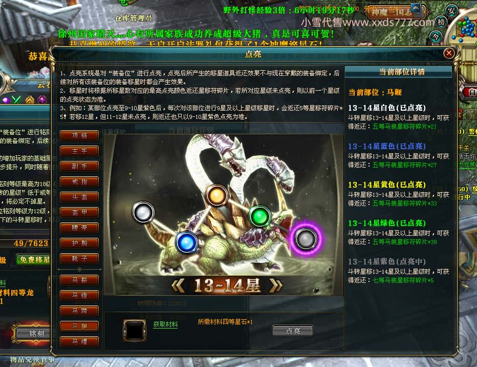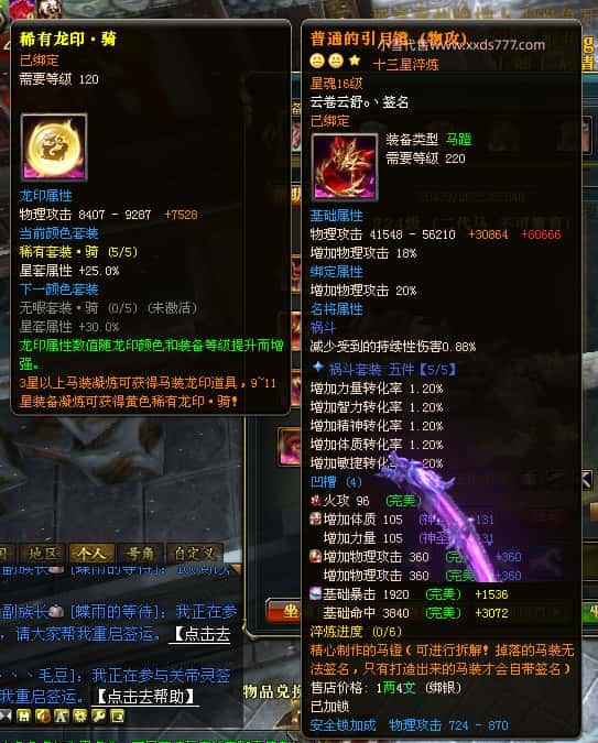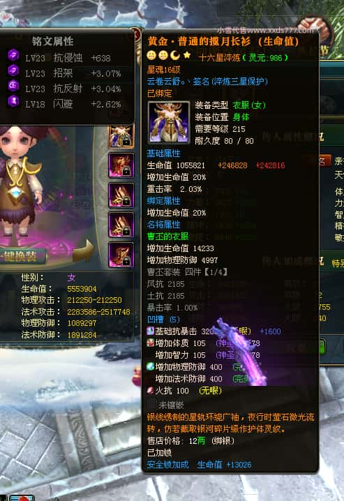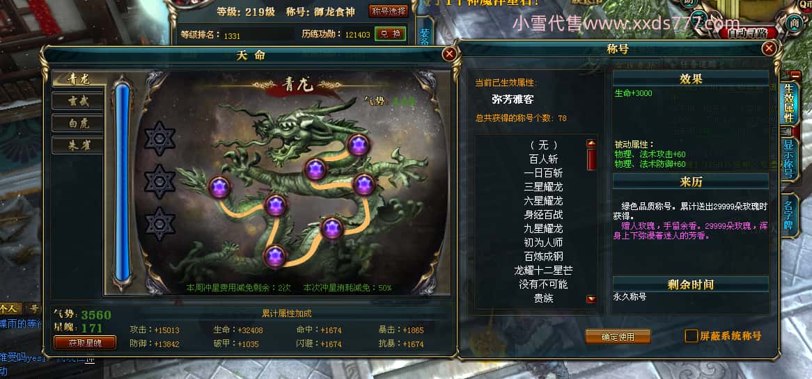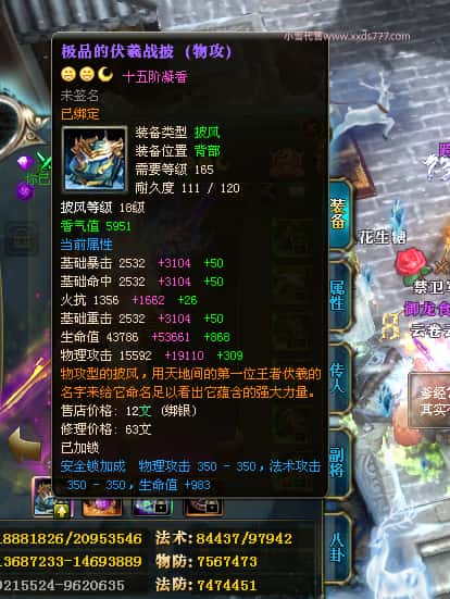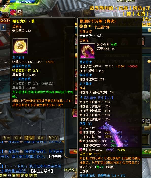 编号W24050 云卷云舒o丶 龙舞九州 徐州 本国排名6名 20142W战力 人物黄金普通紫15X(5件混沌) 传人极品紫15X 副将精良紫15X 马普通橙13X 极品紫15披风 人物星魂16级 传人星魂12级 副将星魂6级 马星魂16级 人物铭刻15级 点亮16星 马铭刻13级 马鞍马镫马蒂点亮14马鞭14星点亮绿色马缰12星 人物绿龙印(1件紫龙印) 马黄龙印 五六等单双属性神圣完美无暇石头 黄蓝孔 已开5次永久15星套