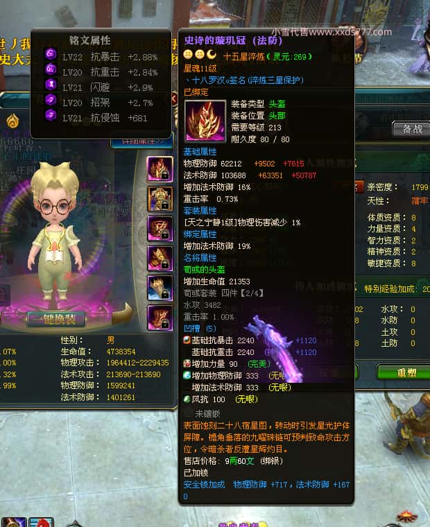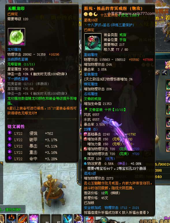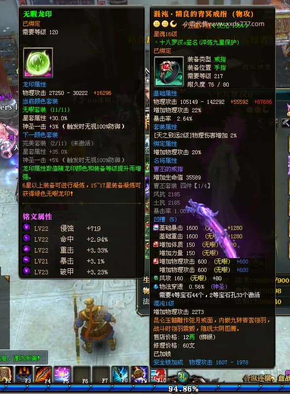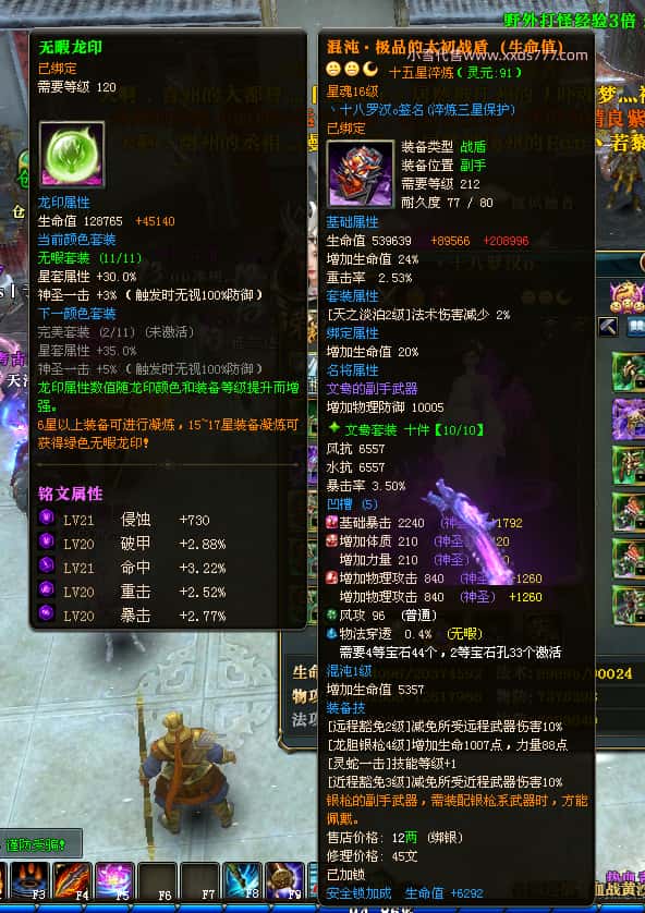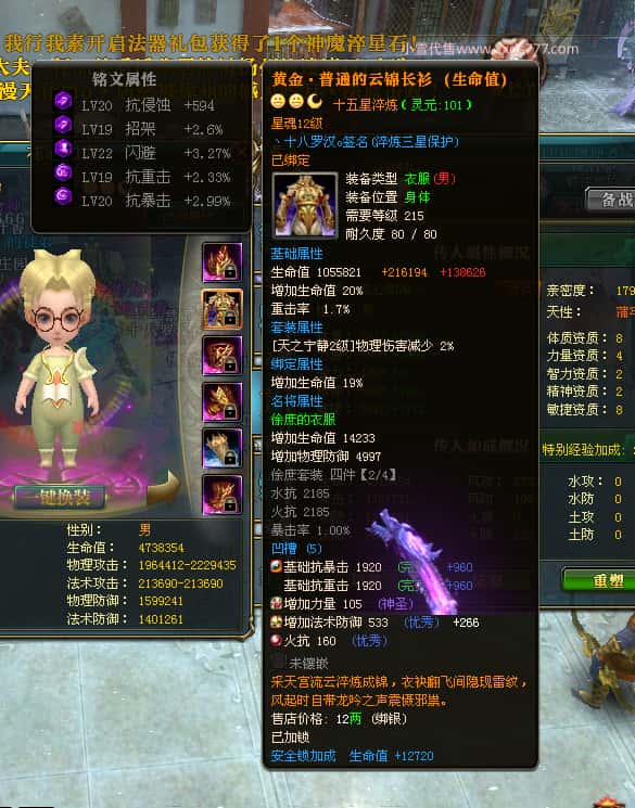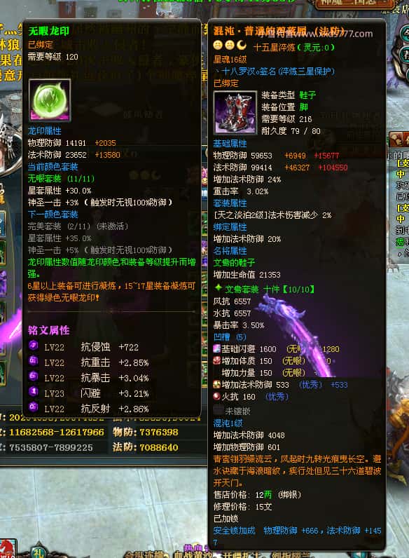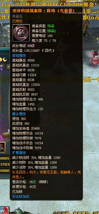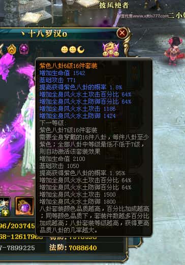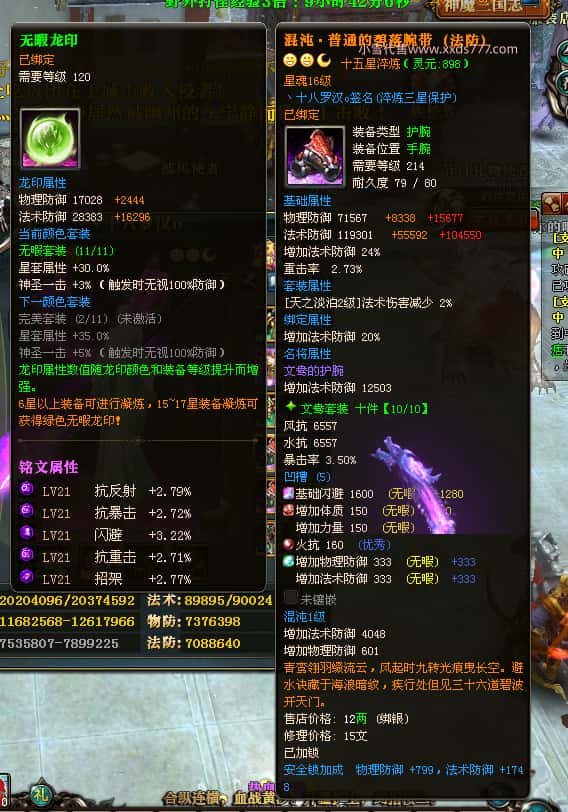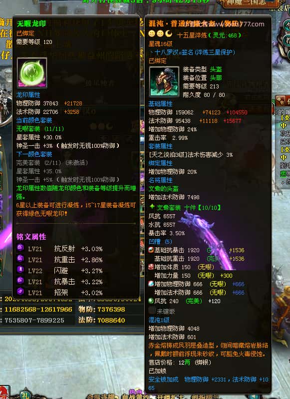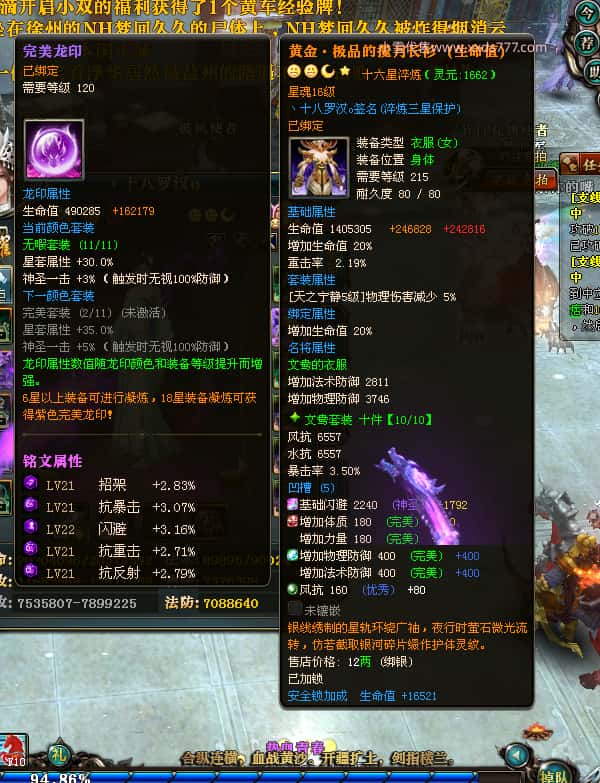 编号X24060 丶十八罗汉o 龙啸风云 荆州 本国排名33名 17117W战力 人物黄金普通橙15X(9件混沌) 传人史诗紫15X 副将极品紫12X 马史诗12X 精良紫15披风 人物星魂16级 传人星魂11级 副将星魂6级 马星魂12级 人物铭刻1件17级2件16级其余15级 点亮16星 马铭刻12级 点亮马鞍马镫14星剩下12星 人物绿龙印(武器衣服紫) 马黄龙印 五六等单双属性神圣完美无暇石头 黄蓝孔