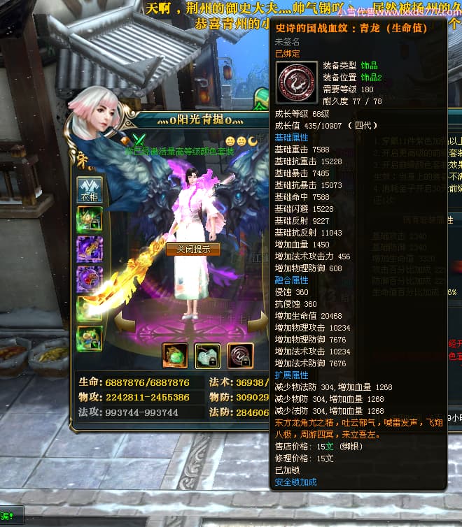 编号L24076 灬o阳光青提o灬 龙战王者 扬州 世界排名88名 5872W战力 人物黄金极品橙15X(6件混沌) 马黄金极品橙12X 人物绿龙印(3件紫龙印) 马黄龙印 六等单双属性石头 已开启永久15星套