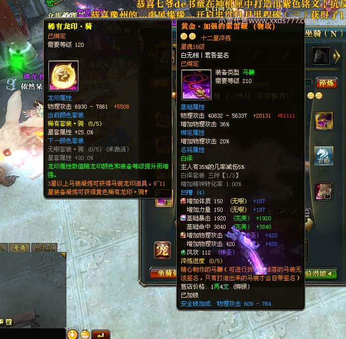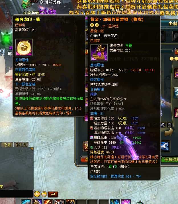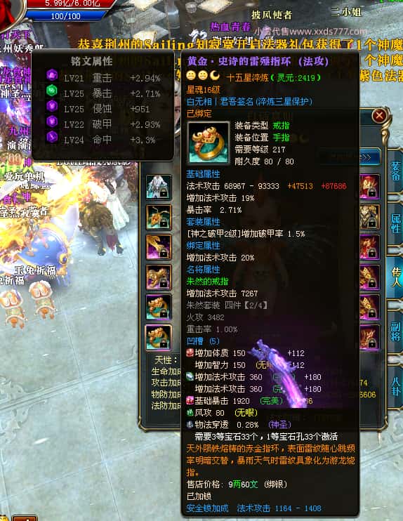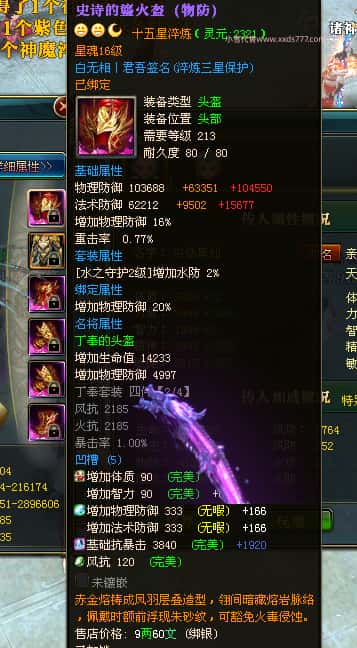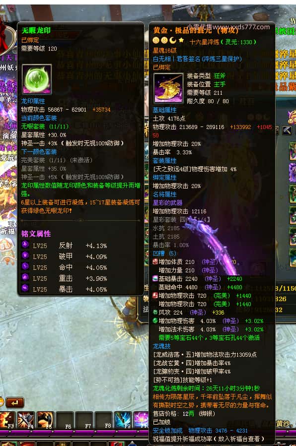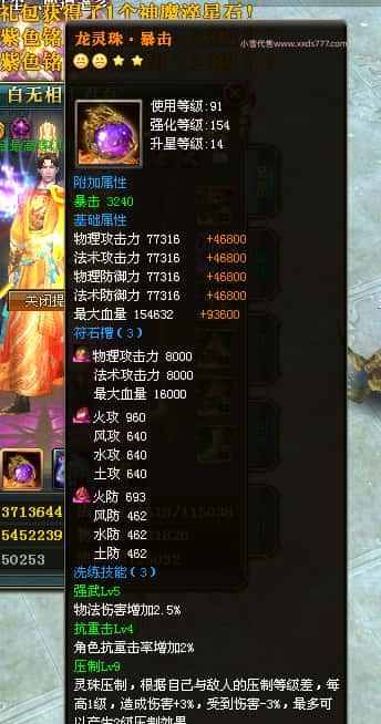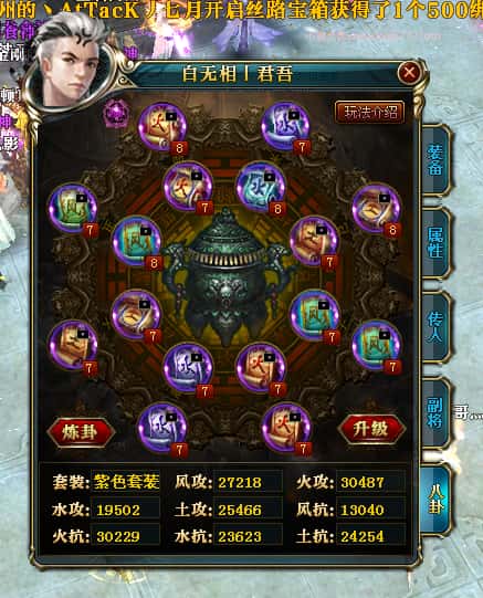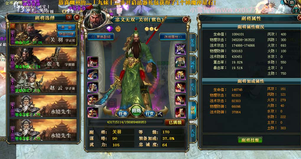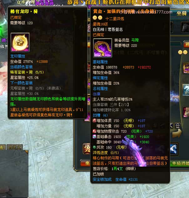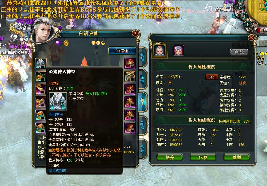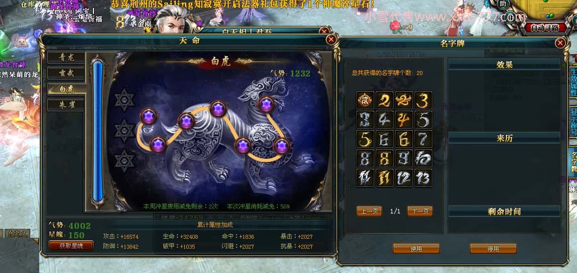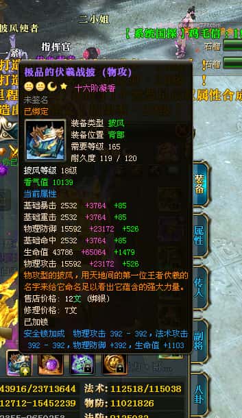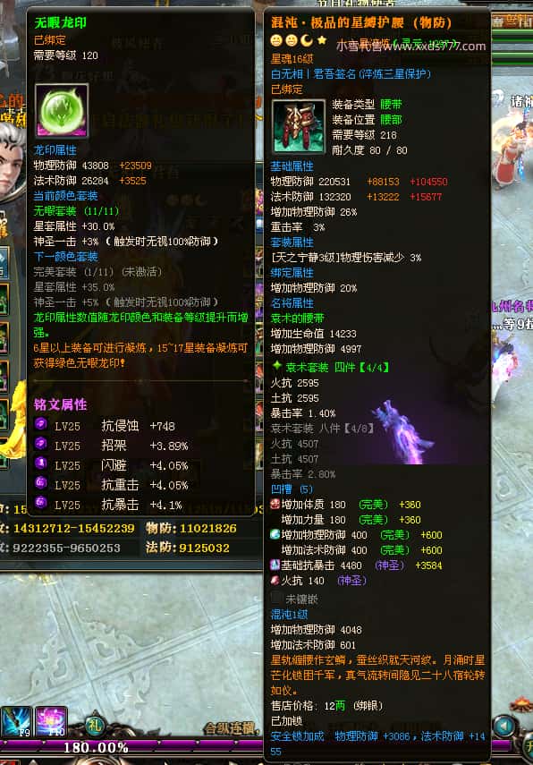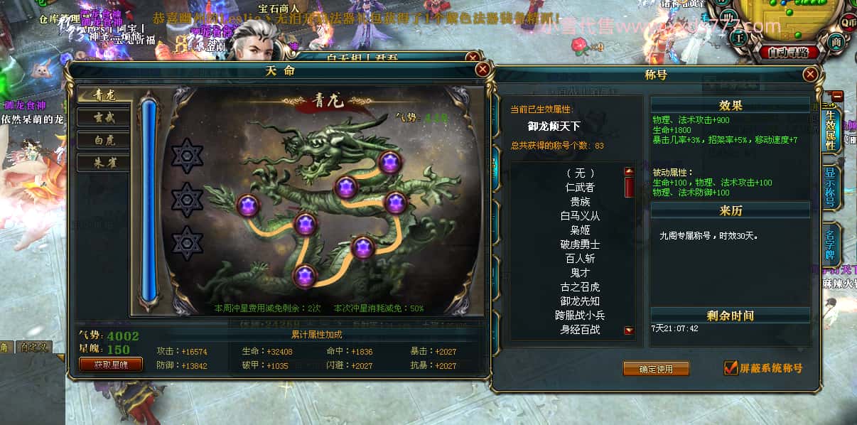 编号W24085 白无相丨君吾 龙舞九州 荆州 世界排名79名 24502W战力 人物黄金精良橙15X(7件混沌) 传人极品紫15X 副将精良紫15X 马黄金加强橙12X 极品紫16披风 人物星魂16级 传人星魂16级 副将星魂6级 马星魂16级 人物铭刻15级 点亮16星 马铭刻1件14级其余13级 马点亮2件14星其余12星 人物绿龙印(1件紫龙印) 马黄龙印 五六等单双属性神圣完美无暇石头 黄绿孔