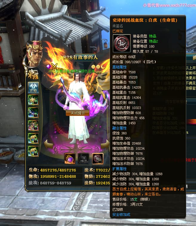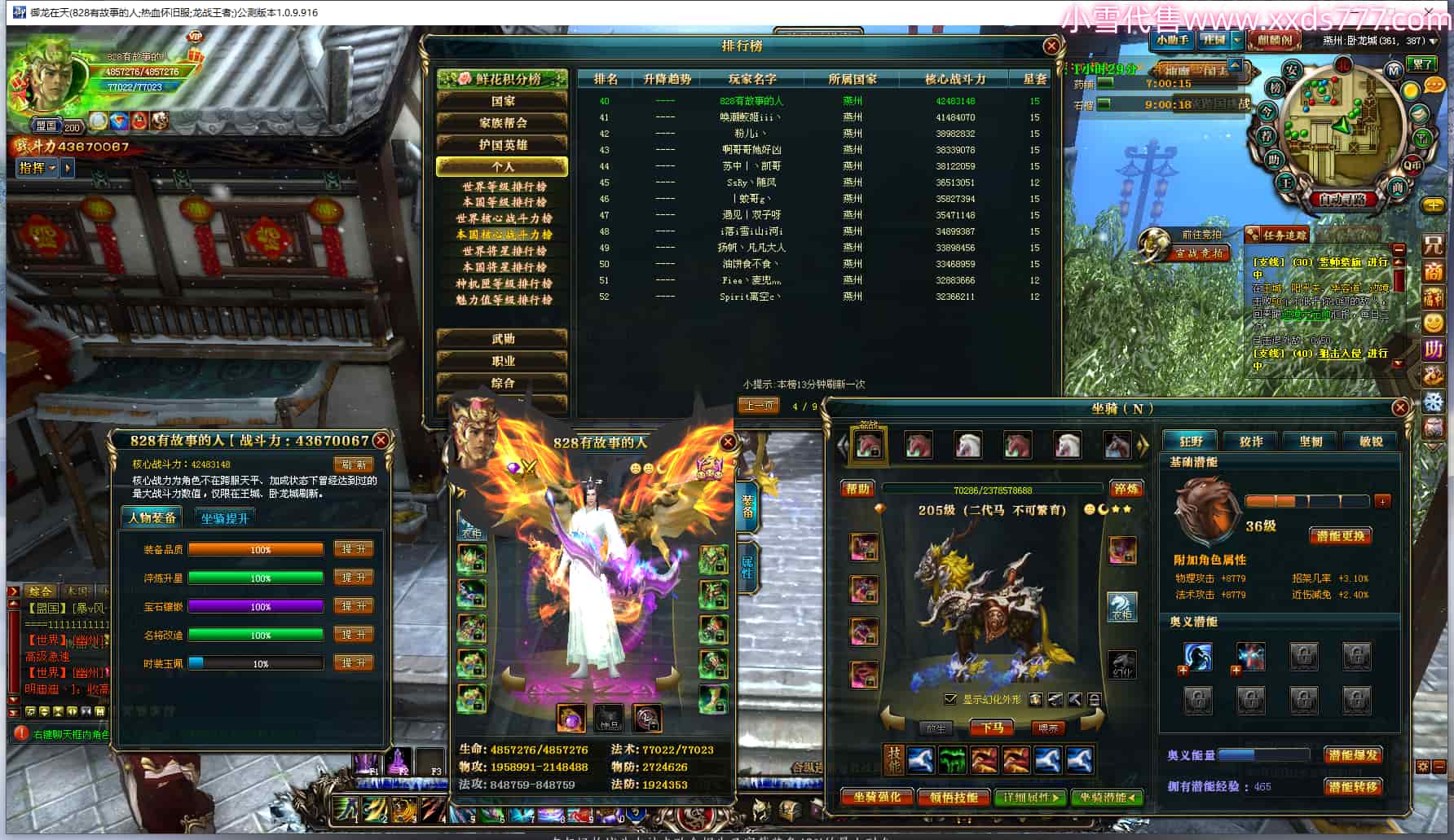 编号L24176 828有故事的人 龙战王者 燕州 本国排名40名 4367W战力 人物黄金加强橙15X(5件混沌) 马普通橙11X 人物绿龙印 马黄龙印 六等单双属性石头 可以转移百分百安全