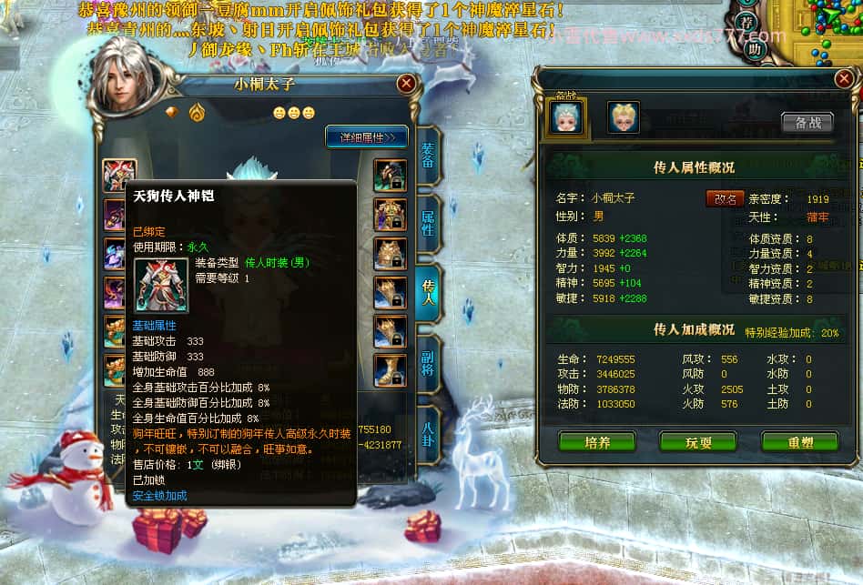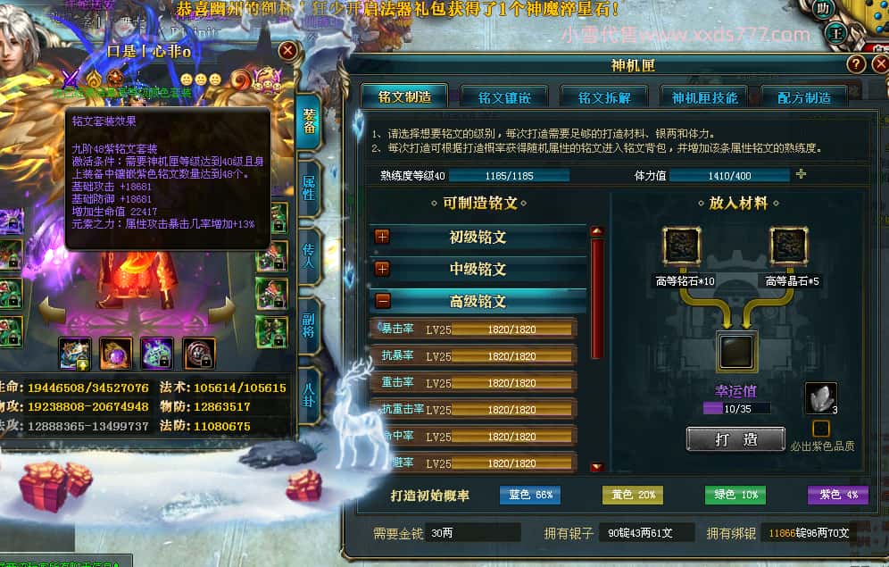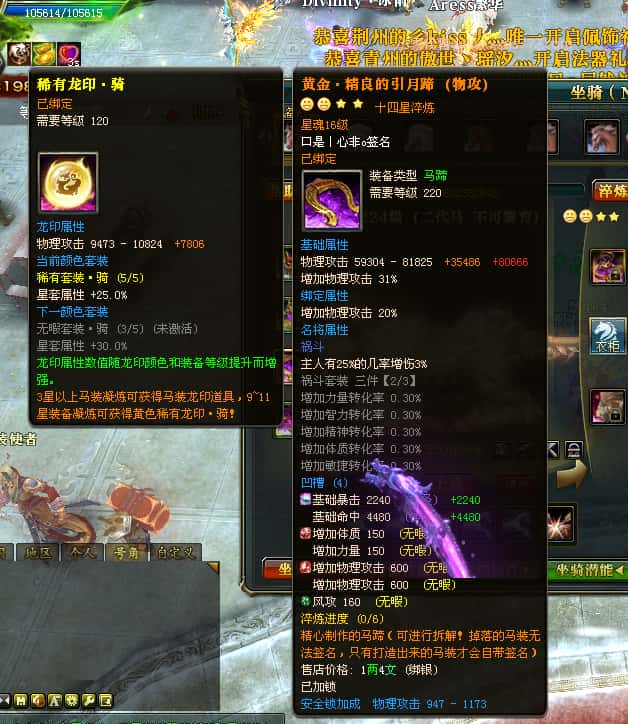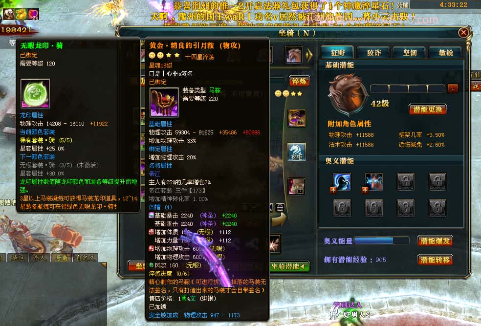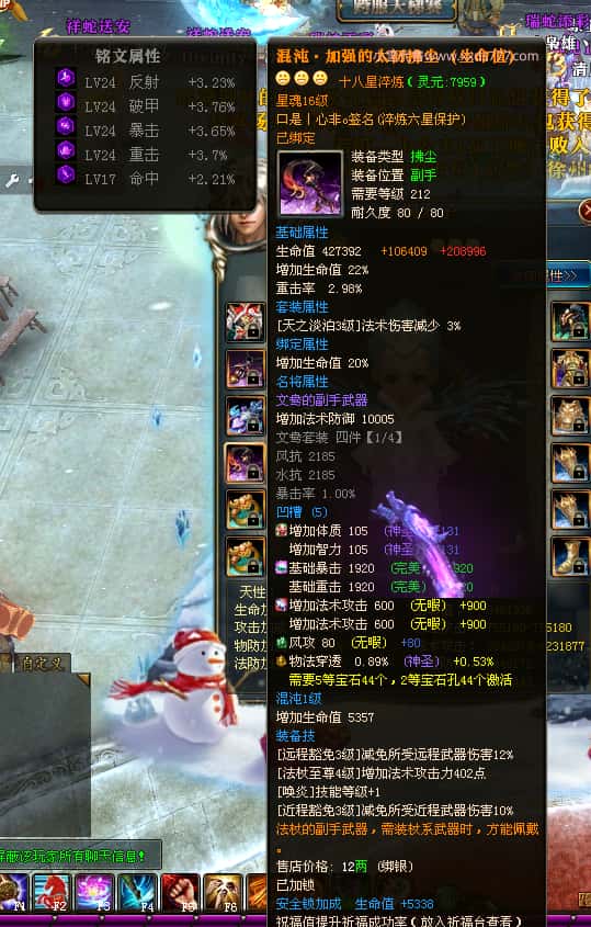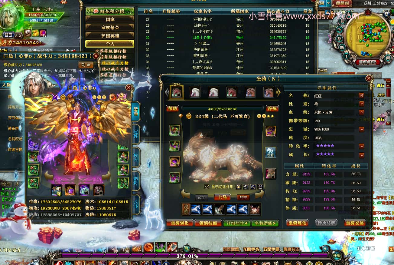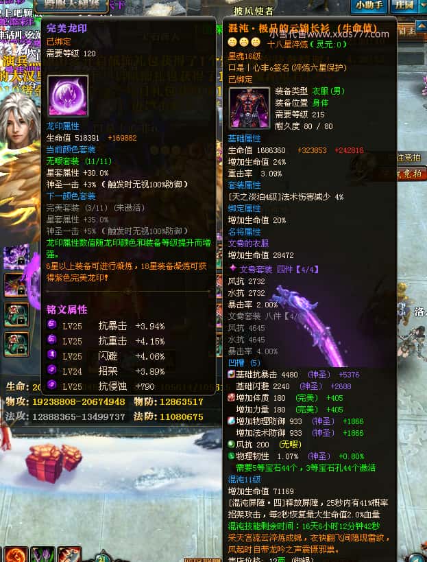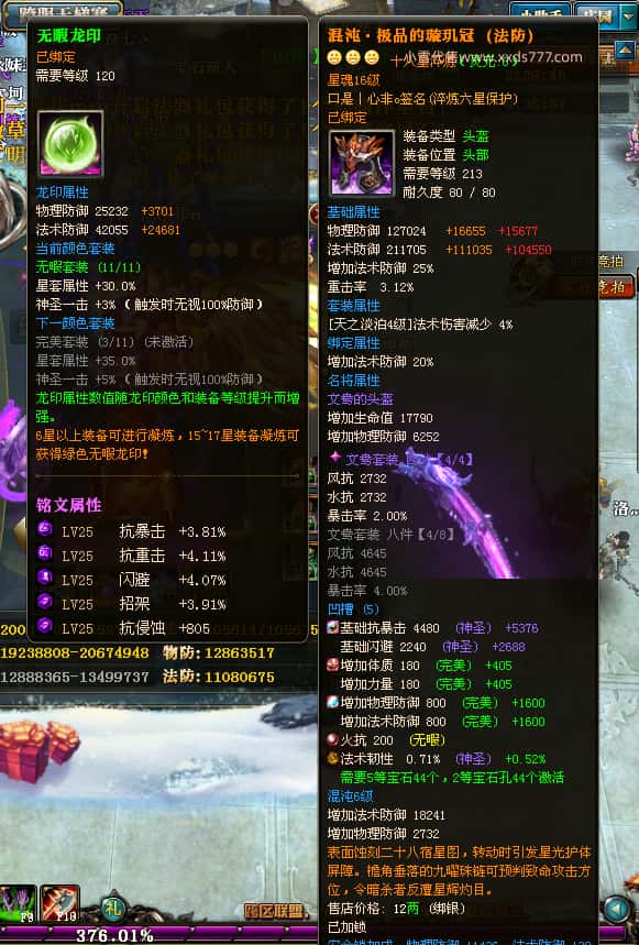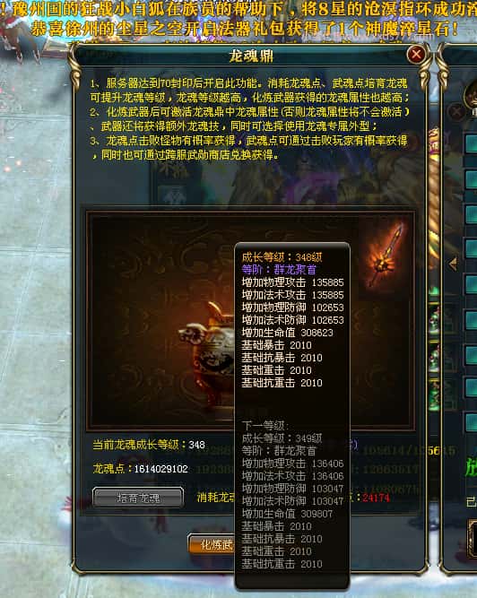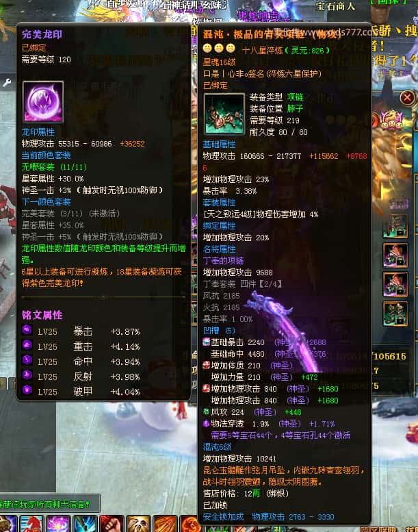 编号W24220 口是丨心非o 龙舞九州 扬州 世界排名30名 34819W战力 人物混沌6级极品橙18X 传人黄金普通橙18X 副将普通橙12X 马黄金精良橙14X(双潜能50级42级) 史诗紫17披风 人物星魂16级 传人星魂16级 副将星魂8级 马星魂16级 人物铭刻18级 点亮18星 马铭刻1件15级其余14级 点亮14星 人物绿龙印(3件紫龙印) 马黄龙印(3件绿龙印) 五六等单双属性神圣完美石头 绿紫孔 可以转移百分百安全
