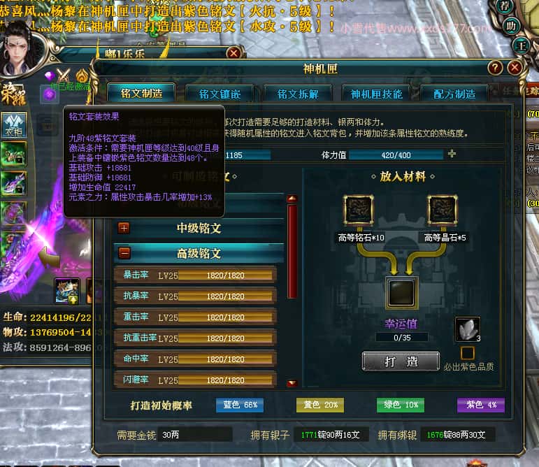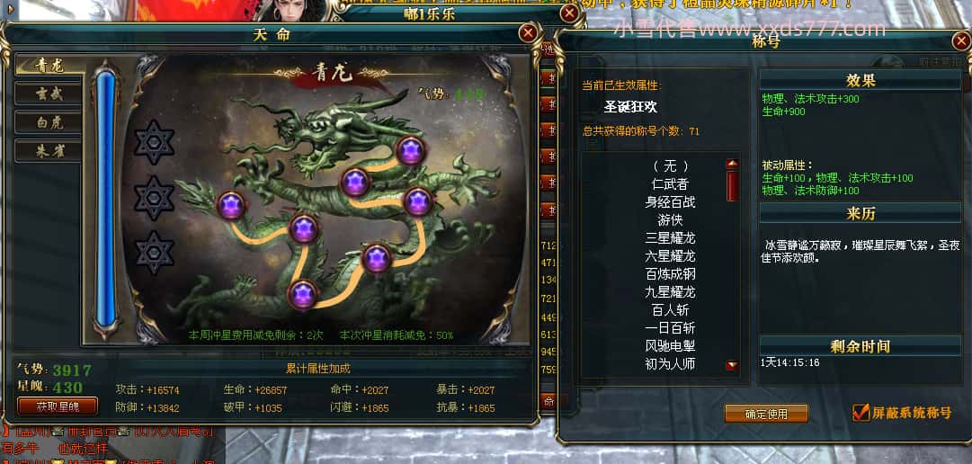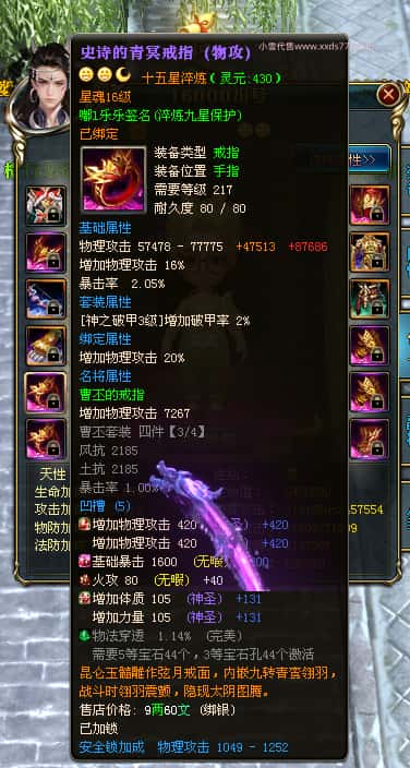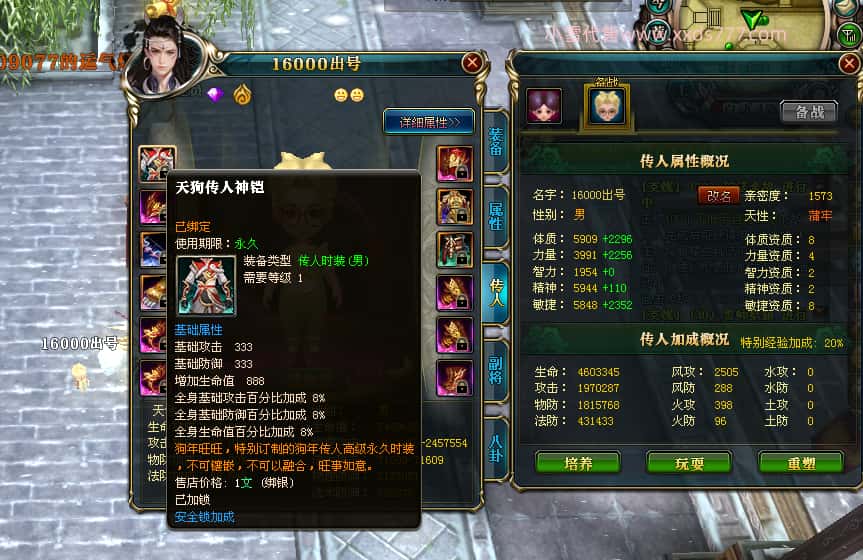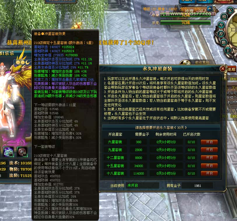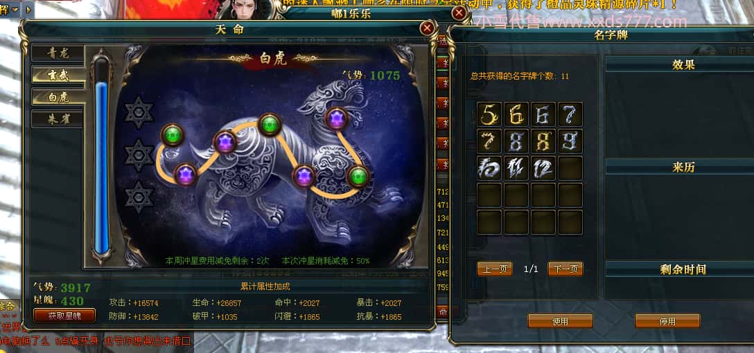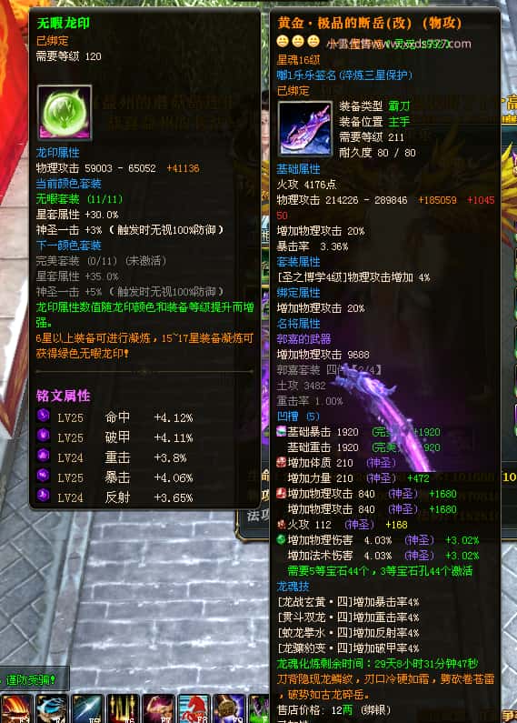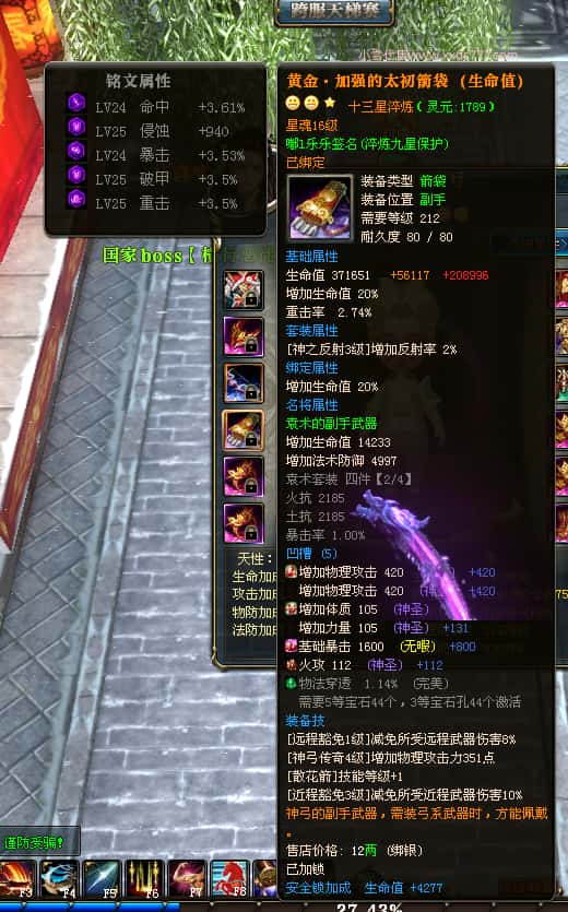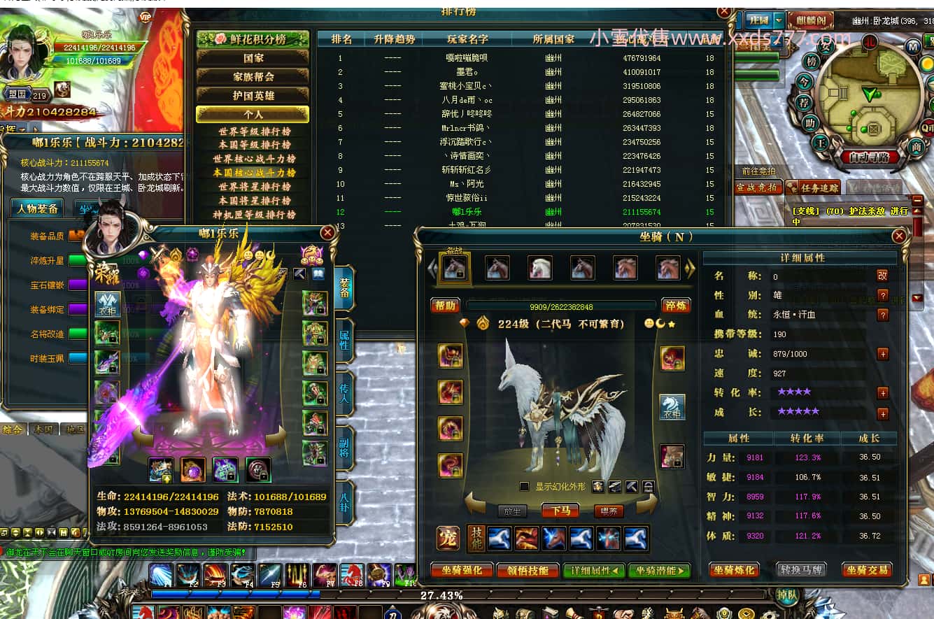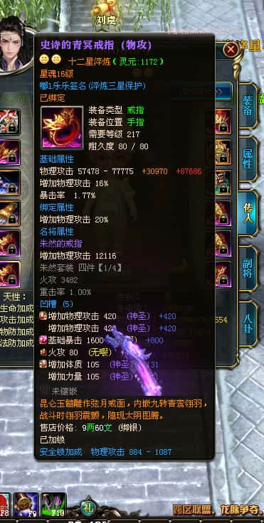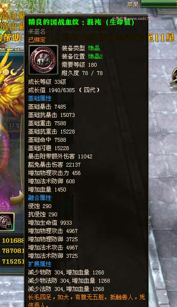 编号T23879 嘟l乐乐 龙腾问鼎 幽州 本国排名7名 21042W战力 人物黄金极品紫15X(武器18X 8件混沌) 传人极品紫12X 副将史诗10X 马普通橙10X 极品紫15披风 人物星魂16级 传人星魂13级 副将星魂6级 马星魂16级 人物铭刻1件17级其余16级 点亮16星 马铭刻15级 点亮12星 人物绿龙印 马黄龙印 五六等单双属性完美神圣石头 黄绿孔 可以转移百分百安全