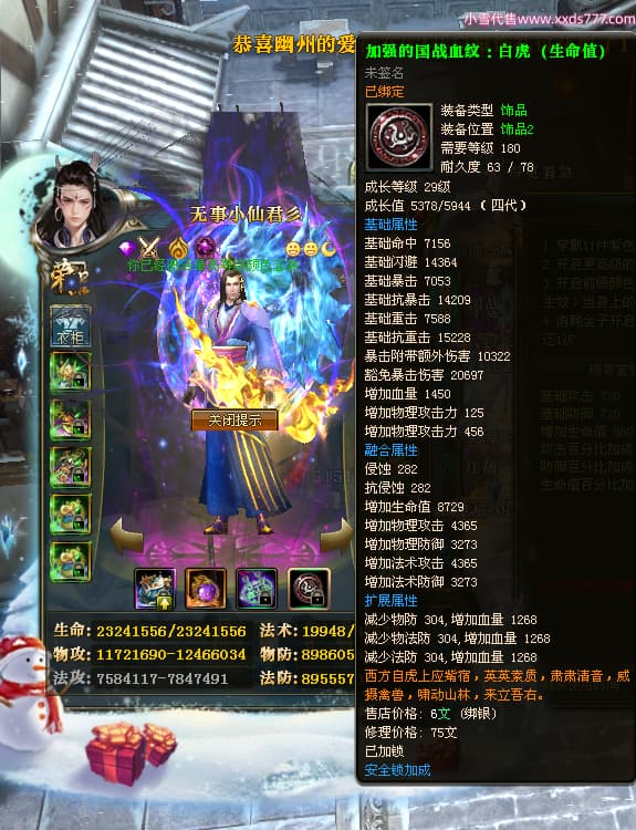 编号W24244 无事小仙君彡 龙舞九州 青州 本国排名28名 19755W战力 人物黄金普通橙15X(1件18X3件混沌) 传人精良紫15X 副将精良紫12X 马史诗紫13X 精良紫15披风 人物星魂16级 传人星魂10级 副将星魂6级 马星魂14级 人物铭刻15级 人物点亮16星 马铭刻13级 点亮14星 人物绿龙印 马黄龙印 五六等单双属性完美无暇神圣石头 蓝黄绿孔 已开完永久18星套
