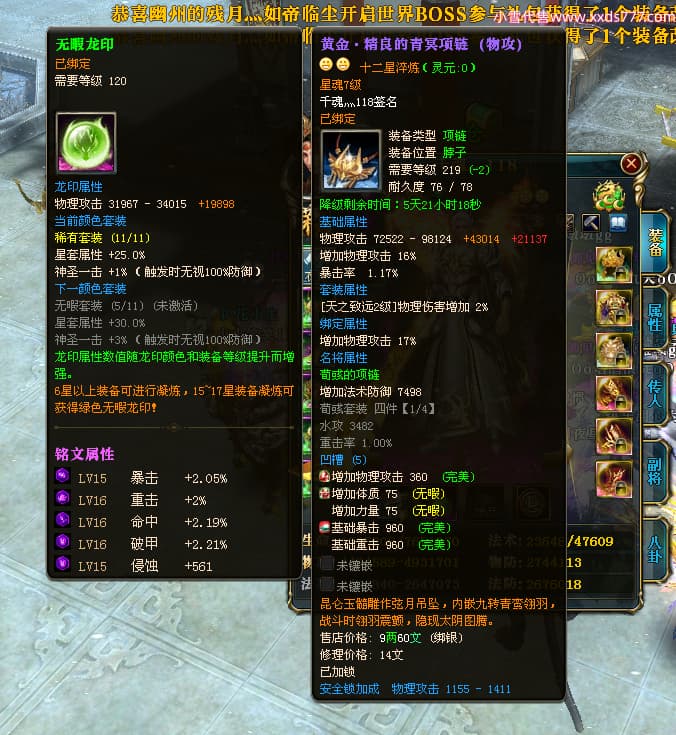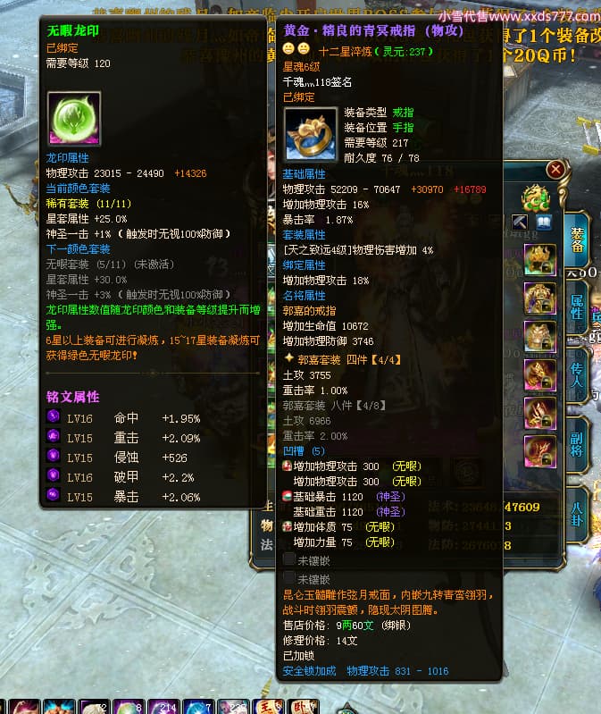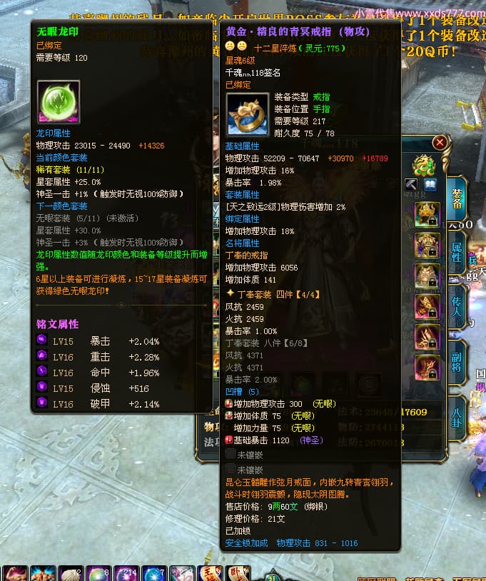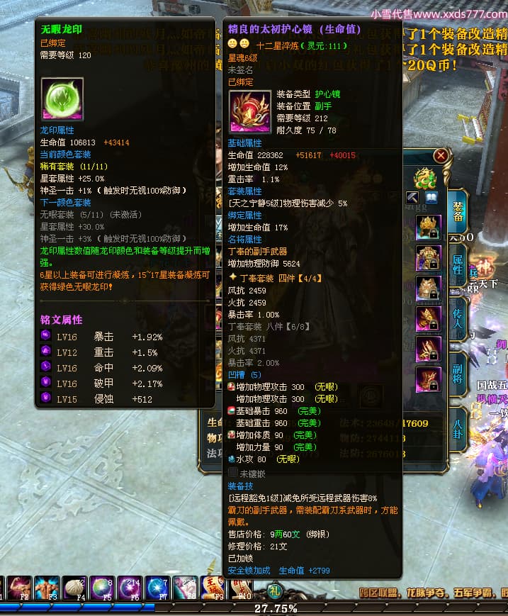 编号X24246 千魂灬118 龙啸风云 青州 5229W战力 人物加强紫12X(1件17X) 传人普通紫12X 副将精良紫12X 马加强紫9X 人物星魂4级 人物铭刻12级 人物点亮12星 马铭刻9级 点亮10星 人物黄龙印(5件绿龙印) 马黄龙印 五等单双属性神圣完美优秀石头
