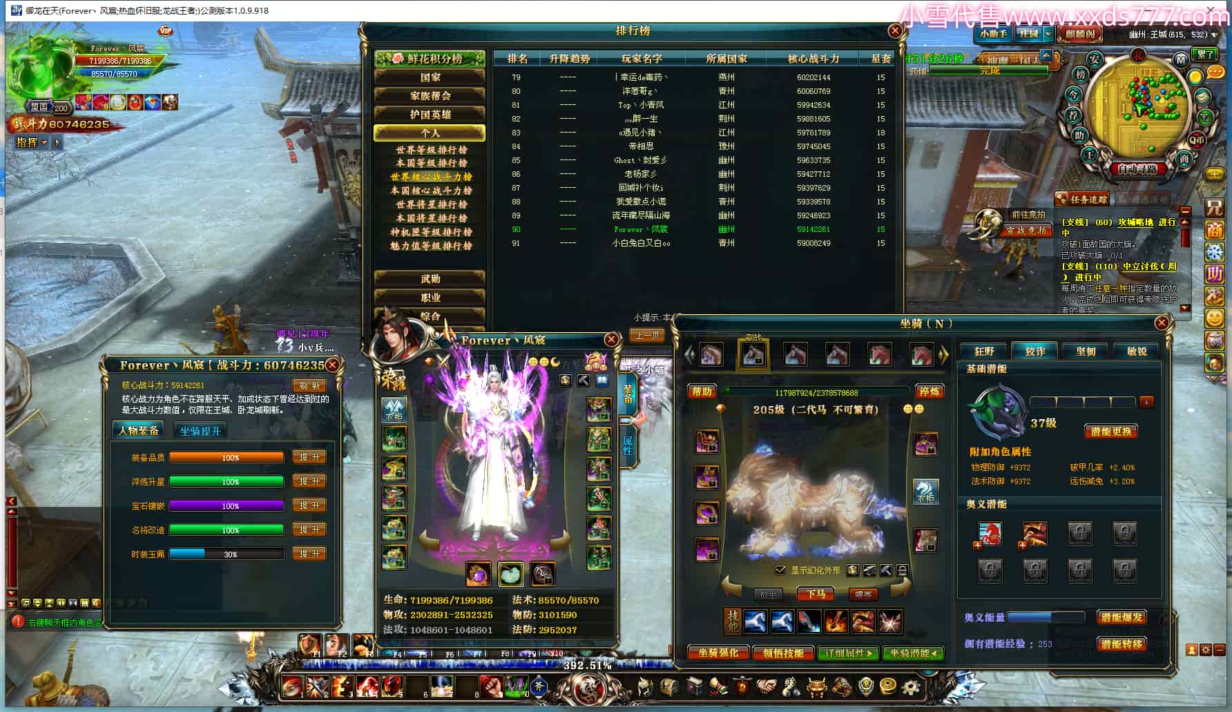 编号L24247 Forever丶风宸 龙战王者 幽州 世界排名90名 6074W战力 人物黄金极品橙15X(7件混沌) 马黄金极品橙12X 人物绿龙印 马黄龙印 六等单双属性石头 可以转移百分百安全