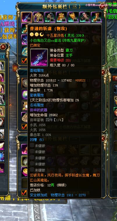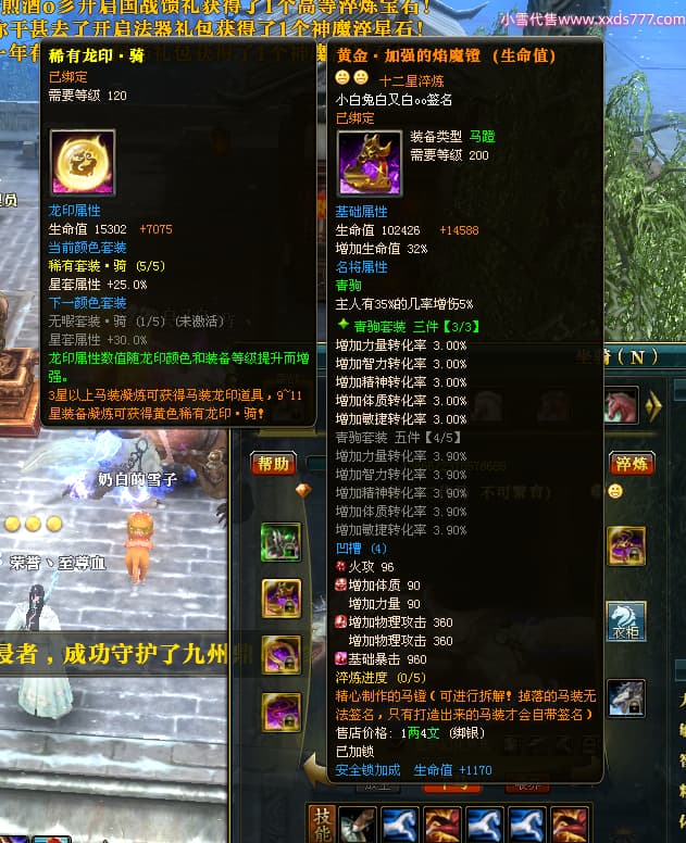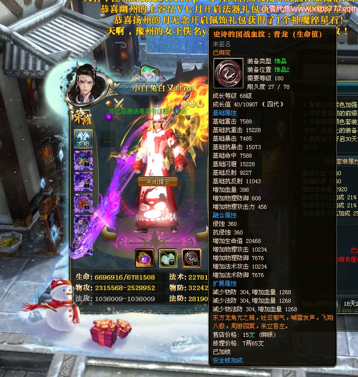编号L24252 小白兔白又白oo 龙战王者 青州 世界排名91名 5943W战力 人物黄金精良橙15X(1件18X8件混沌) 马黄金加强橙12X 人物绿龙印(6件紫龙印) 马黄龙印(1件绿龙印) 六等单双属性石头 已开1次永久15星套