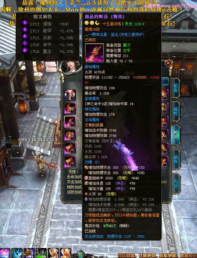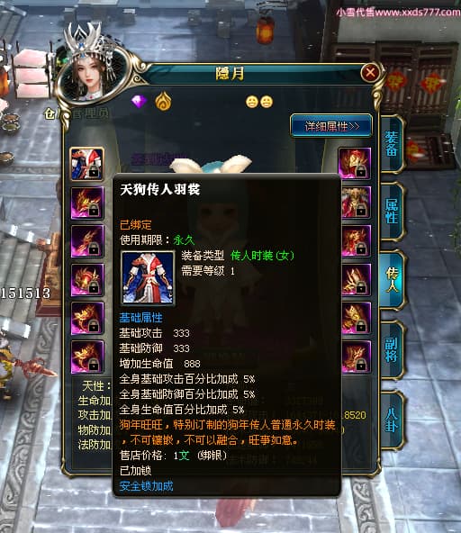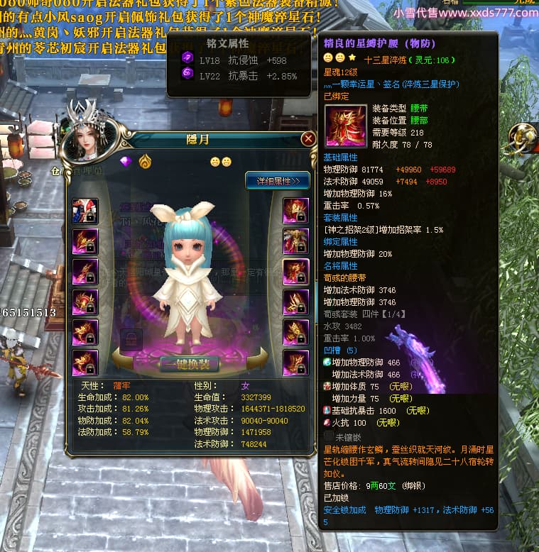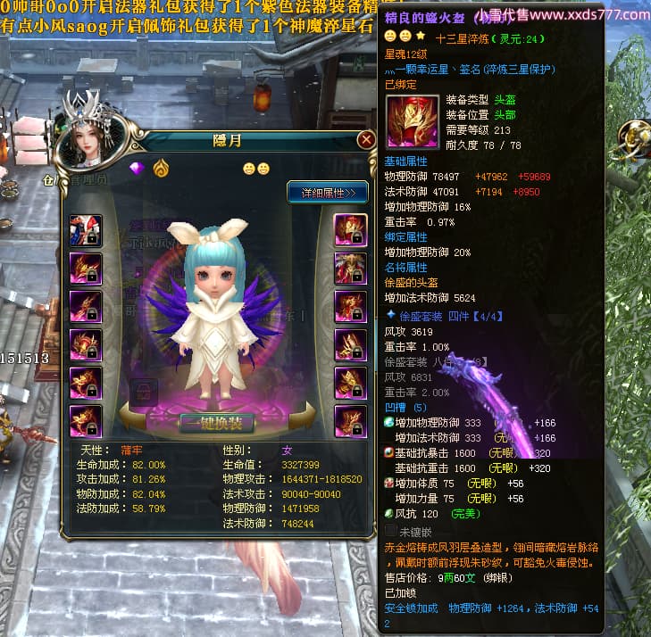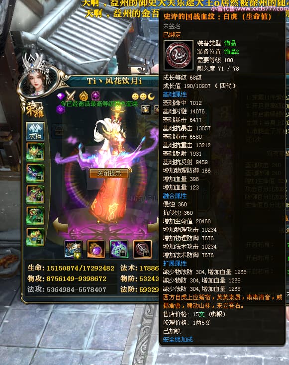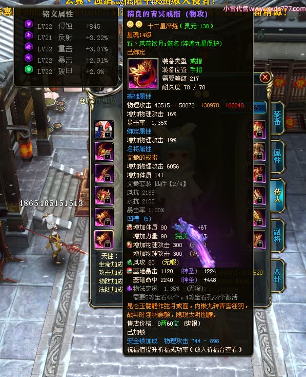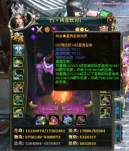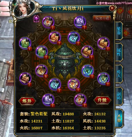 编号W24262 Ti丶风花饮月i 龙舞九州 青州 本国排名72名 13188W战力 人物黄金普通橙15X(6件混沌) 传人加强紫12X 副将精良紫12X 马史诗紫10X 精良紫15披风 人物星魂16级 传人星魂12级 副将星魂6级 马星魂12级 人物铭刻15级 人物点亮3件16星其余14星 马铭刻12级 点亮1件12星其余10星 人物绿龙印 马黄龙印 五六等单双属性完美无暇神圣石头 蓝黄孔