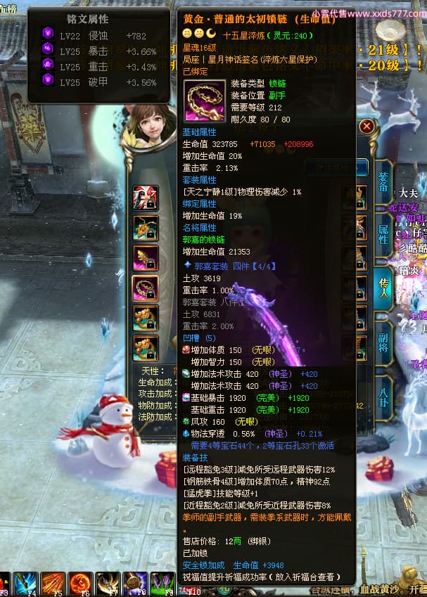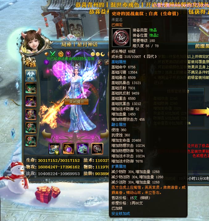 编号T24290 局座丨星月神话 龙腾问鼎 荆州 世界排名57名 29300W战力 人物混沌极品橙15X(4件18X) 传人黄金普通橙15X 副将史诗紫12X 马黄金精良橙13X(双潜能50级28级) 极品紫16披风 人物星魂16级 传人星魂16级 副将星魂6级 马星魂16级 人物铭刻2件18级3件16级其余15级 人物点亮1件18星其余16星 马铭刻13级 点亮14星 人物绿龙印 马黄龙印(3件绿龙印) 六等单双属性神圣完美石头 黄绿孔 已开2次永久15星套