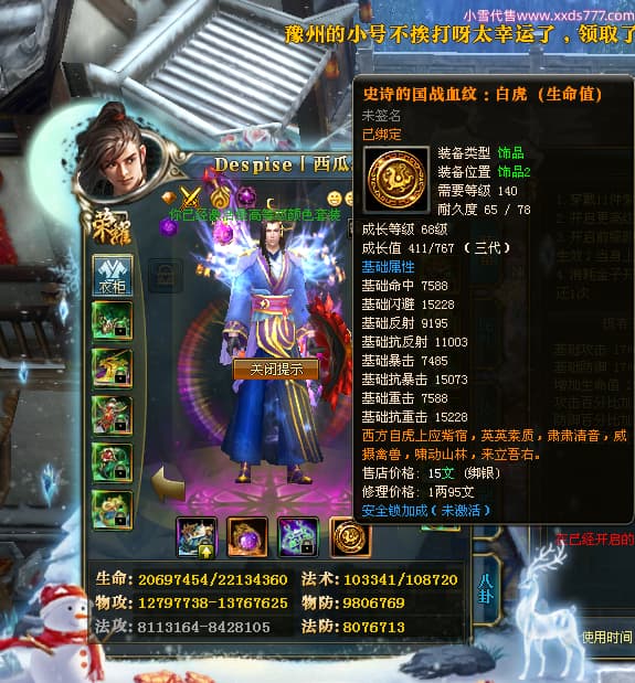 编号Z24305 Despise丨西瓜a 逐鹿天下 燕州 本国排名第15名 21225W战力 人物黄金加强橙15X(1件17X2件16X6件混沌) 传人史诗紫12X 副将史诗紫12X 马普通橙12X 极品紫16披风 人物星魂16级 传人10级 副将6级 马星魂16级 人物铭刻1件16级其余15级 点亮16星 马铭刻12级 点亮12星 人物绿龙印 马黄龙印 六等单双属性神圣完美无暇石头 黄绿孔 已开启永久15星套