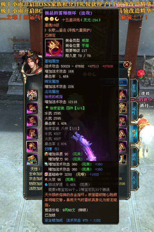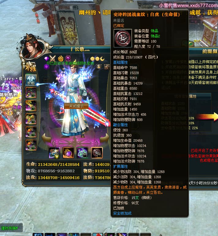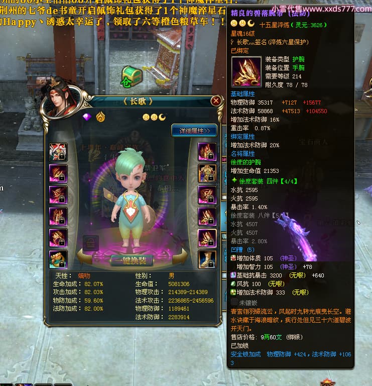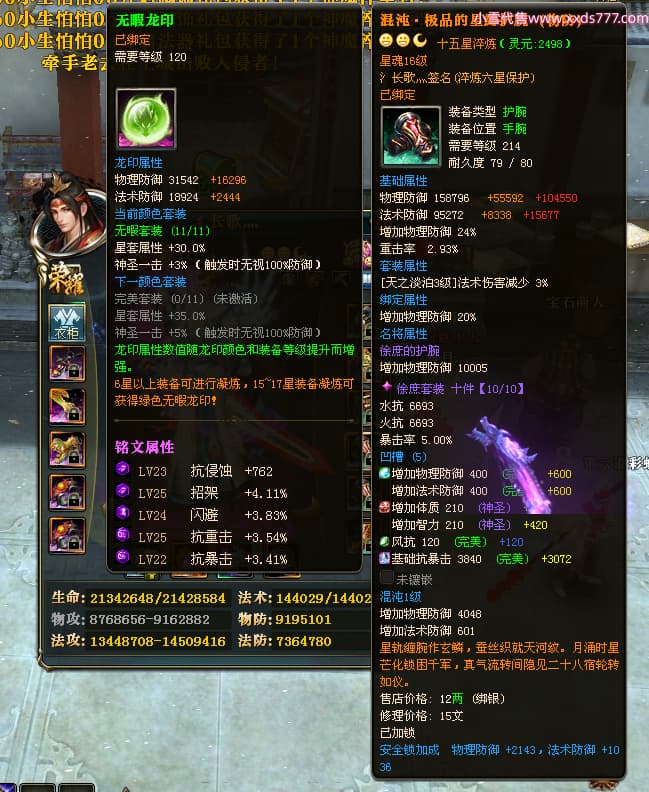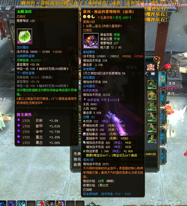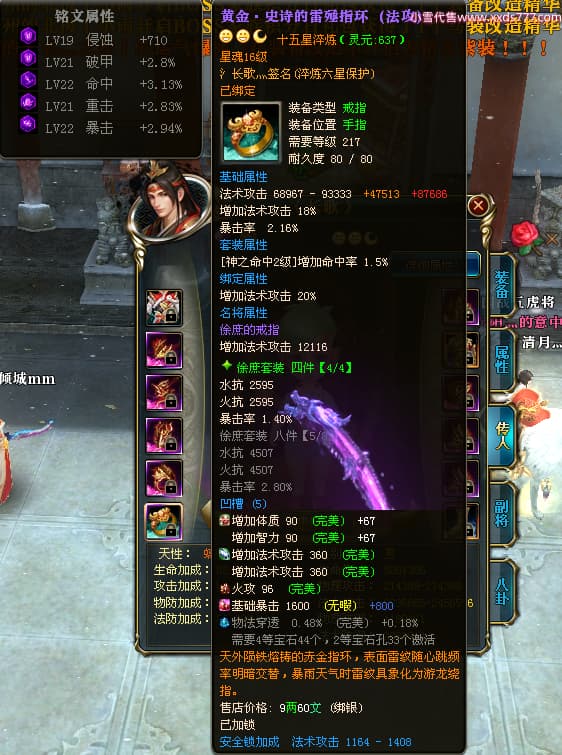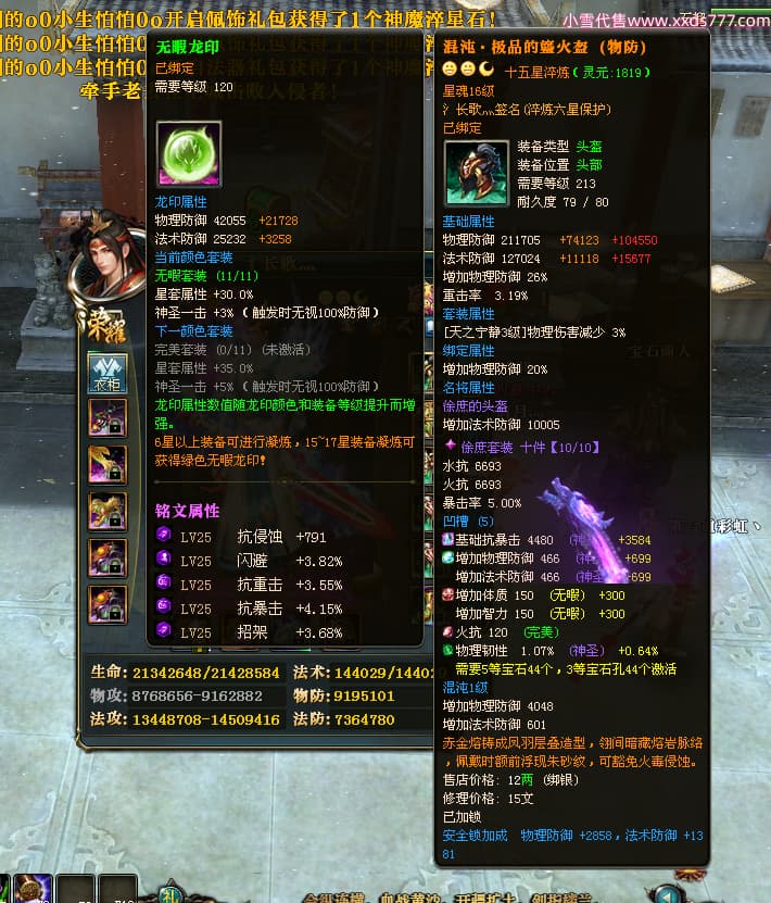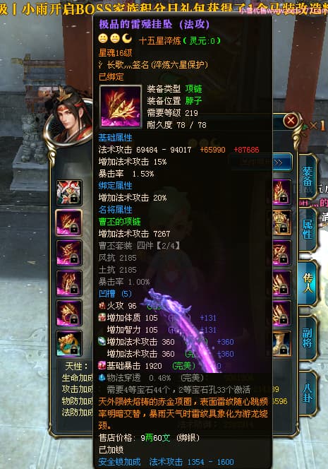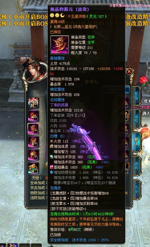 编号W24333 氵长歌灬 龙舞九州 青州 本国排名24名 21251W战力 人物黄金极品橙15X(7件混沌) 传人精良紫15X 副将精良紫15X 马普通橙12X(双潜能50级15级) 极品紫15披风 人物星魂16级 传人星魂16级 副将星魂6级 马星魂14级 人物铭刻15级 人物点亮16星 马铭刻1件14级1件13级其余12级 点亮12星 人物绿龙印 马黄龙印(1件绿龙印) 六等单双属性完美无暇神圣石头 黄绿孔