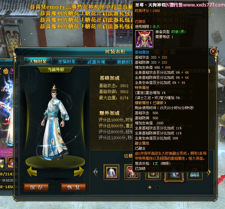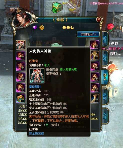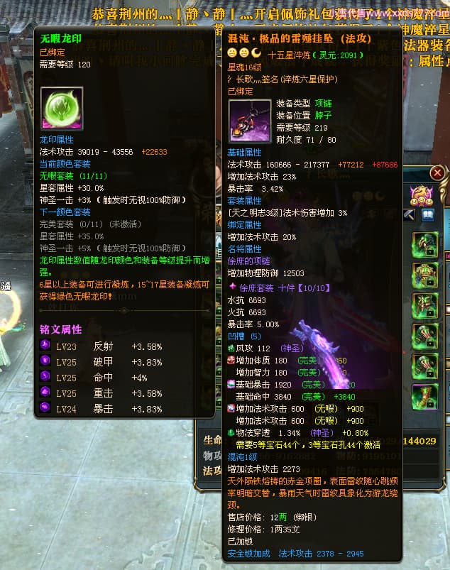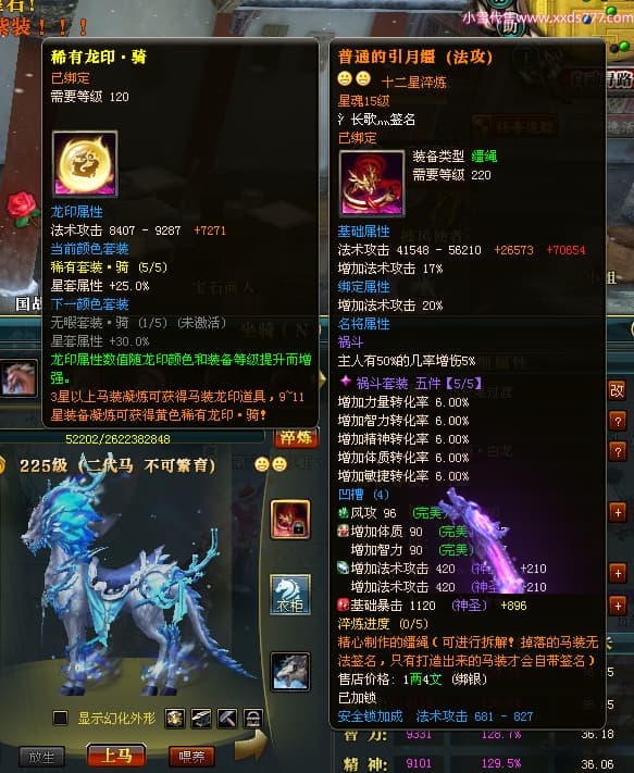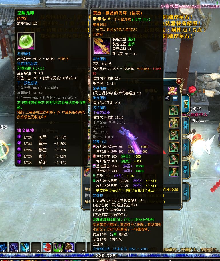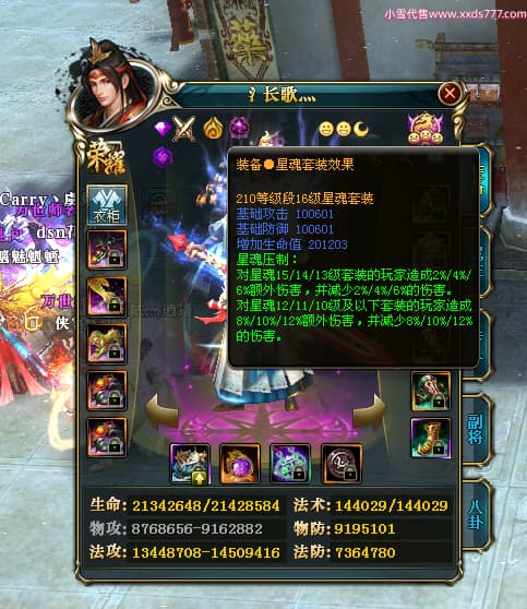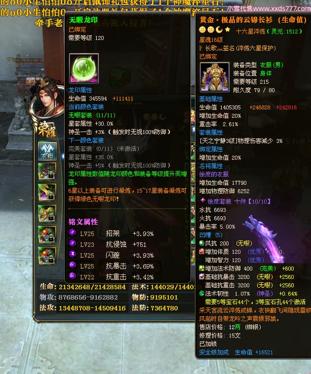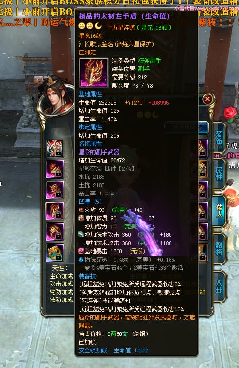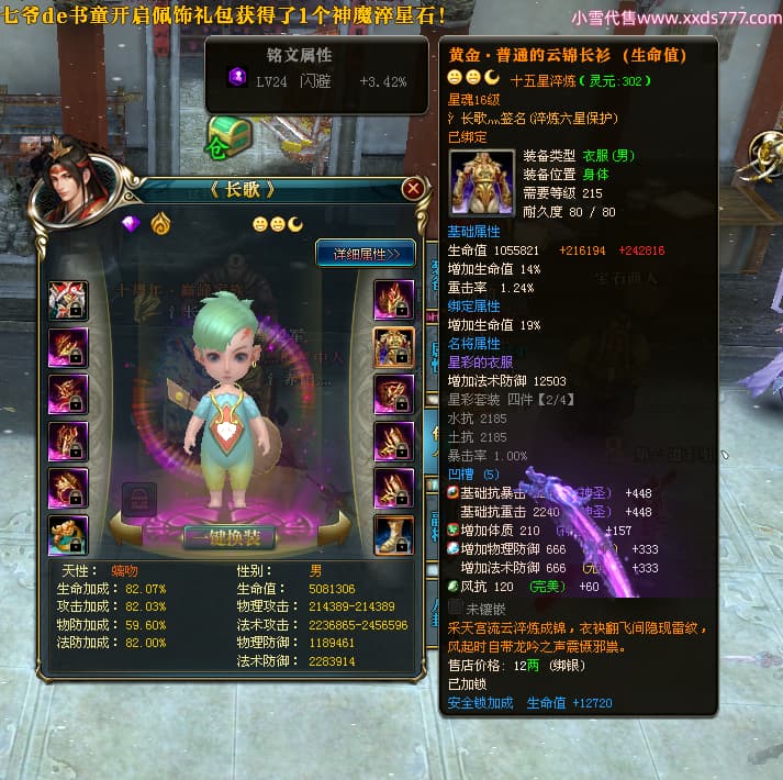编号W24333 氵长歌灬 龙舞九州 青州 本国排名24名 21251W战力 人物黄金极品橙15X(7件混沌) 传人精良紫15X 副将精良紫15X 马普通橙12X(双潜能50级15级) 极品紫15披风 人物星魂16级 传人星魂16级 副将星魂6级 马星魂14级 人物铭刻15级 人物点亮16星 马铭刻1件14级1件13级其余12级 点亮12星 人物绿龙印 马黄龙印(1件绿龙印) 六等单双属性完美无暇神圣石头 黄绿孔