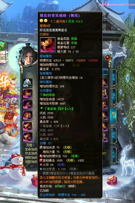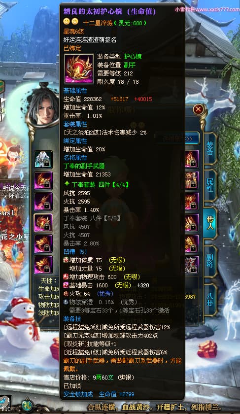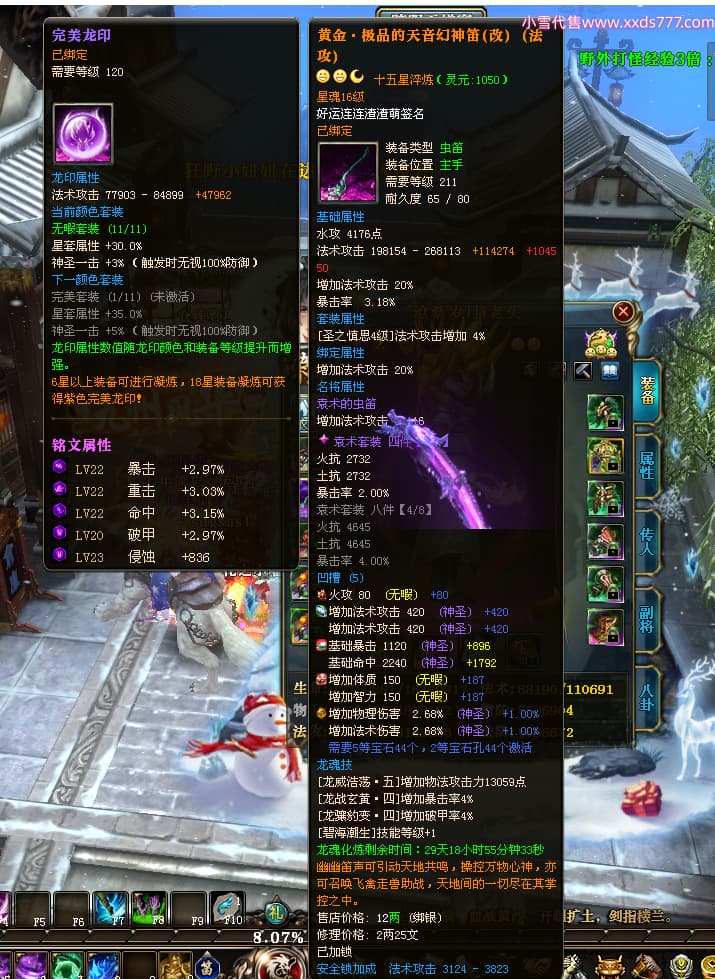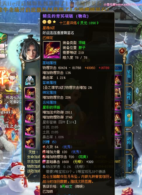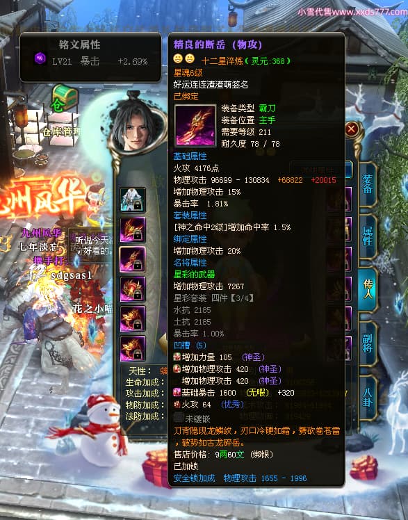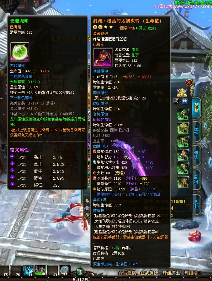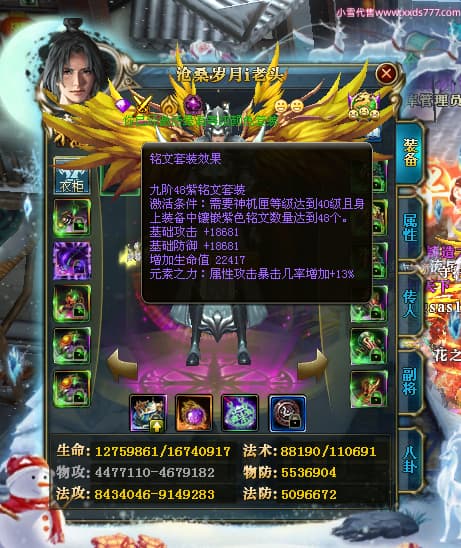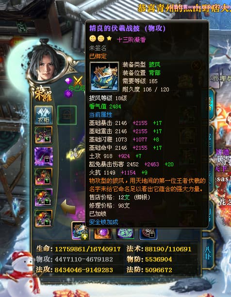 编号T24361 沧桑岁月i老头 龙腾问鼎 燕州 本国排名60名 13117W战力 人物黄金史诗紫12X(1件18X1件15X8件混沌) 传人精良紫12X 副将精良紫12X 马极品紫9X 精良紫13披风 人物星魂14级 传人星魂6级 副将星魂6级 马星魂10级 人物铭刻5件15级其余14级 人物点亮3件116星其余14星 马铭刻12级 点亮10星 人物绿龙印(1件紫龙印) 马黄龙印 五六等单双属性神圣完美石头 黄蓝孔