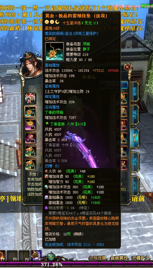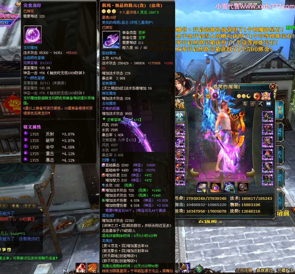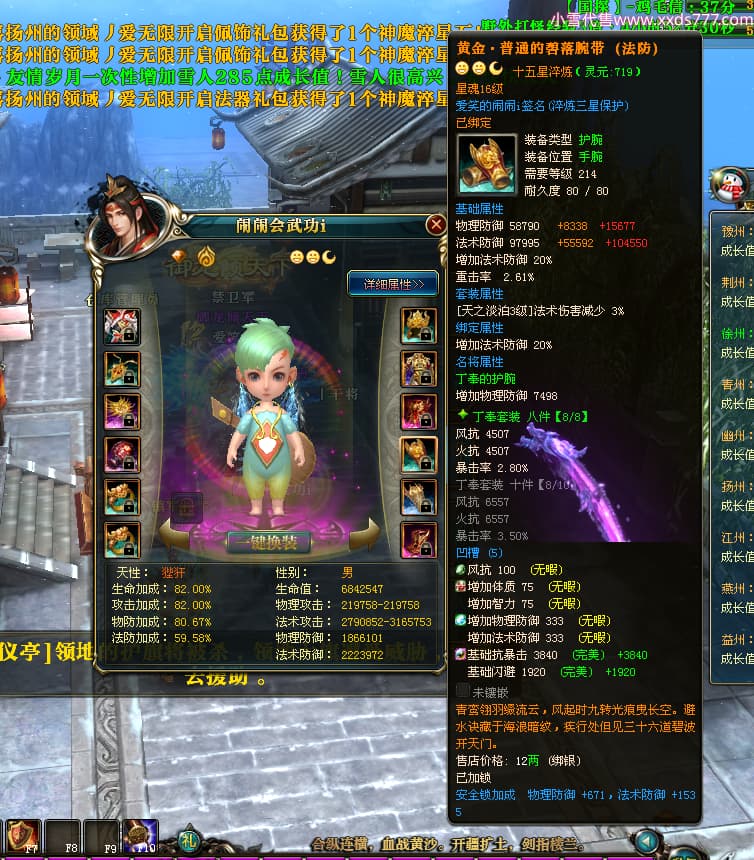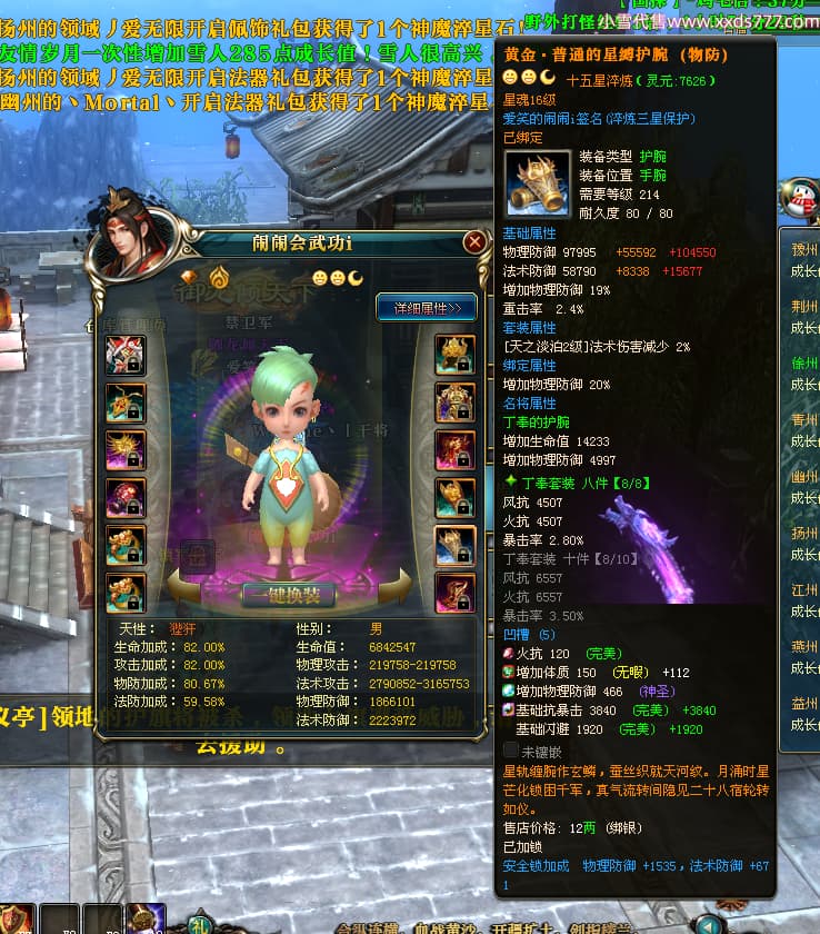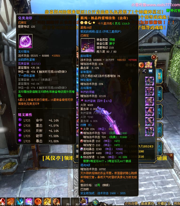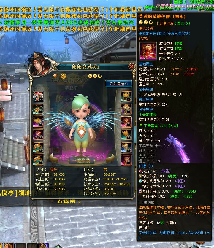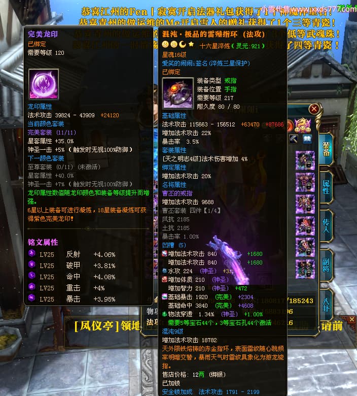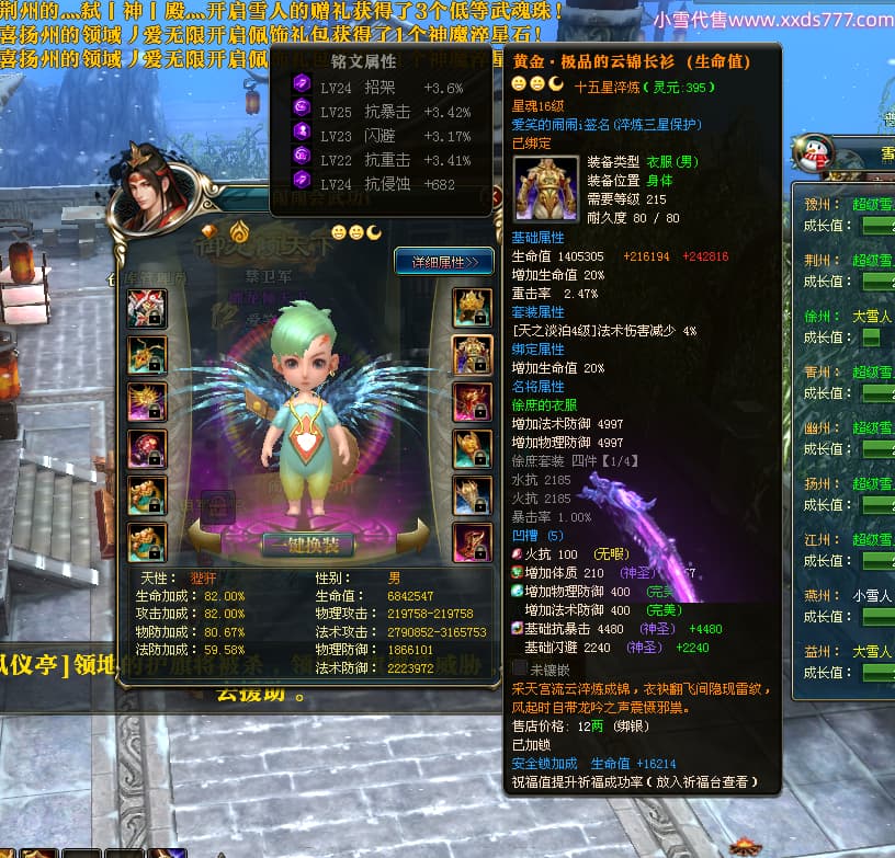 编号W24363 爱笑的闹闹i 龙舞九州 徐州 世界排名35名 32244W战力 人物混沌极品橙15X(1件18X) 传人黄金普通橙15X 副将史诗紫12X 马黄金精良橙13X(双潜能57级54级) 史诗紫17披风 人物星魂16级 传人星魂16级 副将星魂13级 马星魂16级 人物铭刻1件18级4件16级其余15级 点亮1件18星其余16星 马铭刻13级 点亮14星 人物紫龙印 马绿龙印 六等单双属性神圣完美无暇石头 黄绿紫孔 已开启永久18星套