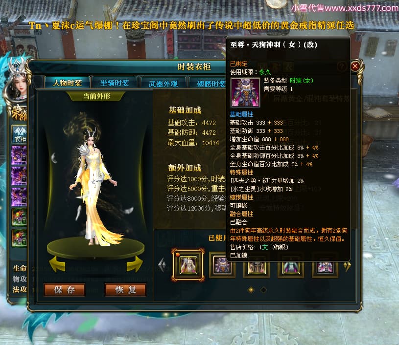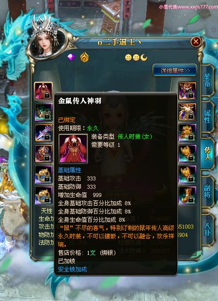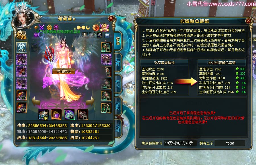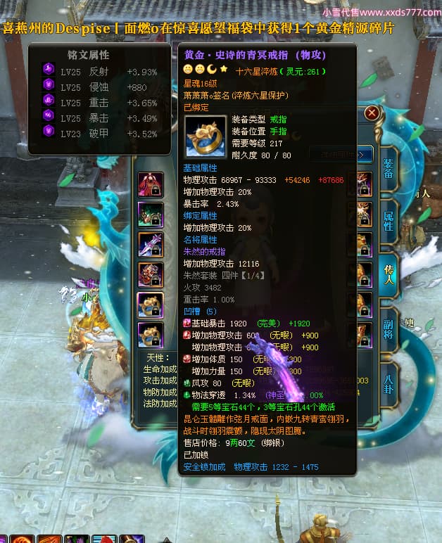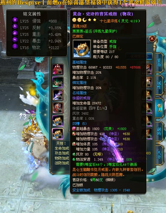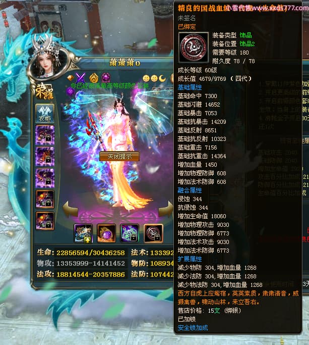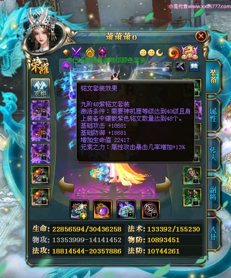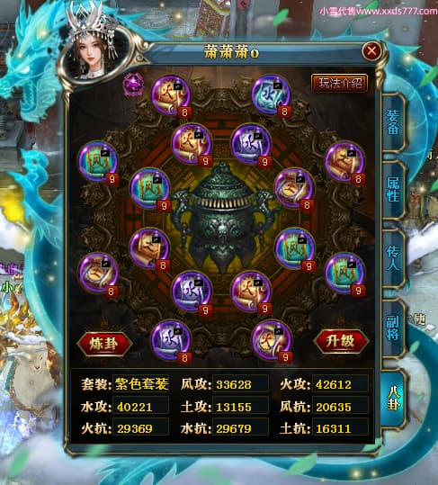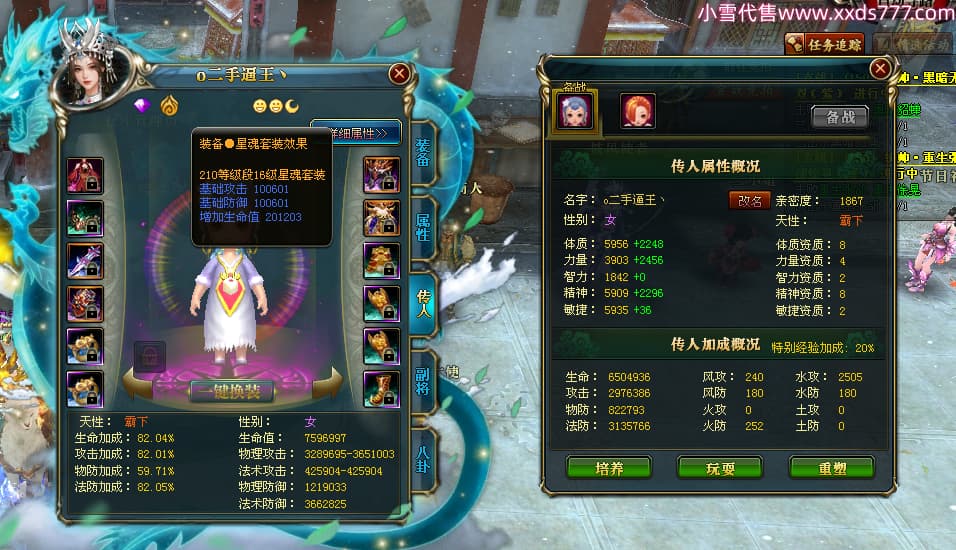 编号Z24374 萧萧萧o 逐鹿天下 荆州 世界排名17名 32356W战力 人物混沌精良橙15X(2件18X) 传人黄金史诗紫15X(5件18X) 副将精良紫15X 马黄金精良橙13X(双潜能53级50级) 史诗紫17披风 人物星魂16级 传人星魂16级 副将星魂11级 马星魂16级 人物铭刻2件18级1件17级其余16级 人物点亮2件18星其余16星 马铭刻1件14级其余13级 点亮14星 人绿龙印(4件紫龙印) 马绿龙印 六等单双属性神圣完美无暇石头 绿紫孔 已开启永久18星套