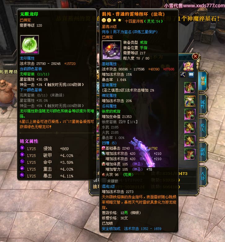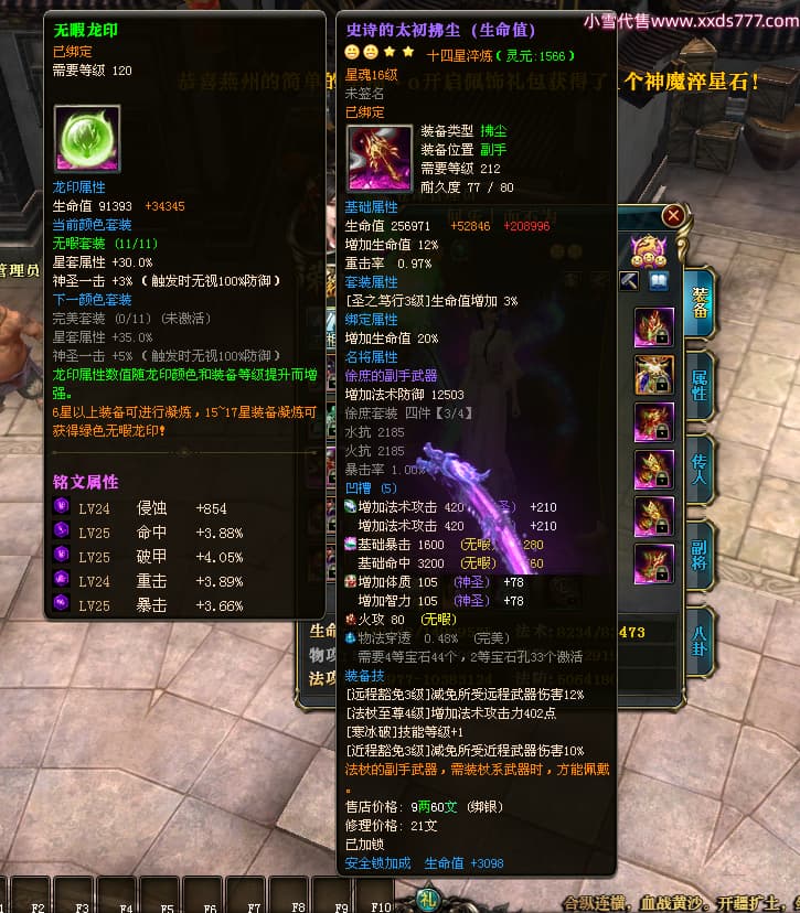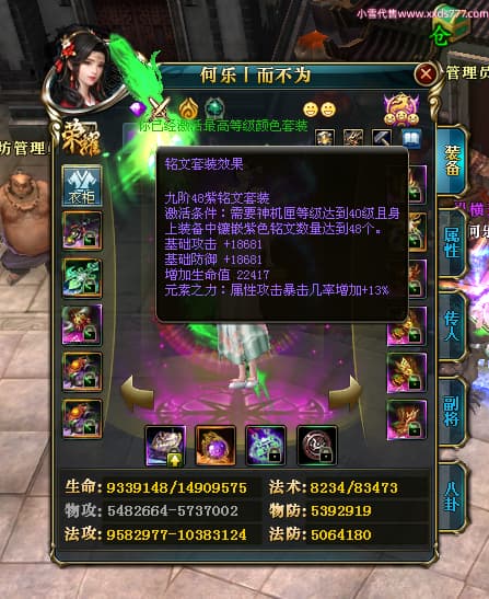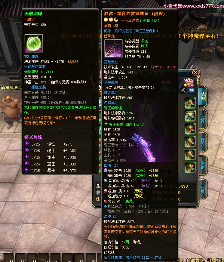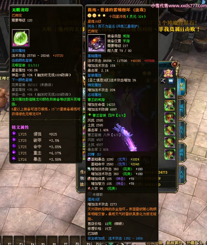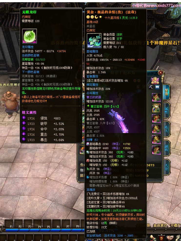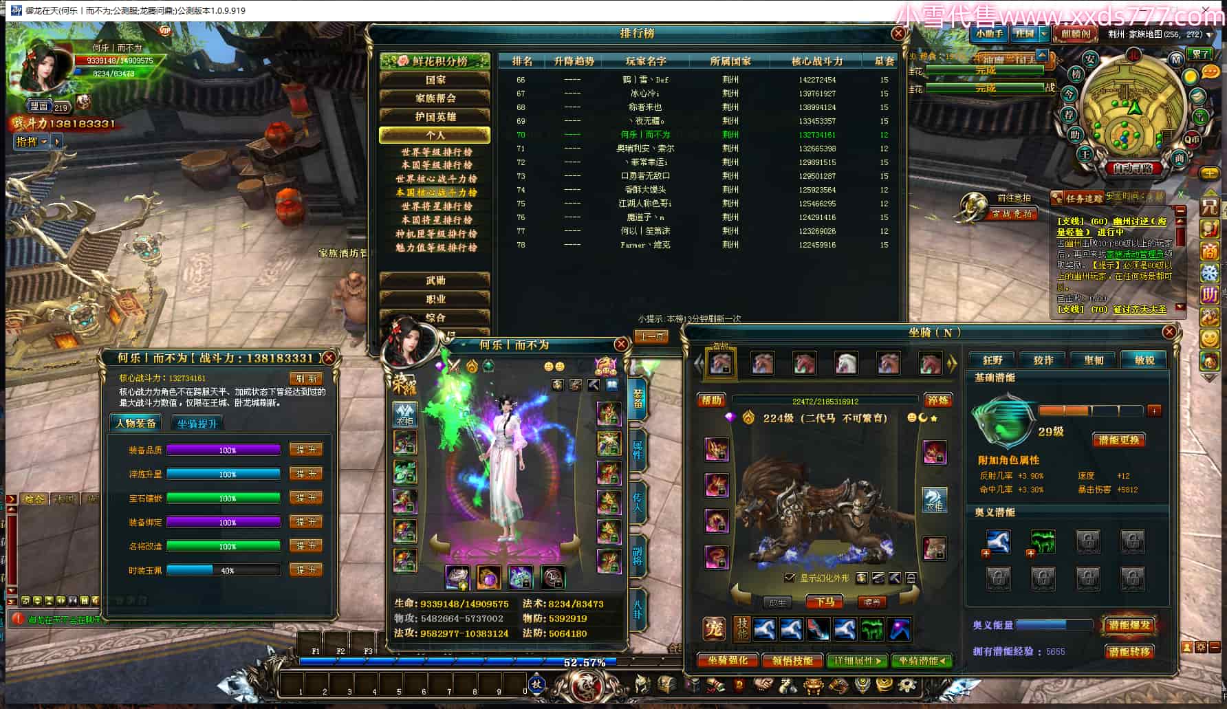 编号T24383 何乐丨而不为 龙腾问鼎 荆州 本国排名70名 13818W战力 人物极品紫14X(2件15X3件混沌) 传人精良紫14X 副将精良紫12X 马史诗紫10X 精良紫14披风 人物星魂16级 传人星魂9级 副将星魂6级 马星魂10级 人物铭刻14级 点亮14星 马铭刻12级 点亮10星 人物绿龙印 马黄龙印 五六等单双属性完美神圣石头 可以转移百分百安全